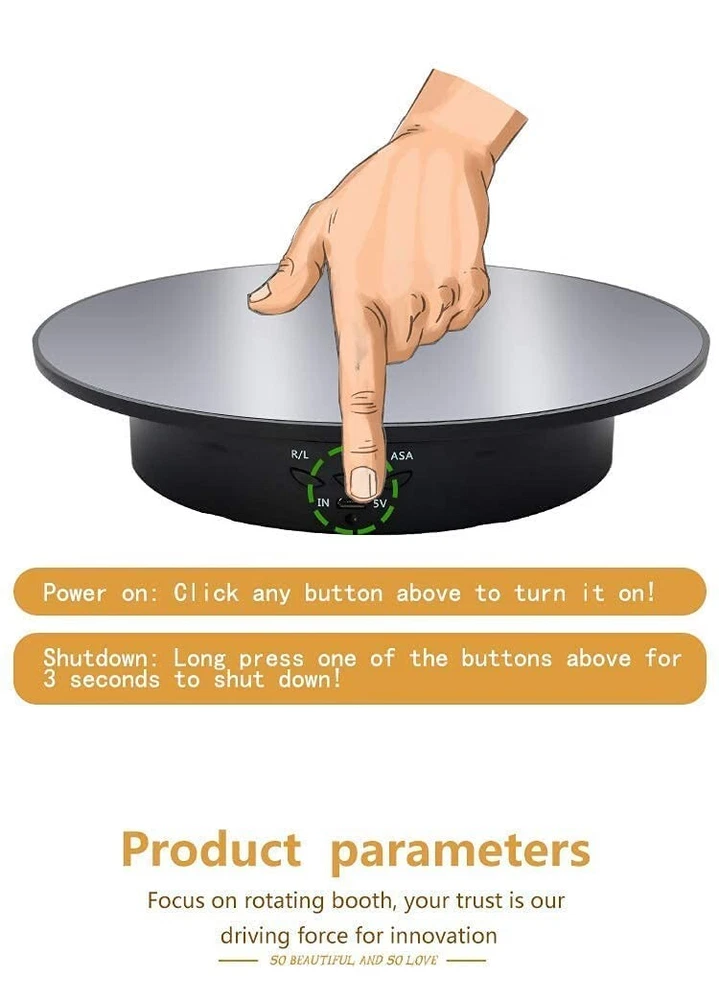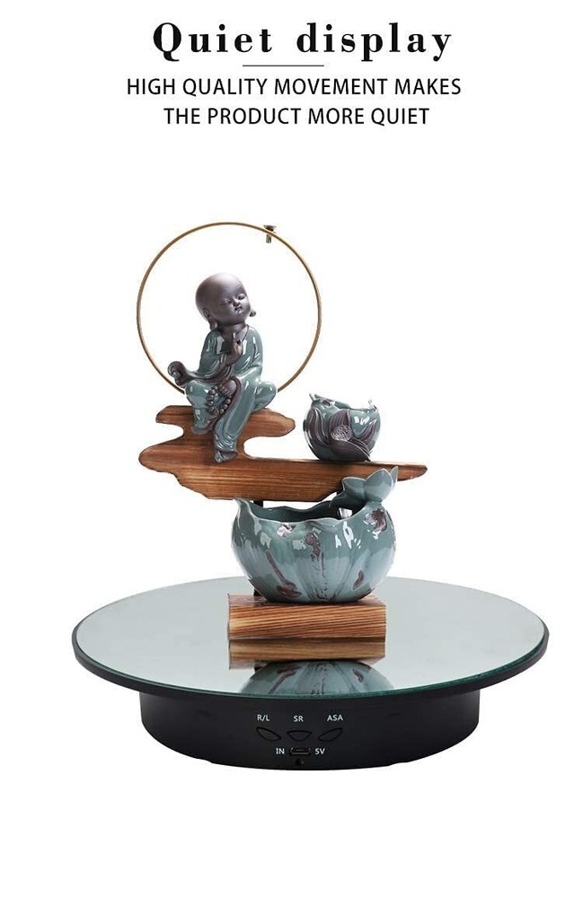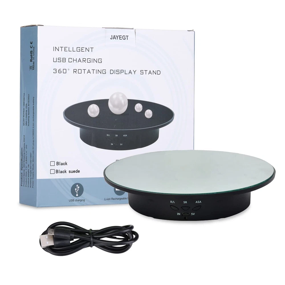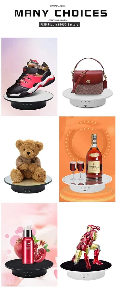 Motorized Rotating Display Stand, 7.87inch /17.6lbs Load, 360 Degree Electric Rotating Turntable for Photography Products, Jewelry, Cake,3D Model, Mirror Cover (Black) About this item Wide Application:the rotating display stand perfect for display Jewelry, Watch, Digital Product, Bag, Models, Jewelry, Collectibles, propitious to shops, Studio, schools library, exhibition halls, living rooms and other venues. Controltable speed,adjustable direction & angle. ①R/L rotates clockwise 360degree rotating or counter clockwise 360 degree rotating. ②SR 2 gear speed regulation is 1-2 revolutions per minute. ③ASA can adjust the rotation angle ,automatically rotating back and forth 90-180°and Turntable rotates one round speed: 8 / 15 / 30 / seconds. you can adjust according to various demands.Boot up: click any one of the buttons to open ,Power off :any long press one of the buttons for 3 seconds to shut down Wireless Using! YOU COULD USE IT ANYWHERE! Two power supply modes: USB cable and built-in Rechargeable battery operated rotating. you could take it outdoors or anywhere to complete your photography, No more worrying about finding a socket or being tethered to a specific location. Turntable Diameter 7.87" /20cm * height 4cm, lightweight 0.4kg.Max load17.6lbs/ 8KG, Package including 1*Rotating display stand,1* USB cable, 1* user manual . The Electric photography turntable offers a good stability and load bearing capacity. is perfect to 360 degrees display or sell products in your Live video. No Standalone lithium batteries are sold with the product. (Item does not ship to Miami&Doral, FL), have any problem please contact us !