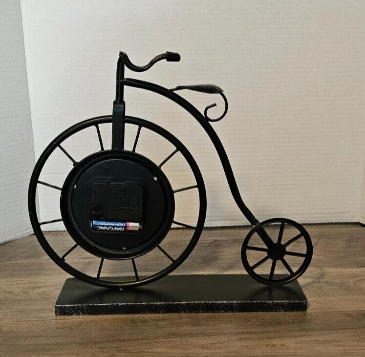 This unique Moulinette Distressed Metal Mantle Bicycle Clock is a great addition to any home décor. Its analog display type and black color give it a vintage look. The clock is made of metal and has a bicycling theme, making it perfect for those who love to ride bikes. With a height of 10 inches, this clock is perfect for mantelpieces or any other flat surface. Its brand is Clock and it falls under the categories of Wall Clocks, Clocks, and Home & Garden. Add this stylish and functional clock to your home today! Stands 10" tall, 10.5 long and 3" wide Powered by 1 AA Battery (shown in picture to check accuracy but is not included to be safe in shipping