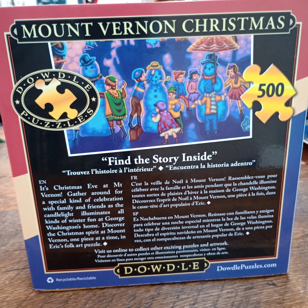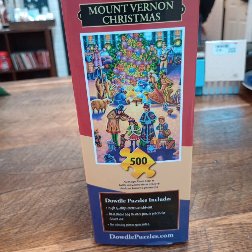 This Dowdle 500 piece puzzle is a perfect addition to your holiday puzzle collection. The puzzle features a festive scene from Mount Vernon, George Washington's historic home. With a range of colors and intricate details, this puzzle is sure to delight puzzle enthusiasts of all ages. The puzzle is still in its original, sealed packaging, ensuring that you get a pristine puzzle experience. Perfect for a relaxing evening at home or as a thoughtful gift for a history buff or puzzle lover, this Mount Vernon Christmas Puzzle is a must-have for any puzzle collection.