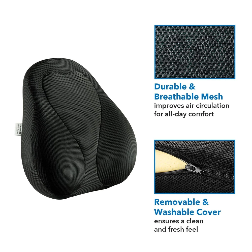 Curved Back Support Cushion for Improved Posture: Experience the best lumbar support for office chair with our ergonomically designed curved back support cushion, tailored to enhance your posture and sitting comfort. Memory Foam Ergo Back Pillow for Office Chair: This desk chair cushion features high-quality memory foam that conforms to your body's contours, providing personalized support and effectively reducing back pain. Black Breathable Mesh Material for Optimal Comfort: Stay cool and comfortable throughout the day with the breathable mesh fabric that enhances air circulation, making it the ideal chair cushion for back pain. Easy-to-Clean Removable Cover: The durable cover is made from breathable mesh fabric and can be easily unzipped and removed for washing, ensuring your lumbar pillow for chair stays fresh and hygienic. Adjustable Elastic Strap for Secure Fit: The single adjustable elastic strap ensures a perfect and secure fit on most chairs, making this back pain pillow an excellent choice for office or gaming chairs, car seats, or any seating situation where you need extra support.
