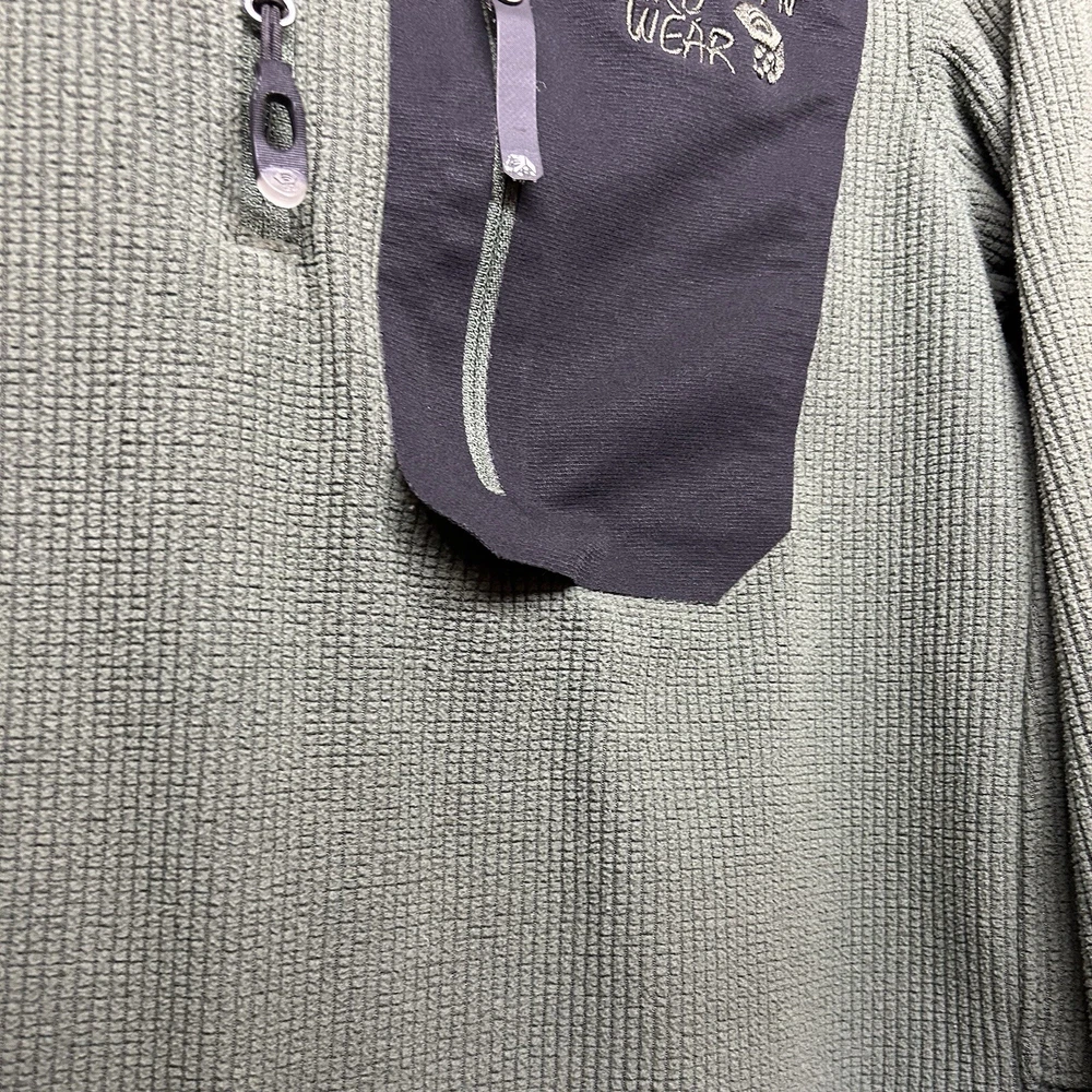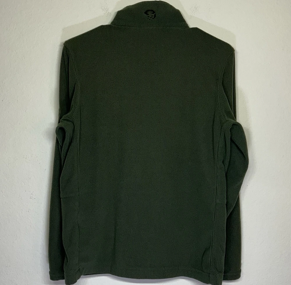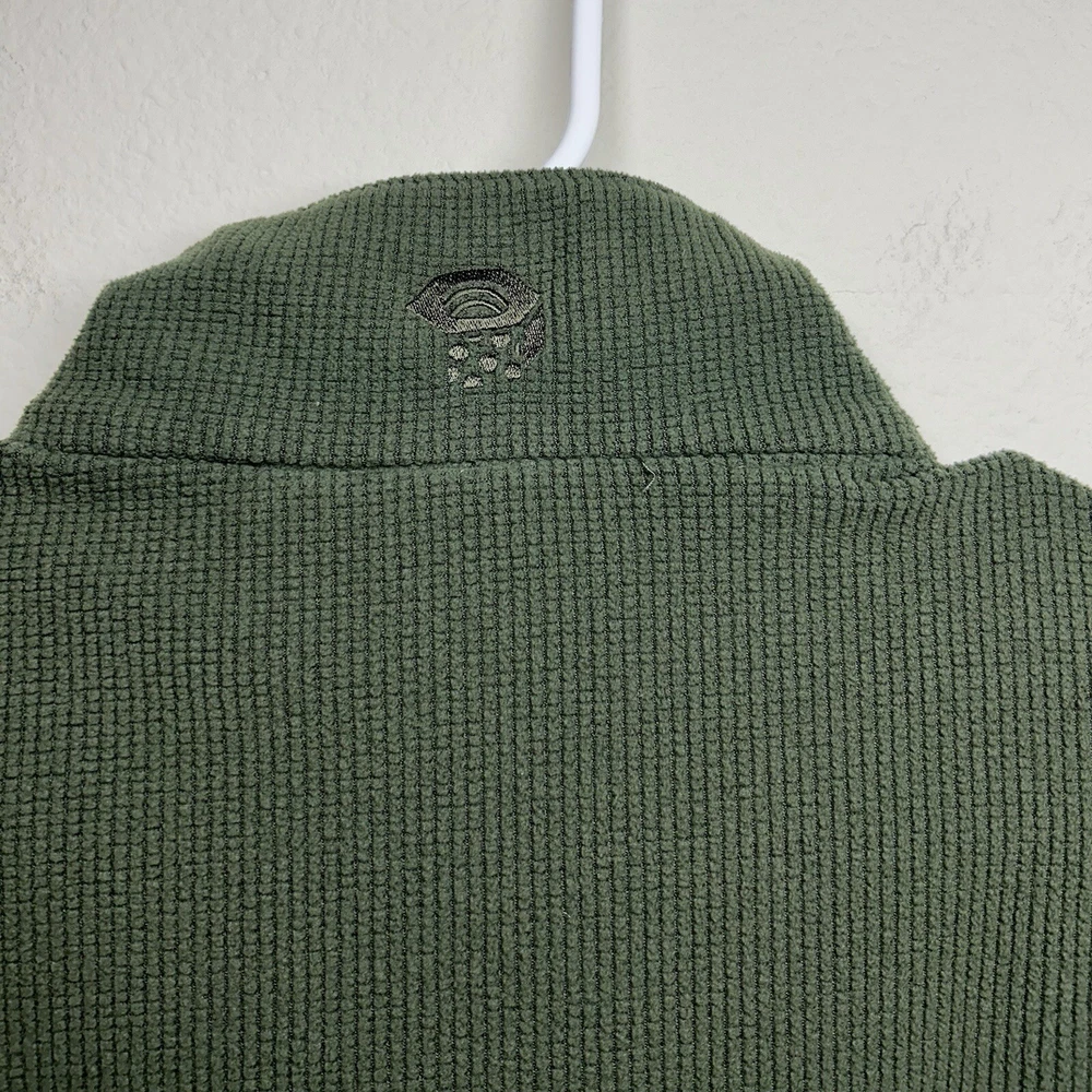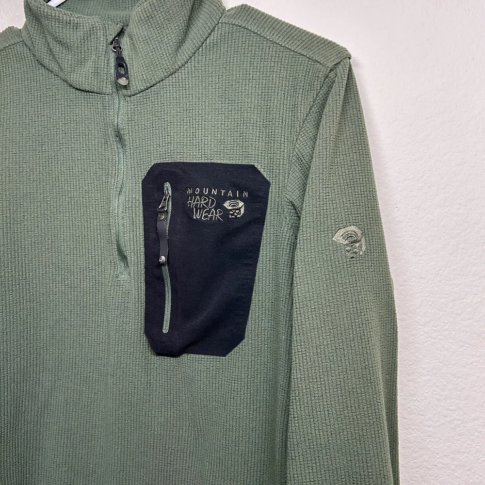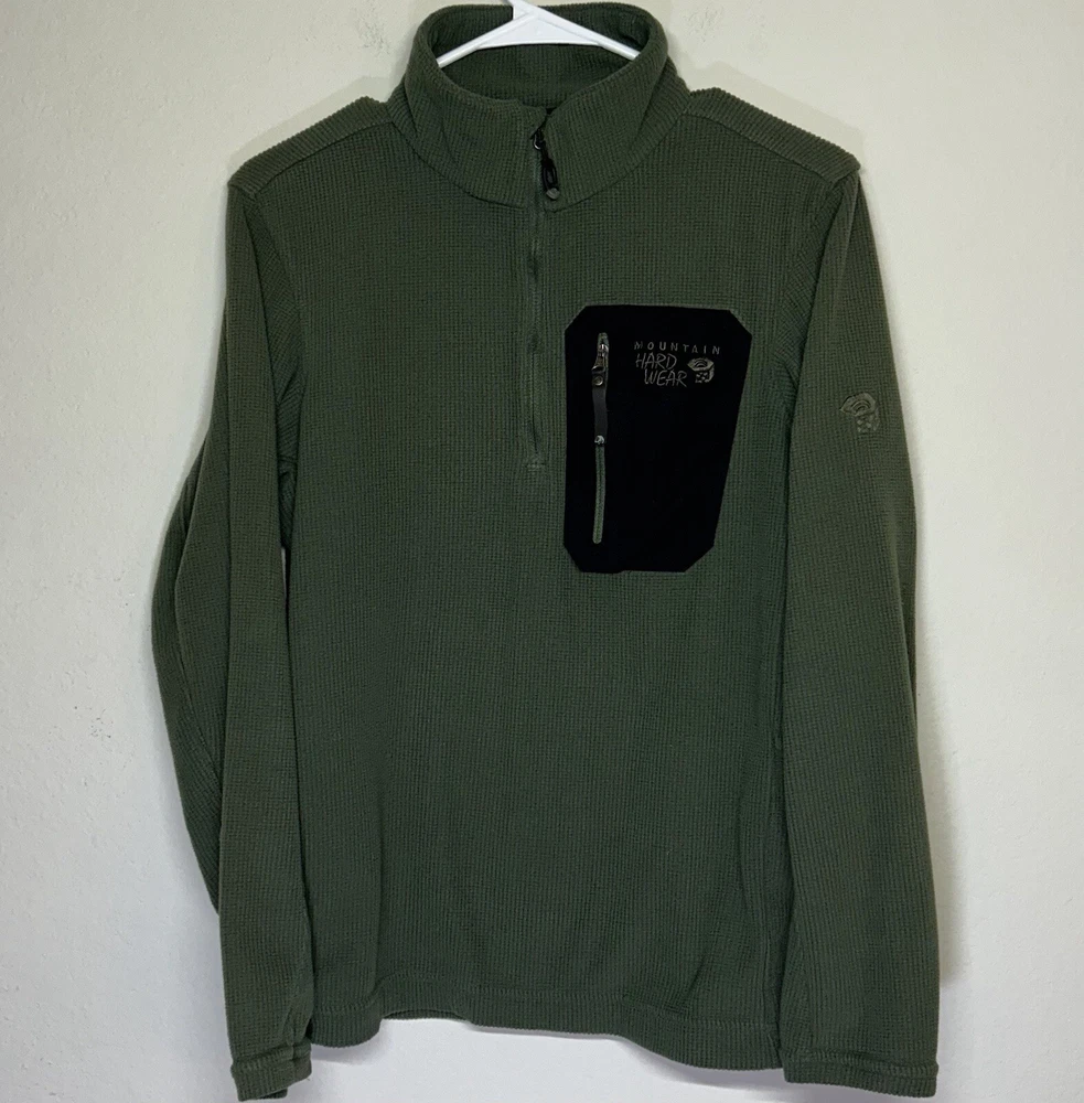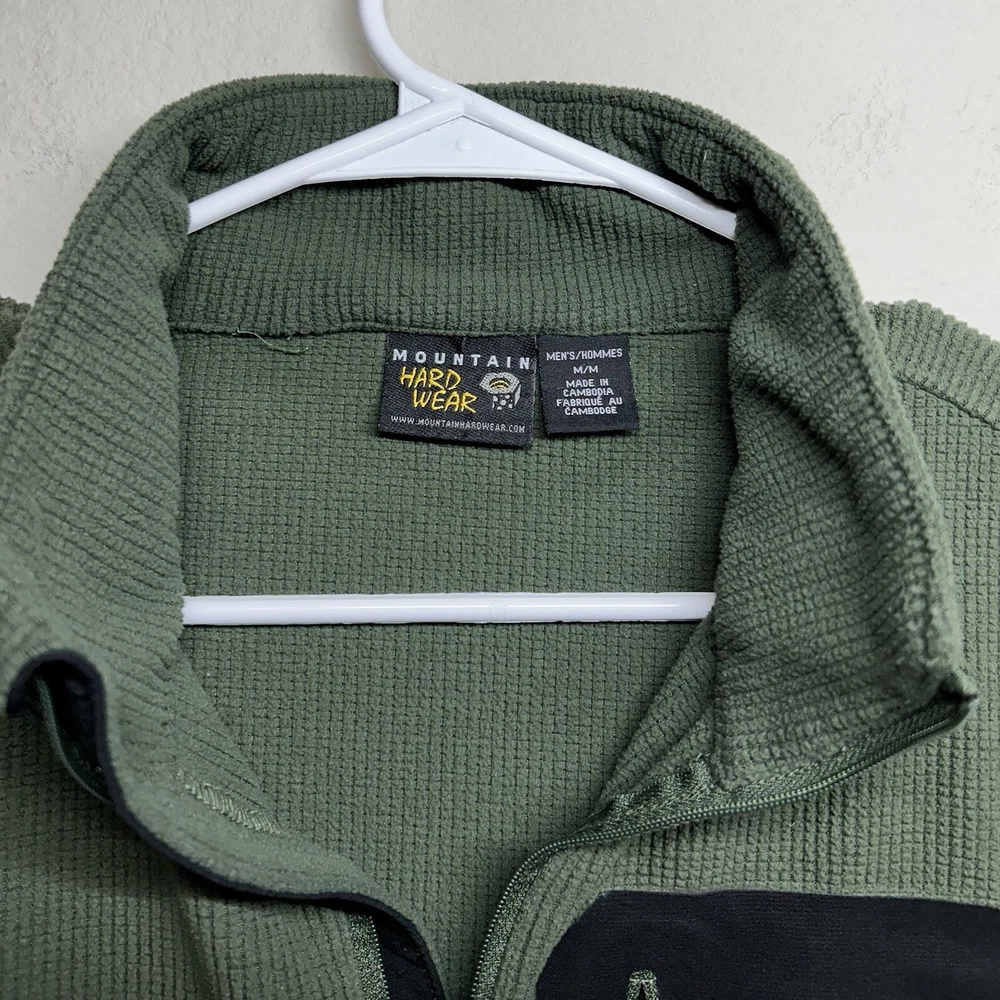 Outer Shell Material: Fleece Season: Fall, Spring, Summer, Winter Department: Men Features: Lightweight, 1/4 Zip, Pockets Fabric Type: Softshell Pattern: Solid Fit: Regular Country/Region of Manufacture: Cambodia Lining Material: Polyester Type: Jacket Color: Green Closure: Zip Size Type: Regular Style: Fleece Handmade: No Brand: Mountain Hardwear Size: M Accents: Logo, Embroidered, Zipper