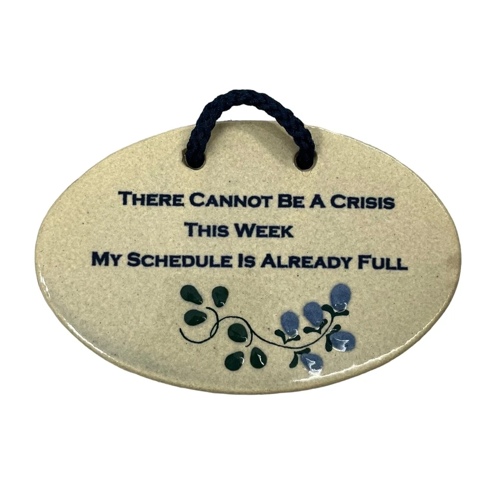 Mountain Meadows Pottery Small Floral Ceramic Quote Wall Decor "There Cannot Be A Crisis This Week My Schedule Is Already Full" Made in the USA Some discoloration Height- 4.5" Width- 5.5" Additional measurements available upon request All measurements are approximate All measurements are taken with item laying flat Colors may differ based on others computer/phone/etc settings All pre owned items have been washed and steamed All pre owned items have been looked over for flaws and will be noted in listing