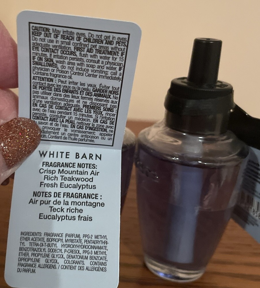Form: Oil UPC: 0667659321858 Number in Pack: 2 Brand: Bath & Body Works Power Source: Wall Plug-In Scent: crisp mountain air, rich teakwood and a touch of fresh eucalyptus Color: Blue Country/Region of Manufacture: United States Material: Glass MPN: NA Features: Deodorizer Installation Area: Device Type: Refill Intended Use: Aromatherapy Department: Adults gtin13: 0667659321858