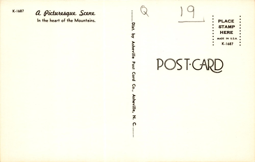 MAKE AN OFFER. THE MORE YOU BUY THE BETTER DEAL I WILL ACCEPT This postcard features a picturesque scene in the heart of the mountains. The postcard is distributed by the Asheville Post Card Co. in Asheville, North Carolina. The scene depicted on the postcard is likely a beautiful and scenic view from the mountains. Asheville, North Carolina, is known for its stunning mountain landscapes, including the Blue Ridge Mountains and the Great Smoky Mountains.