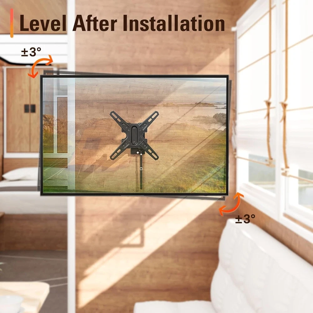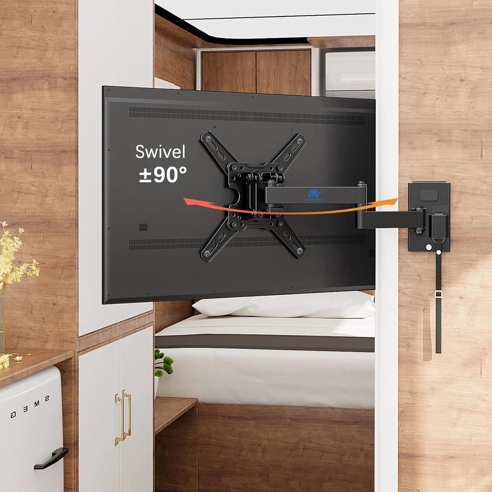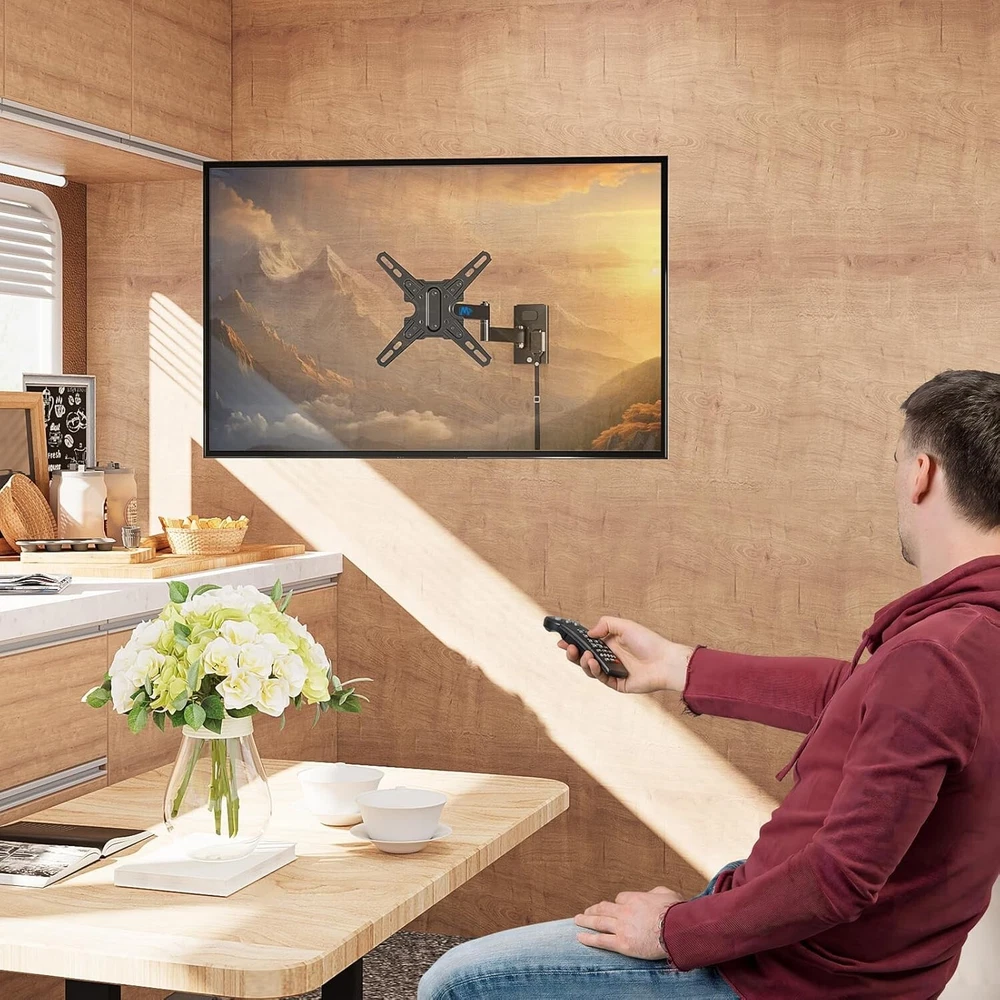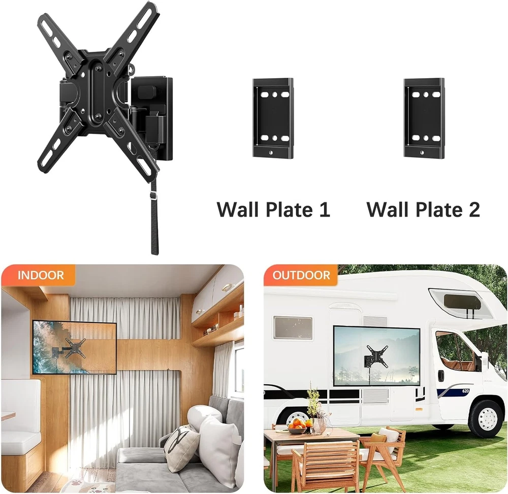 Mounting Dream UL Listed Lockable RV TV Mount for Most 13-43 inch TV, RV Mount for Camper Trailer Motor Home, Full Motion TV Wall Mount Quick Release with Dual Wall Plates, VESA 200mm, 22 lbs, MD2212 About this item [Universal TV Mount for RV] lightweight RV TV mount for most 13”-43” flat screen or curved TVs/Monitors with weight up to 22 LBS and VESA/mounting hole patterns of 50x50, 75x75, 100x100, 150x150, 100x200, 200x100, 200x200mm. Locking TV mount fits different types of TV like Lcd/Led/Oled/Qled/Mini Led, alternative or direct current TVs and DVD combo TVs. Television mount fits RV, camper, trailer, mobile home, truck and boat with wooden board ≥ 1/2 inch thick. [Full motion RV Wall mount] adjustable articulating RV TV mount for camper can be extended to 14” and retracts to 3.1”. RV TV bracket can be adjusted upward and downward, with tilting angle from +5° to -15°. Swivel RV mount can be swung left or right by 90°. Comes with post-installation level adjustment by -/+3°. Search MD2210 for heavy duty mount for RV. [Easy RV Mount with Quick Release] with clear instruction and all included hardware in pre-labeled bags, RV TV wall mount can be installed in less than 30 minutes. Wall mount and removable TV bracket for RV with double wall plates can be detached from one location and mounted on another, indoor or outdoor. [Lockable TV Mount for RV] Comes with unique locking latch mechanism design – Lock mechanism of swivel TV mount keep swing arms in place when vehicle in motion, and easily release your TV by pulling strap.