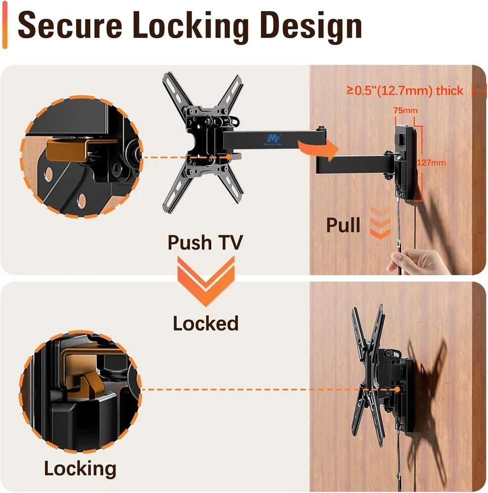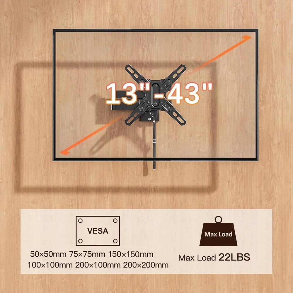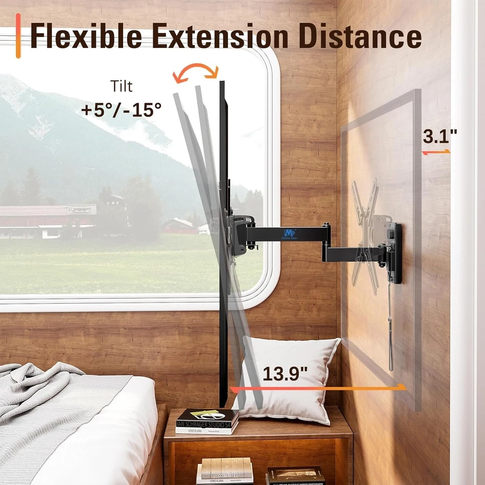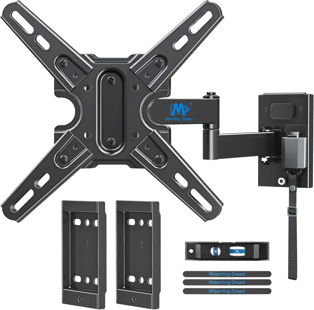 Mounting Dream UL Listed Lockable RV TV Mount for Most 13-43 inch TV, RV Mount for Camper Trailer Motor Home, Full Motion TV Wall Mount Quick Release with Dual Wall Plates, VESA 200mm, 22 lbs, MD2212 About this item [Universal TV Mount for RV] lightweight RV TV mount for most 13”-43” flat screen or curved TVs/Monitors with weight up to 22 LBS and VESA/mounting hole patterns of 50x50, 75x75, 100x100, 150x150, 100x200, 200x100, 200x200mm. Locking TV mount fits different types of TV like Lcd/Led/Oled/Qled/Mini Led, alternative or direct current TVs and DVD combo TVs. Television mount fits RV, camper, trailer, mobile home, truck and boat with wooden board ≥ 1/2 inch thick. [Full motion RV Wall mount] adjustable articulating RV TV mount for camper can be extended to 14” and retracts to 3.1”. RV TV bracket can be adjusted upward and downward, with tilting angle from +5° to -15°. Swivel RV mount can be swung left or right by 90°. Comes with post-installation level adjustment by -/+3°. Search MD2210 for heavy duty mount for RV. [Easy RV Mount with Quick Release] with clear instruction and all included hardware in pre-labeled bags, RV TV wall mount can be installed in less than 30 minutes. Wall mount and removable TV bracket for RV with double wall plates can be detached from one location and mounted on another, indoor or outdoor. [Lockable TV Mount for RV] Comes with unique locking latch mechanism design – Lock mechanism of swivel TV mount keep swing arms in place when vehicle in motion, and easily release your TV by pulling strap.
