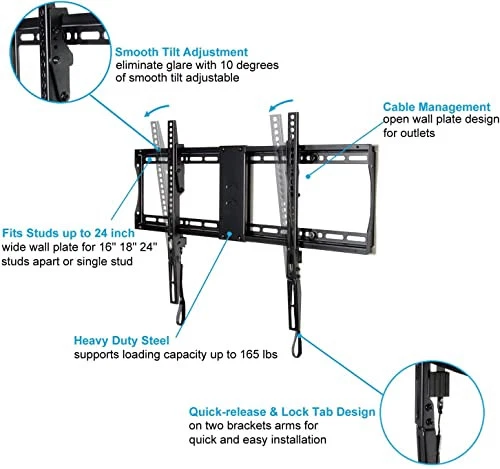 Return Policy Fast Delivery Trusted seller Mounts Tilt TV Wall Mount Bracket for Most 23"- 85" LCD LED Plasma TV with VESA 75X75 100x100 400x400 684x400 700x400mm, with Magnetic Stud Finder and HDMI Cable MF609B BXM Product Description Durable construction supports up to 165 lbs Fits 16" 18" 24" studs Fits 23" to 85" TV with VESA from 75X75mm to 700x400mm 10 degrees forward tilt to reduce glare. Quick release and lock Magnetic stud finder, HDMI cable and standard hardware included; assembly required Single stud installation for small and medium TV Shipping Returns Payment Shipping Shipping is FREE to all addresses other than APO/PO boxes in the lower 48 states. All our stock ships from US-based warehouses. Shipped via USPS or UPS (depending on location and package weight) Unless stated otherwise, all orders will ship within 24-72 hours of your payment being processed. Check our feedback to see the great reviews of FAST shipping we offer. Returns Seller does not accept returns Payment We currently accept payment via eBay managed payments only. Once payment is cleared, we will dispatch your shipment within 1-3 business days. Please refer to the "Shipping" tab for more information regarding shipping speed to your destination.
