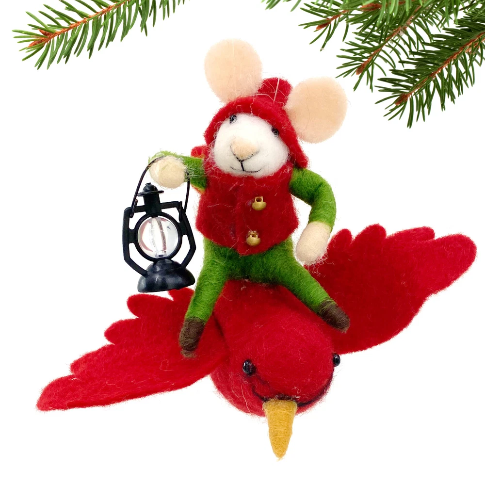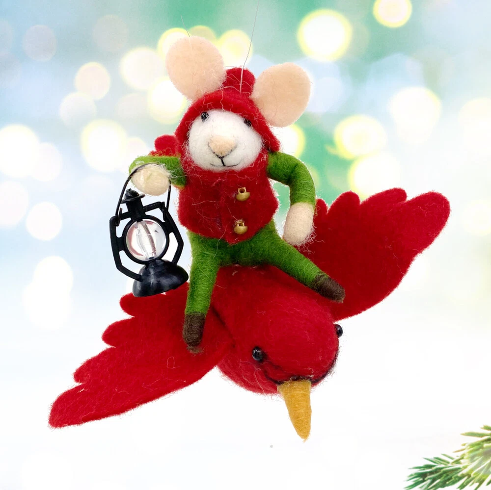 Holiday Mouse on Cardinal Christmas Tree Ornament WHIMSICAL DESIGN: Charming Mouse captures the playful, magical spirit of Christmas. Add a touch of whimsy to your holiday décor! SIZE: 5 inches EXQUISITE CRAFTMANSHIP: Showcases meticulous handcraftsmanship, highlighting the artistry and attention to detail put into creating this enchanting wool ornament. IDEAL GIFT: Unique design and exquisite craftsmanship make this a standout present for friends and family as a keepsake collectible item. Spread the holiday cheer by surprising your loved ones with this enchanting and whimsical Christmas ornament. New