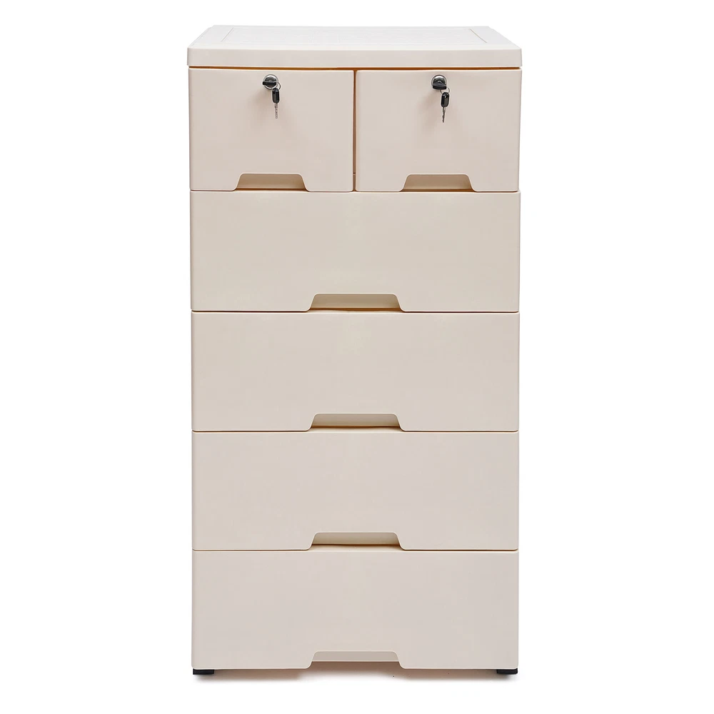 Description Are Odds and Ends Cluttering Your Room? Are You Still Worried That the Space at Home Is Too Small? Don't Worry, This Product Can Help You. This Storage Cabinet Has 6 Drawers That Can Store a Lot of Items to Meet Your Storage Needs and Give You a Neat Space. Key Features High-quality Material: This Product Is Made of High-quality Pp, Which Is Strong, Durable, and Not Easy to Deform. Good Material Can Extend Its Service Life. Elegant Appearance: the Beige Color, As Well As the Classic Design, Makes It Look Elegant. It Is a Good Decorative Piece That Can Blend in with Different Home Decor Styles and Add Color to the Home. Saving Space: This Product Is Designed Vertically. It Makes Full Use of the Unused Vertical Space to Store Items and Occupies a Small Area of 50*35cm/19.69*13.78inch, Which Can save You a Lot of Space. Strong Load-bearing Capacity: the Load-bearing Capacity of This Product Is 30kg/66lbs, Which Is Strong Enough for You to Store Items Without Worrying About It Shaking and Tipping. Large Capacity: This Product Includes Two Small Drawers and Four Large Drawers, Which Allows You to Distinguish the Placement According to the Size of the Items. the 6 Drawers Make It Possible to Hold More Items and Meet Your Daily Storage Needs. Makes Space Neat: It Has Six Drawers That Make It Easy for You to Store As Well As Access Your Items. It Can Get Your Room out of Clutter and Back to a Neat and Organized State. Excellent Sealing: the Drawer Design Makes This Product Well Sealed to Prevent Dust As Well As Insects from Entering. You Can Use It with Peace of Mind. Stackable Design: the Stacking Design Allows You to Combine and Disassemble Them According to Your Needs. You Can Store Flexibly. Protect Your Privacy: This Product Comes with Two Drawers with Locks, Which Can Protect Your Privacy Very Well. Good Stability: This Product Is Designed with a Dense Frame and Has a Large Landing Support Area, so It Is Very Stable. You Can Use It Without Worrying About It Shaking and Tipping over. Eco-friendly : the Food-grade Pp Material Is Non-toxic, Odorless, and Good for Human Health, and It Is Also Recyclable, Which Is Very Environmentally Friendly. Convenient to Move: the Four Wheels on the Bottom of the Product Are Hard-wearing and Make Very Little Noise When in Use, Providing You with a Quiet Environment. at the Same Time, It Slides Flexibly, Making It Easy for You to Move the Product and for Cleaning. Easy to Clean: the Surface of This Product Is Smooth and Flat, Which Is Easy to Clean. You Just Need to Wipe It with a Wet Rag. Easy to Install: This Product Is Simple in Structure and Complete in the Package. You Only Need a Few Simple Steps to Install It, Which Is Very Time-saving and Labor-saving. Guaranteed Customer Service: We Aim to Provide Quality Products and Services. If You Have Problems, Please Feel Free to Contact Us. We Will Reply and Solve the Problem for You As Soon As Possible. Details Drawer Stops: Each Drawer Has Raised Stops on Both Sides to Prevent the Drawer from Slipping out Easily. Rounded Corners: the Corners of This Product Are Very Rounded and Smooth, Which Can Protect You from Collisions and Is Very Safe to Place in Your Home. Thickened Top Panel: the Thickened Top Has a Strong Load-bearing Capacity, Which Allows You to Put a Lot of Items on It with Peace of Mind. It Can Also Facilitate Your Access to Commonly Used Objects. Recessed Handles: the Drawers Are Designed with Recessed Handles, Which Makes It Easier to Access Items and Saves Surface Space. at the Same Time, the Rounded Handles Protect Your Hands from Scratches and Are More Aesthetically Pleasing. Application It Is Suitable for Storing Clothes, Toys, Children's Books, and Other Items. It Can Be Placed in the Crevice Space Next to Beds, Closets, Sofas, and Cabinets. Its Load-bearing Capacity Is 30kg/66lbs. Specification Color: Beige Color Material: Food-grade Pp Shape: Rectangular Style: Modern Number of Layers: 5 Number of Drawers: 6 Load-bearing Capacity: 30kg/66lbs Product Size: 50*35*102cm/19.69*13.78*40.16inch Gross Weight: 7.9kg/17.42lbs Package Size: 51.5*40.5*49cm/20.2*15.9*19.2inch Package Included 6* Drawers 6* Drawer Panels 1* Top Panel 5* Frames 16* Panels 4* Wheel Covers 5* Wheels 4* Keys 1* Chinese Manual Notes Please Read the Manual Completely Before Installation and Use, and Pay Particular Attention to the Safety Instructions Included. Please Allow the Slight Color Difference Caused by the Shooting Light and 1-3cm Error Due to Manual Measurement, and Make Sure You Do Not Mind Before Ordering.