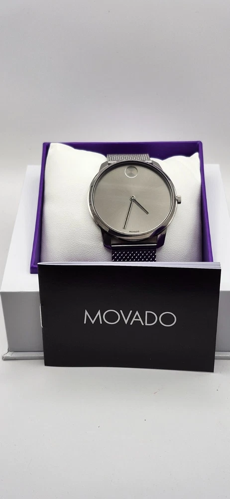 Style: Classic Display: Analog Indices: No Hour Marks Dial Pattern: Logo Type: Wristwatch Department: Men Caseback: Solid Bezel Color: Gray, Pink, Rose Gold Closure: Deployant Lug Width: 21 mm Band/Strap: Bracelet Water Resistance: 30 m (3 ATM) Case Material: Stainless Steel Case Size: 42 mm Case Finish: Polished Band Material: Stainless Steel Band Color: Silver Case Thickness: 10 mm Number of Jewels: 15 Jewels Model: Movado BOLD Thin Bezel Type: Smooth, Fixed Band Width: 21 mm Dial Color: Gray Features: Water-Resistant, Mineral Crystal, Shock-Resistant, 12-Hour Dial, Swiss Movement, Swiss Made, Push/Pull Crown, Splash Proof, Scratch-Resistant Watch Shape: Round Case Color: Silver Brand: Movado Reference Number: 3600599 Movement: Quartz