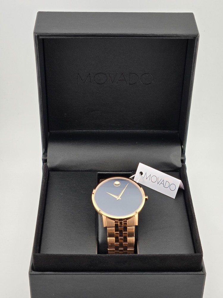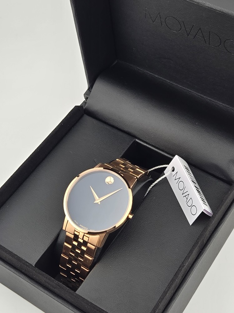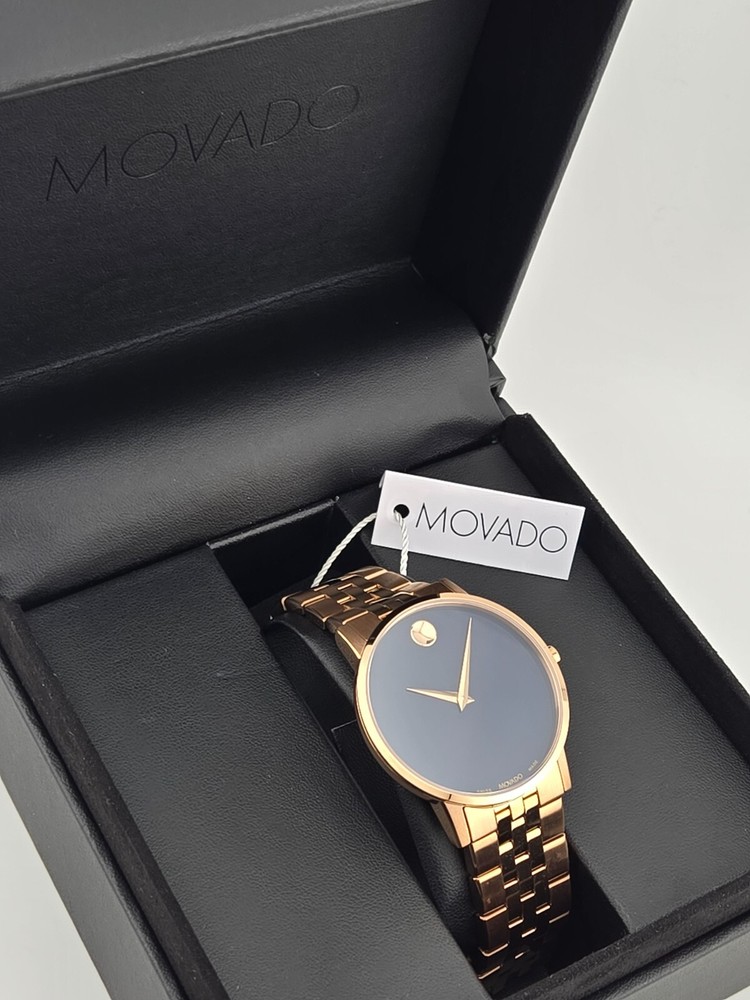 $1195 MSRP | Movado Men's Museum Blue Dial Stainless Steel Watch - 0607353 Introducing the Movado Men's Museum Blue Dial Stainless Steel Watch (Model 0607353), a distinguished timepiece that exudes sophistication and contemporary style. This watch features a striking rose gold PVD stainless steel case and bracelet, which add a touch of opulence to its modern design. The fixed rose gold PVD bezel seamlessly frames the vibrant blue dial, where rose gold-tone hands and the iconic Movado dot at the 12 o'clock position stand out in their minimalist elegance. Designed for precision, the Museum watch is powered by a reliable quartz movement, ensuring consistent timekeeping with effortless accuracy. The analog dial is protected by a scratch-resistant sapphire crystal, preserving its brilliant appearance while guarding against everyday wear. With a substantial 40 mm round case and a 22 mm band width, this watch provides a bold yet refined presence on the wrist. The fold-over clasp with a push-button release ensures a secure and comfortable fit. Built with functionality in mind, the Movado Men's Museum watch offers water resistance up to 30 meters (100 feet), making it suitable for handling splashes and brief submersion. The pull/push crown allows for easy adjustments, while the solid case back enhances durability. This timepiece is a perfect choice for those who appreciate both contemporary design and classic craftsmanship, making it a versatile addition to any collection. Features Rose gold PVD stainless steel case and bracelet. Fixed rose gold PVD bezel. Blue dial with rose gold-tone hands. No markers. The Movado dot appears at the 12 o'clock position. Dial Type: Analog. Quartz movement. Scratch resistant sapphire crystal. Pull / push crown. Solid case back. Round case shape. Case size: 40 mm. Band width: 22 mm. Fold over clasp with a push button release. Water resistant at 30 meters / 100 feet. Functions: hour, minute. Fast and Free Shipping You're already purchasing the item. Why pay additional for shipping, especially slow shipping? We get your order shipped out within 1-business day and delivered to your doorstep as quickly as possible. Competitive Pricing With our dynamic pricing model, our prices are always competitive. Our prices are some of the lowest that you will find on the internet. Rest assured that you're getting a good deal when purchasing with us. 30-day Money Back Guarantee We are committed to making sure that you leave this transaction satisfied. If you're unhappy with the product for any reason, you may return it back for your money-back or a replacement within 30 days. No questions asked!
