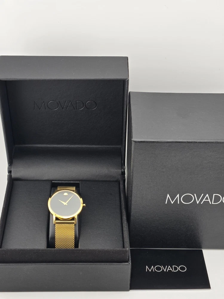 Movado Museum Women's Black Dial Stainless Steel Watch - 0607647 ($995 MSRP) With Original Box! This watch is a Shelf Pull from one of the Major Department Stores. This watch has been professionally refurbished and is in excellent condition with minimal cosmetic imperfections . The **Movado Museum Women's Black Dial Stainless Steel Watch - 0607647** is a refined and minimalist timepiece that captures the essence of Movado’s iconic design. Featuring a 33mm yellow gold-tone stainless steel case and matching bracelet, this watch offers a luxurious, compact silhouette ideal for those who prefer a sleek and understated accessory. The fixed yellow gold-tone bezel frames a deep black dial, elegantly accented with gold-tone hands and the signature Movado dot at 12 o’clock. Powered by a precise quartz movement, this watch provides reliable hour and minute functions, perfect for everyday use or special occasions. The scratch-resistant sapphire crystal protects the dial, ensuring long-lasting clarity and durability. With a pull/push crown and solid case back, the watch is built to maintain its clean, elegant design while offering practical resilience. Secured with a fold-over clasp and safety release, the yellow gold-tone bracelet ensures a comfortable and secure fit. Water-resistant up to 30 meters (100 feet), the **Movado Museum 0607647** is suitable for light water exposure and daily wear. Its classic color combination and timeless design make it a versatile accessory that complements both casual and formal ensembles. Features Yellow gold-tone stainless steel case and bracelet. Fixed yellow gold-tone stainless steel bezel. Black dial with yellow gold-tone hands. Dial Type: Analog. Quartz movement. Scratch resistant sapphire crystal. Pull / push crown. Solid case back. Round case shape, case size: 33 mm. Fold over clasp with a safety release. Water resistant at 30 meters / 100 feet. Functions: hour, minute. Fast and Free Shipping You're already purchasing the item. Why pay additional for shipping, especially slow shipping? We get your order shipped out within 1-business day and delivered to your doorstep as quickly as possible. Competitive Pricing With our dynamic pricing model, our prices are always competitive. Our prices are some of the lowest that you will find on the internet. Rest assured that you're getting a good deal when purchasing with us. 30-day Money Back Guarantee We are committed to making sure that you leave this transaction satisfied. If you're unhappy with the product for any reason, you may return it back for your money-back or a replacement within 30 days. No questions asked!