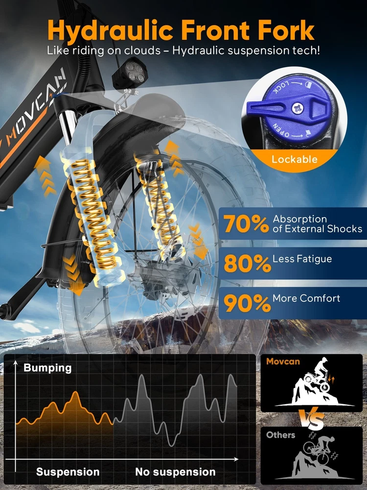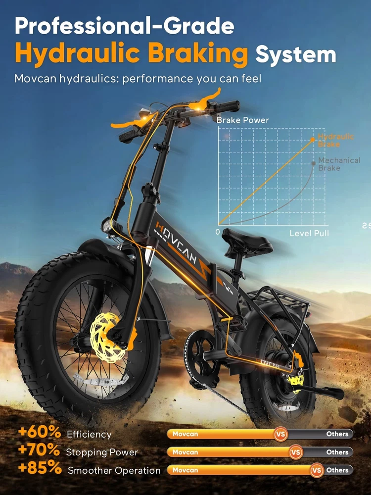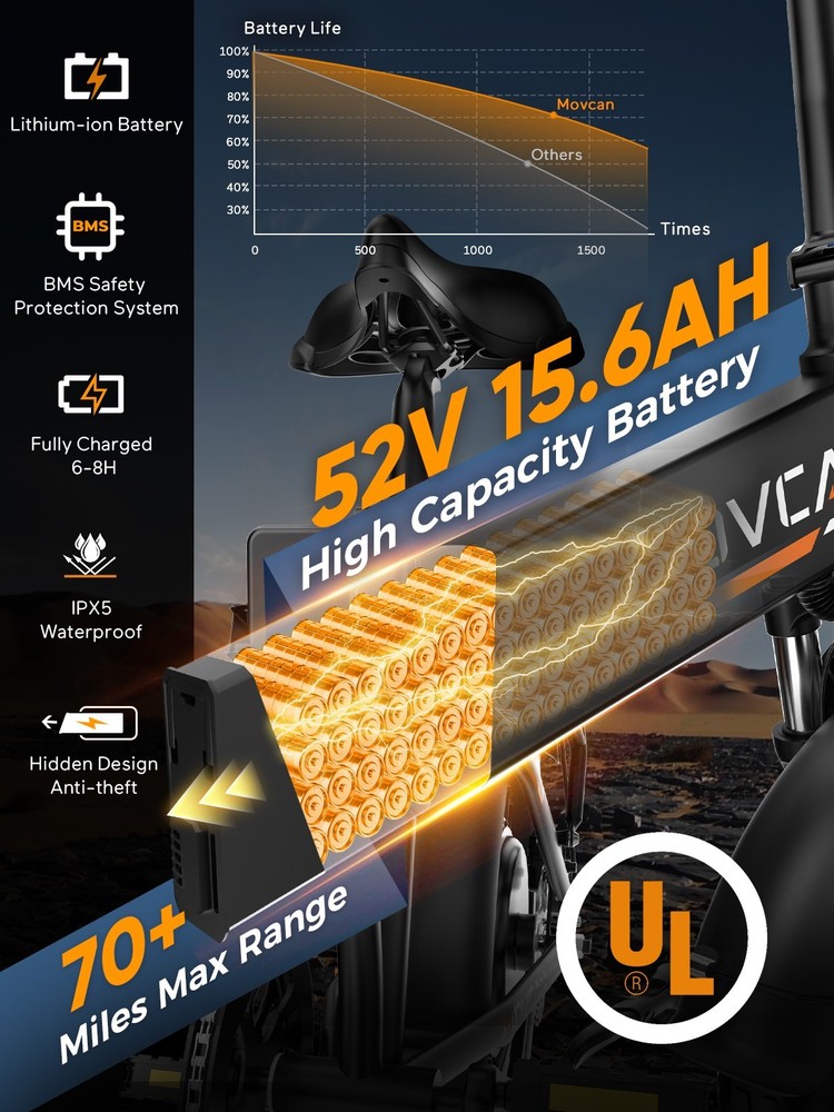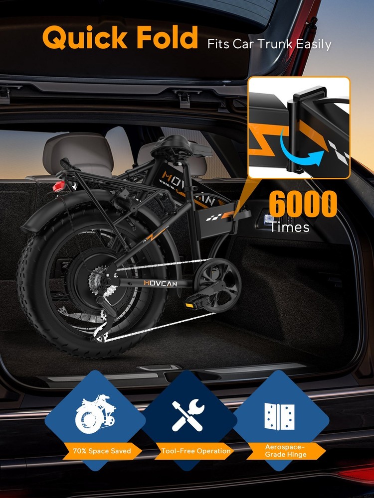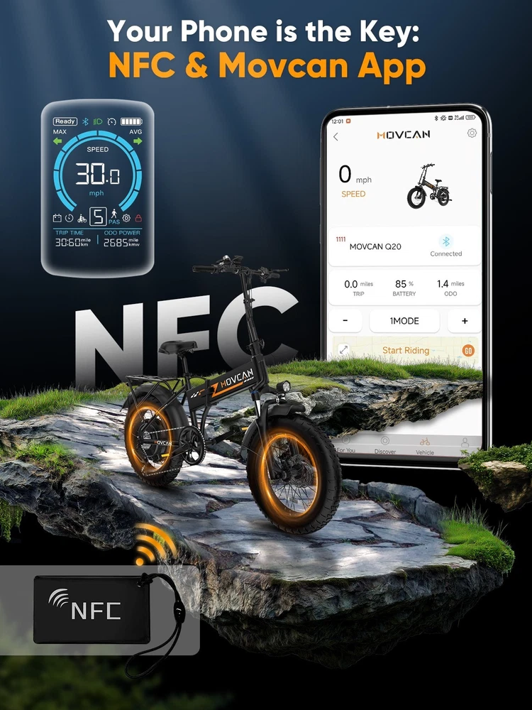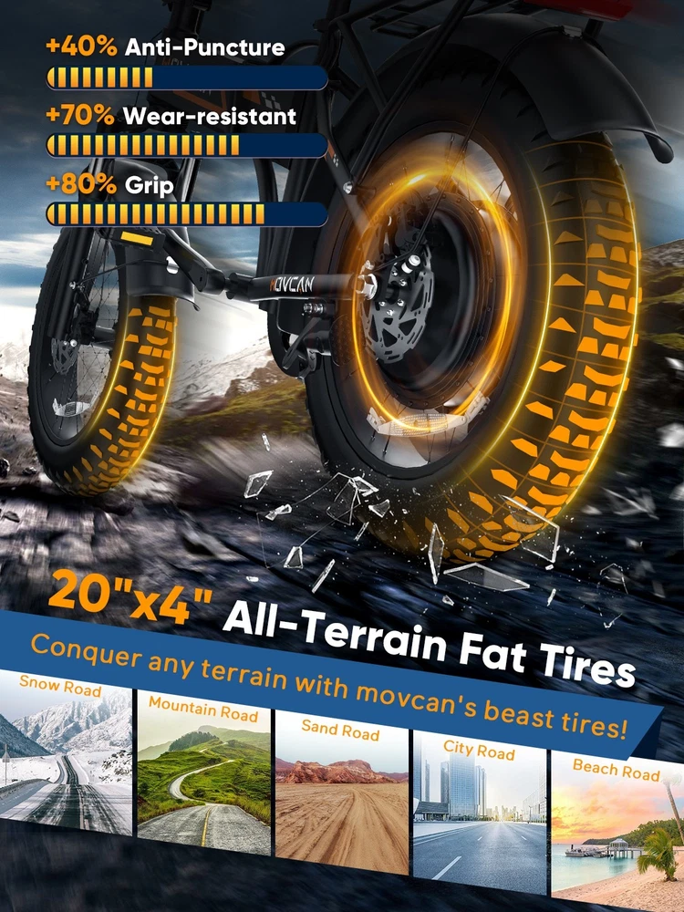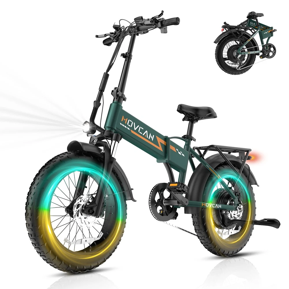 🏍 Conquer All Terrains! Movcan Q20 Basic Information: Brand: movcan Theme: Motorcycle Age Range (Description): Adult Recommended Use: Off-road Bicycle Type: Mountain Bike Style: Q20 Color: Black, Green, White, Rose Warranty Type: Extended Maximum Weight Recommendation: 330 Pounds Assembly Required: Yes Bicycle Gear Shifter Type: Trigger Number of Handles: 2 Skill Level: Intermediate Size: 66*26.5*47.2inch Bike Weight:77lb Warranty Description:1 Year Warranty for the Most Parts and 6 Months for Battery, Brake and Tire Technical Details: Seat Material Type: Leather Gear Shift: 5 Speed Level (Default PAS) Pedal Assist: 7 Speed (Work with PAS) Speed: Up to 30MPH Range: Up to 30 Miles per Charge (Pure Electric), 70 Miles per Charge (PAS Mode) Motor: 1500W Battery:52V 15.6Ah Removable Battery Charging Time: 6 Hour Tires: 20"x4" All-Terrain Fat Tire Frame Material: Alloy Steel Material:Carbon Steel Wheel Material:Aluminum Suspension Type: Dual Special Feature: Dual Suspension, Dual Battery, Hydraulic Brakes,LCD Display Included Components: Tool Kit,Phone Holder,Air Pump,Password Lock Brake: Double Hydraulic Brake Package Content: 1 x Electric Bicycle 1 x Removable Lithium-Ion Battery 1 x Charger 1 x Tool Kit 1 x Instruction 1 x Accessories Kit 【1500W Motor & 52V 15.6Ah Removable Battery for Extended Rides】The Movcan Q20 electric bike for adults integrates a 1500W brushless motor capable of reaching 30MPH with stable acceleration. Powered by a 52V 15.6Ah lithium-ion battery, it delivers 40 miles per charge in pedal-assist mode. The removable hidden battery allows flexible charging at home, office, or public stations. As a foldable electric bike, it maintains robust performance for daily commutes while optimizing energy efficiency 【Space-Optimized Folding Design for Urban Mobility】Engineered for practicality, the Movcan Q20 folding electric bike features a reinforced hinge mechanism that folds in 20 seconds. The compact footprint fits standard car trunks, apartment closets, and public transit storage areas. Ideal for commuters transitioning between trains, buses, and offices, this folding ebike reduces parking costs while maintaining full-sized bike stability. Practical storage solutions included in the design 【20"x4" Multi-Surface Tires & NFC-Enabled Display】Equipped with 20"x4" fat tires, the Movcan Q20 fat tire electric bike for adults provides reliable traction on pavement, packed trails, and wet surfaces. The tread pattern minimizes rolling resistance while preventing debris buildup. A waterproof LCD display shows real-time speed, battery percentage, and distance traveled. NFC card authentication adds theft deterrence. Suitable for year-round commuting in rain or light snow 【Adjustable Front Suspension & Hydraulic Disc Brakes】The Movcan Q20 electric bike incorporates a travel suspension fork with preload adjustment to absorb urban potholes and curb impacts. Hydraulic dual brakes reduce braking distance by 50% in wet conditions, which greatly reduces bumps during riding and improves riding stability and ensures your safety when enjoying the speed.This folding electric bike prioritizes control during sudden stops or downhill rides 【5 Riding Modes & 7-Speed Gearing】Customize your ride with the Movcan Q20 electric bike! Choose from 5 modes—Pure Electric, PAS, Cruise, Walk, and Bike—to match your terrain and mood. The professional 7-speed transmission adapts seamlessly to urban commutes or mountain trails. This movcan electric bike adapts to diverse scenarios – from crowded downtown streets to park pathways 【90% Pre-Assembled & 12-Month Warranty for Hassle-Free Setup】Get rolling in minutes! The Q20 ebike arrives 90% pre-assembled, with video tutorials and tools included for quick setup. Backed by a 12-month warranty, the Movcan Q20 folding electric bike for adults comes with 24/7 customer support. Pro tip: Please reserve the original package for some time in case of any issues of return. Whether you're a beginner or a pro, this movcan electric bike is designed for effortless ownership Note: Our products have been certified under UL2849 safety standards.