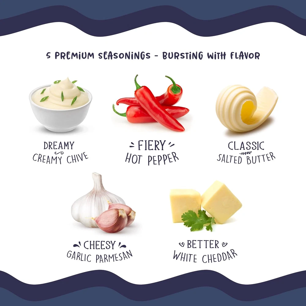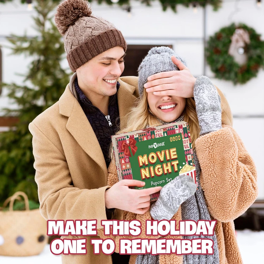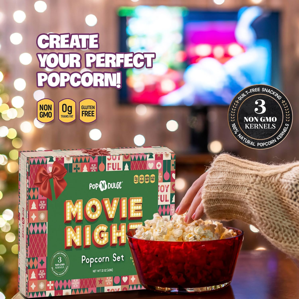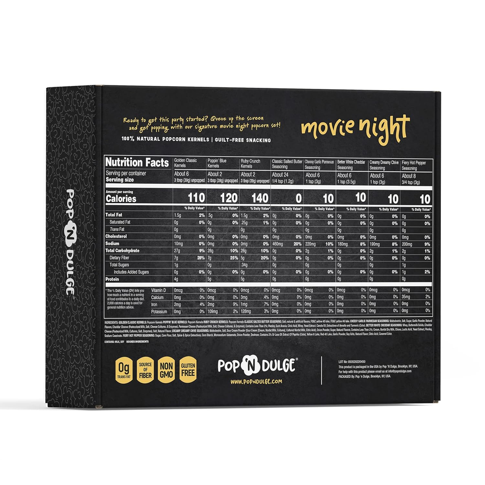 MOVIE NIGHT POPCORN KIT: It just takes a little imagination to recreate the magic of your favorite theater at home. Get the whole family on board or invite over your best buddies to pop some delicious movie popcorn for movie night. Get creative with the best of all foodie gifts and Christmas gift baskets. A GREAT GIFT: Family Christmas gifts, couples Christmas gifts ideas, Christmas gifts for parents — everyone has a reason to love our Pop ‘n Dulge Movie Night Popcorn Holiday Gift Set. Also a wonderful choice for date night, family gifts, foodie gifts, and birthday gift ideas! PACKED WITH FUN: Add to the action on movie night with this delicious and festive popcorn gift set. Enjoy gourmet kernels in three different natural earth tones: Golden Classic, Poppin’ Blue, and Ruby Crunch. Our Movie Night Popcorn Holiday Gift Set is sourced with the highest quality ingredients in mind. 5 DELICIOUS POPCORN FLAVORS: Make movie magic with 5 mouth-watering, savory popcorn seasonings: Classic Salted Butter, Cheesy Garlic Parmesan, Better White Cheddar, Creamy Dreamy Chive, and Fiery Hot Pepper. Our Movie Night Popcorn Holiday Gift Set lets you whip up an exciting cinematic snack in no time. ALL NATURAL, NON-GMO KERNELS: We care about the quality of our products, because your health matters. That’s why a whole lot of effort goes into ensuring that our food kits contain only the best ingredients and products out there. All our kernels and spices are naturally gluten-free, non-GMO, free from trans fats, and sourced from farms in the USA. Get ready for guilt-free snacking! Product description Are you ready to spice things up? Our delicious Movie Night Popcorn Kit is great for foodie gifts, date night, family gifts, thank-you baskets, and more. There’s no better way to celebrate your love of cinema than with fresh popcorn. Let’s get poppin’! We make it easy to pop fresh kernels and combine them with your choice of popcorn toppings. Our popcorn kits are a great date night box and the perfect addition to a unique housewarming gift basket. Guilt-free indulgence. Pop 'N Dulge popcorn is sure to be a hit with anyone looking for a luxurious and delicious cozy movie night at home or as a special surprise for your loved one. Made with high-quality ingredients! Pop 'N Dulge Movie Night Popcorn Gift Sets Add to Cart Add to Cart Add to Cart Add to Cart Add to Cart Customer Reviews 4.5 out of 5 stars 3,477 4.5 out of 5 stars 1,261 4.5 out of 5 stars 1,261 4.3 out of 5 stars 72 4.5 out of 5 stars 1,261 4.5 out of 5 stars 1,261 3.9 out of 5 stars 46 Price $18.68 $ 18 . 68 $24.98 $ 24 . 98 $19.98 $ 19 . 98 $21.95 $ 21 . 95 $24.95 $ 24 . 95 $19.98 $ 19 . 98 $20.98 $ 20 . 98 Items included 16 10 10 10 10 10 5 Giftable Packaging ✔ ✔ ✔ ✔ ✔ ✔ ✘ Greeting Card ✔ ✔ ✔ ✔ ✔ ✔ ✘ Kosher Ingredients ✔ ✔ ✔ ✔ ✔ ✔ ✔ Made in USA ✔ ✔ ✔ ✔ ✔ ✔ ✔ Share the love! A Delicious Gift Popcorn is meant for sharing. When it comes to kitchen gifts, you can’t go wrong with this easy and delicious Movie Night Popcorn Gift Set. Invite some friends over or surprise your family with this colorful popcorn gift set. Get in the spirit of the season and share the joy! Popcorn is easy to make, and it’s packed with fun! Make a healthy, flavorful snack out of gourmet popcorn and add a little extra flair to movie night with this delicious food gift. Built in fun! Make magical memories! Movies and popcorn are a classic Hollywood couple. Turn regular movie night into something memorable with a snack gift basket filled with fresh popcorn kernels and 5 delicious popcorn seasonings. Pop! Mmm. There’s nothing like freshly popped popcorn to make movie night a blast. Kids and adults will love this tasty snack gift basket — a great choice for a couples gift or for gift baskets for families.