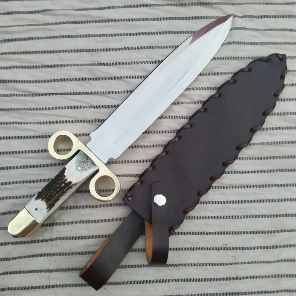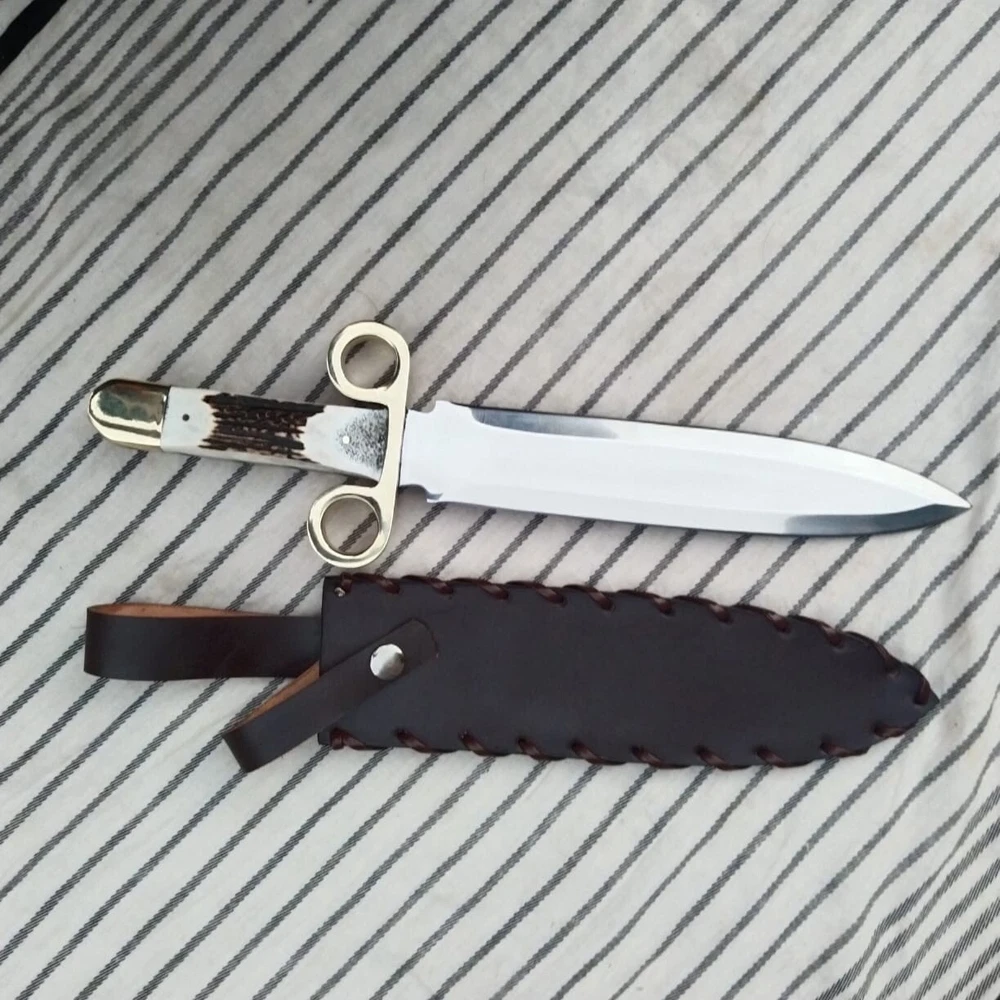 Tombstone Double Ring Guard Dagger Knife: Ike/Billy Clanton Movie Replica – Custom Handmade with 1095 Carbon Steel Blade and Real Stag Antler Handle Materials and Craftsmanship: Blade Material: 1095 Carbon Steel The blade of this Dagger knife is forged from 1095 carbon steel, a material renowned for its strength, durability, and edge retention. 1095 carbon steel is a high-carbon alloy that provides excellent hardness and sharpness, making it ideal for demanding tasks. The blade's construction ensures that it holds a razor-sharp edge, even with extended use. It is resistant to chipping and cracking, which makes it suitable for both practical use and display. The blade is meticulously hand-ground and polished to achieve a rugged yet refined finish. The high-carbon content of 1095 steel contributes to its toughness, while the careful forging process enhances its overall performance. This results in a blade that not only performs exceptionally well but also showcases a classic, historical aesthetic. Handle Material: Real Stag Antler with Brass double Ring Guard The handle of the Tombstone Dager Knife is crafted from genuine stag antler, chosen for its unique appearance and natural durability. Each stag antler handle is hand-selected for its quality and distinctiveness, ensuring that every knife is a one-of-a-kind piece. The antler handle is contoured to provide a comfortable and secure grip, enhancing the knife's usability during extended use. The handle is further enhanced with a brass double ring guard, which adds a touch of authenticity and historical flair. The ring guard is a key feature that harks back to the design of the Old West, providing both functional protection and a distinctive visual element. The brass ring guard helps prevent hand slippage onto the blade, adding an extra layer of safety during use. Dimensions and Measurements: - Overall Length: Approximately 14.75 inches - Blade Length: Approximately 10 inches - Handle Length: Approximately 4.75 inches The 14.75-inch overall length provides a balanced and substantial feel, making the knife versatile for various applications. The 10-inch blade offers ample cutting surface for tasks ranging from hunting and survival to tactical scenarios. The 4.75-inch handle length ensures a comfortable grip, allowing for precise control and effective handling. Leather Sheath: Each Tombstone Double Ring Guard Bowie Knife comes with a premium leather sheath, designed to protect the blade and enhance its portability. The sheath is crafted from high-quality leather, ensuring durability and a secure fit for the knife. It features a classic design with a belt loop or strap, allowing for easy carrying during outdoor activities or while on the go. The leather sheath not only provides practical protection but also complements the knife’s aesthetic, adding to its overall presentation. Over time, the leather will develop a unique patina, further enhancing the knife's character and showcasing its artisanal quality. Gift Options: The Tombstone Ring Guard Bowie Knife makes an exceptional gift for any occasion. Its combination of historical significance, high-quality materials, and craftsmanship makes it a memorable and valuable present. Gift wrapping is available upon request, ensuring that your gift is presented beautifully and ready for any celebration. This knife is perfect for: - Collectors: A must-have addition to any collection, especially for fans of Western history and cinema. - Movie Props: An authentic replica that captures the essence of the Old West and the iconic film Tombstone. - Christmas Gifts: A unique and thoughtful gift for movie enthusiasts and history buffs. - Personalized Gifts: A special present that can be personalized for a unique touch. - Gifts for Him: Ideal for men who appreciate quality craftsmanship and historical replicas. - Anniversary and Wedding Gifts: A meaningful and timeless gift to commemorate special occasions. - Outdoor and Survival Enthusiasts: A practical tool for those who enjoy hunting, camping, and tactical activities. - Groomsmen Gifts: A distinctive and memorable gift for groomsmen, celebrating a significant event. Care Instructions: To ensure the longevity and performance of your Bowie knife, follow these care instructions: 1. Lubricate the Blade: Apply a light coat of oil to the blade after each use to prevent rust and maintain its sharpness. 2. Keep Dry and Clean: Ensure the knife is kept clean and dry to avoid contamination and rust. 3. Hand Wash Only: Do not wash the knife in a dishwasher. Instead, hand wash it with mild soap and water. 4. Avoid Abrasive Cleaning: Refrain from using steel wool or abrasive sponges, as they can damage the blade. 5. Blade Cleaning: When cleaning, wipe and rub the blade in the direction of the Damascus patterns to preserve their integrity. Conclusion: The Tombstone Ring Guard DaggerKnife is a masterful blend of historical homage and practical craftsmanship. With its 1095 carbon steel blade, genuine stag antler handle, and brass ring guard, it stands as a tribute to the Old West and the classic film Tombstone. Whether for personal use, as a collectible, or as a special gift, this knife offers both exceptional functionality and striking visual appeal. Order yours today to own a piece of Western history and experience the exceptional quality and craftsmanship of this unique Bowie knife.