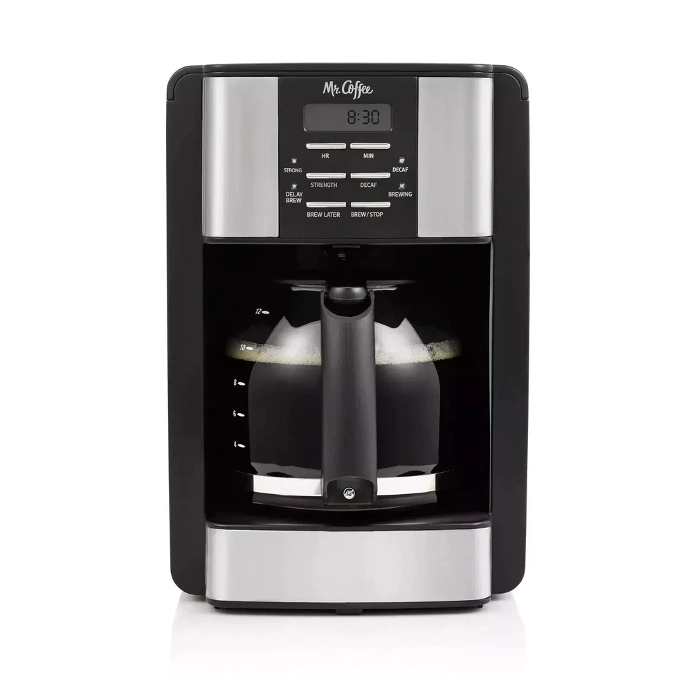 Mr. Coffee Programmable 3-Way Brewing System 12-Cup Drip Coffee Makers, New Product details Perfect for busy days, this sleek, stainless steel Mr. Coffee 12-Cup Programmable Coffee Maker features a flexible 3 Ways to Brew System that makes it easy to brew a delicious cup of coffee exactly how you like it. With the touch of a button, choose between Regular, Strong Brew, and Decaf, and enjoy your coffee in minutes! Just add your coffee, use the Water Window to check the water levels, and you’re good to go! The Delay Brew setting makes it easy to schedule brewing ahead of time, so you can wake up to a fresh cup. Want your coffee right away? Grab-a-Cup Auto Pause lets you get a cup before the brewing cycle is over. The convenient 4-Hour Auto-Shutoff function automatically turns off the coffee maker, so you don’t have to. Whether you’re brewing coffee for yourself or for a crowd, this feature-packed coffee machine is a great addition to your kitchen coffee station. Mr. Coffee Programmable 3-Way Brewing System 12-Cup Drip Coffee Makers Brew Selector: Choose between Regular, Strong Brew, or Decaf coffee at the touch of a button for a personalized brewing experience Lift & Clean Filter Basket: The filter basket lifts out for fast and easy cleanup Water Window: The easy-view Water Window allows you to see the water level to prevent overflow Auto-Pause: Grab-a-Cup Auto Pause stops the brewing cycle, allowing you to pour a cup before brewing is finished Auto-Shutoff: The 4-Hour Auto-Shutoff feature automatically turns off the coffee maker for added safety Specifications Features: Automatic Shut-Off, Programmable, Temperature Control, Water Level Indicator Brand: Mr. Coffee Assembled Product Dimensions (L x W x H): 9.30 x 11.10 x 14.60 Inches