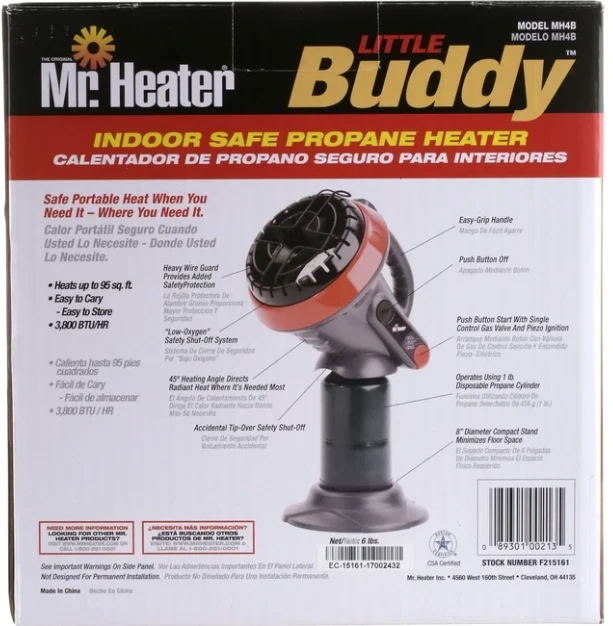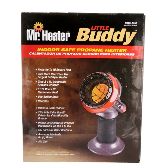About this item Radiant propane heater in a portable, indoor safe design 3,800 BTUs heats up to 95 square feet by Mr. Heater Tip over safety shut off switch and low oxygen safety shut off sensor Runs 5.6 hours on standard 1 lb propane cylinder