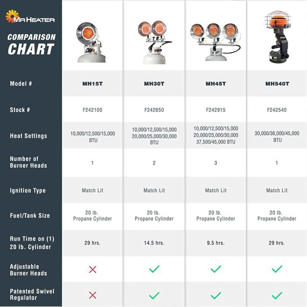 About this item Multi-directional radiant propane heater mounts directly to a 20 lb tank for easy portability High-medium-low regulator: 45,000-36,000-30,000 BTUs Tip-over safety shut-off switch Approximate 9.5 hour run time on high with a 20 lb tank Mounts on 20 - 100 lb propane cylinder