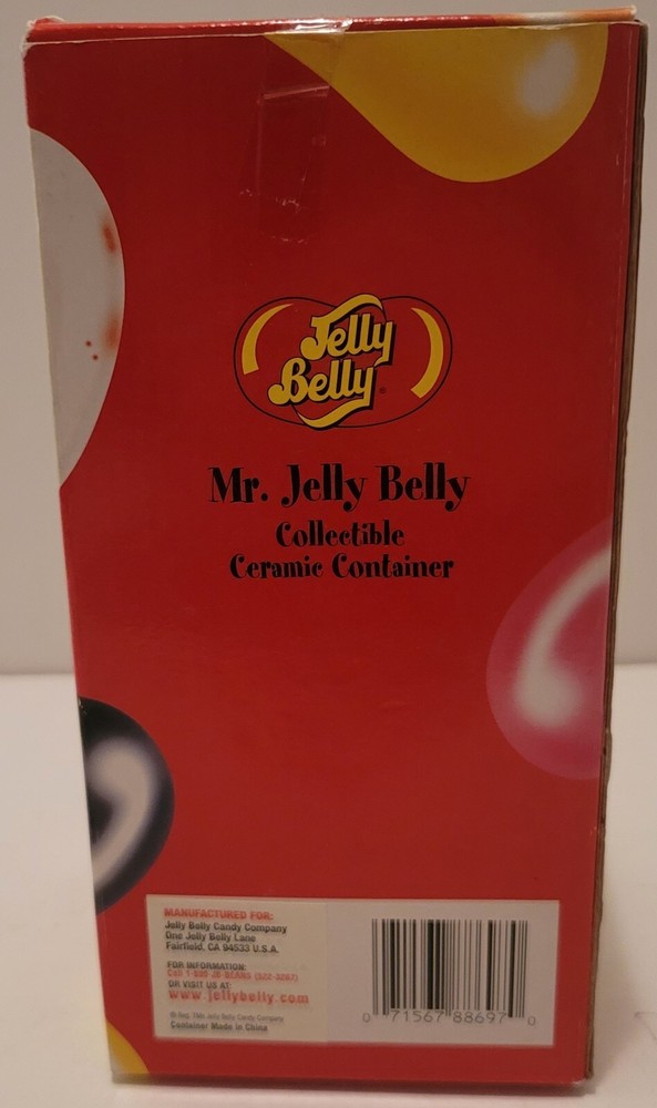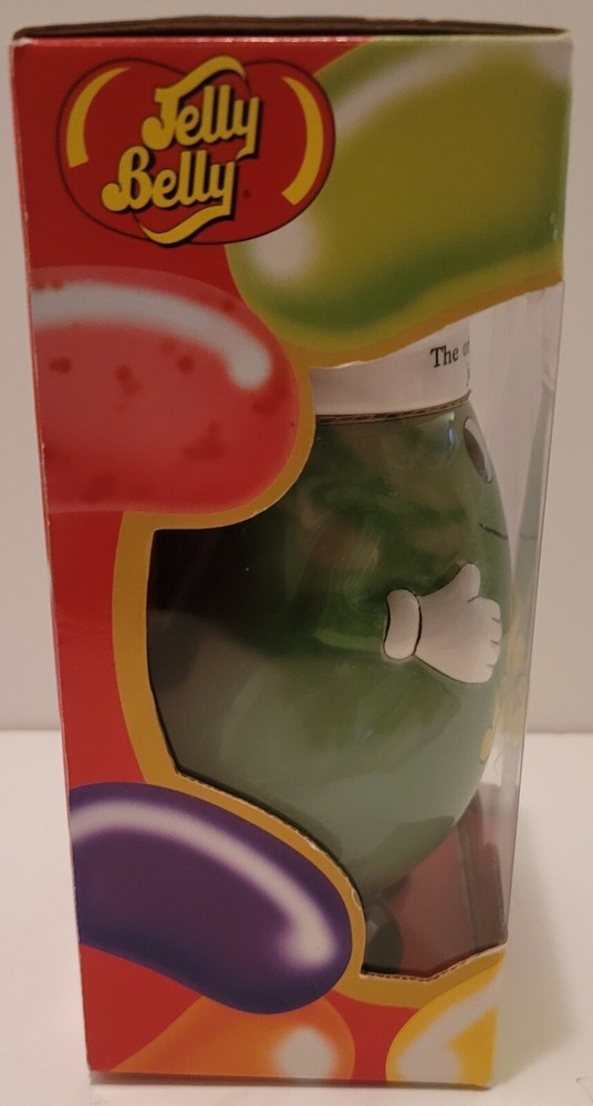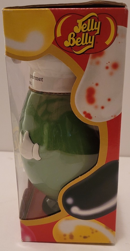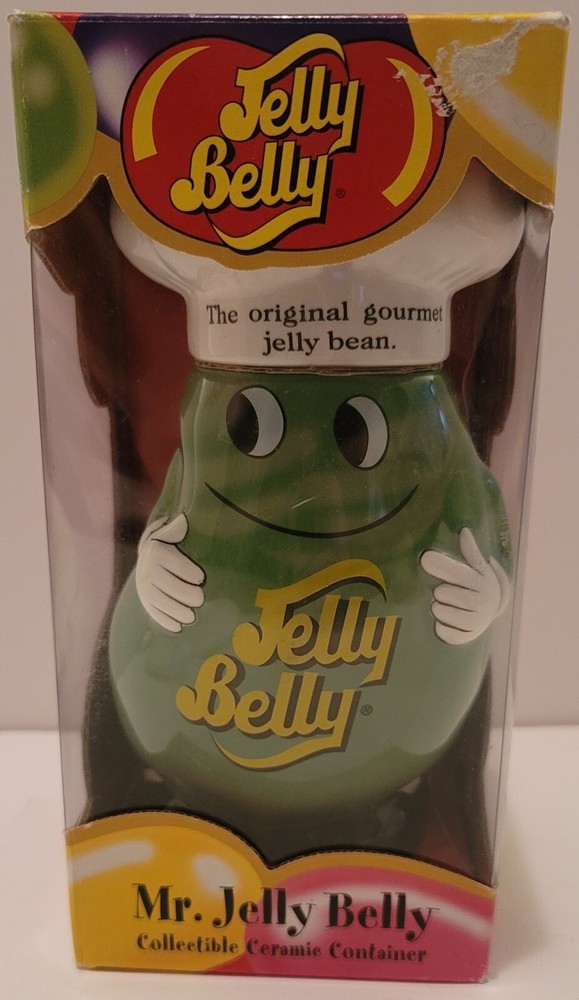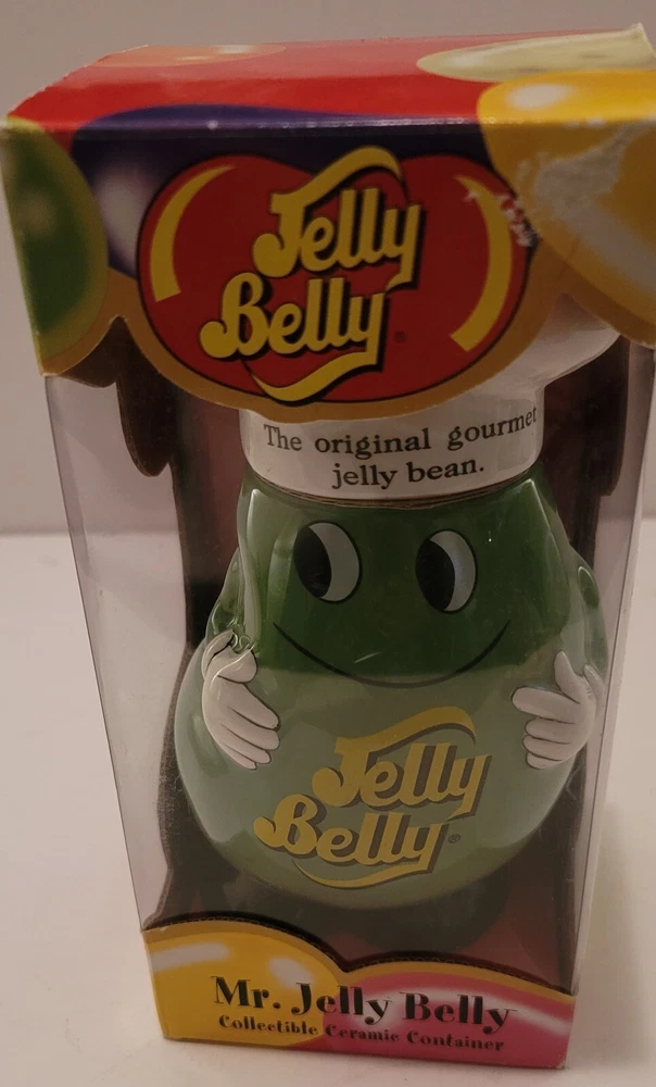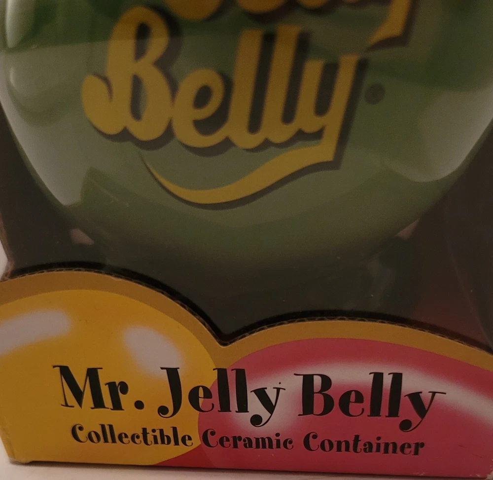Add a sweet touch to your collection with this Mr. Jelly Belly Ceramic Container in Green. The container is perfect for storing your favorite candy and nuts, or for displaying as a charming piece of merchandise. The container is brand new and comes in its original packaging. See all pictures for a closer look at the details.