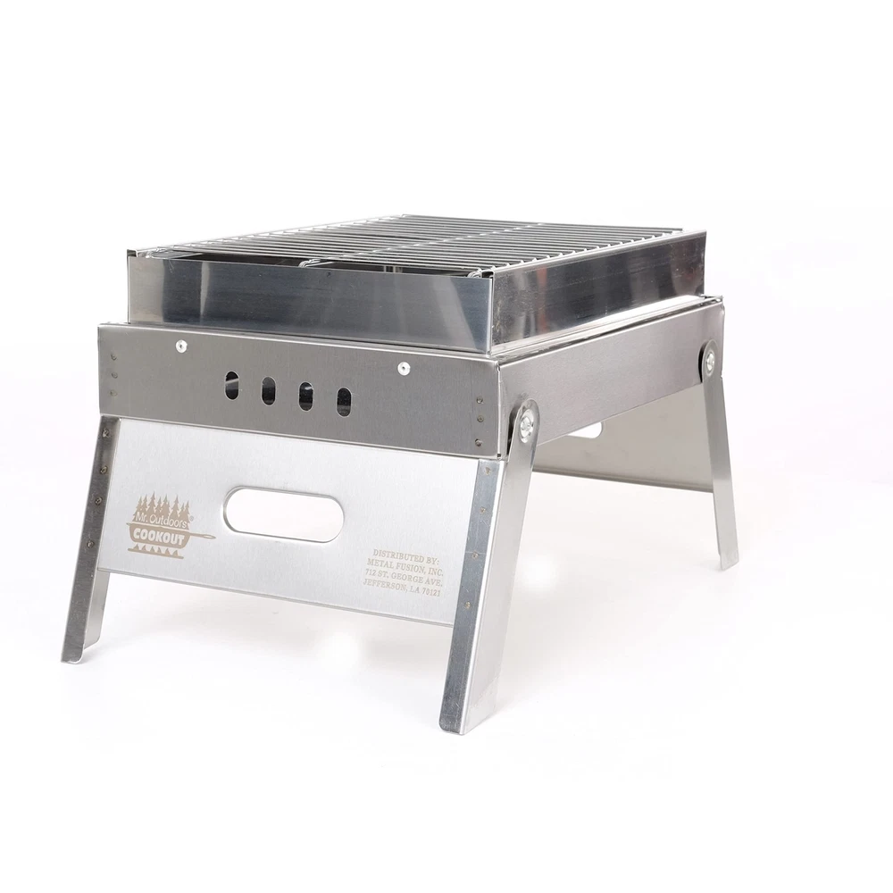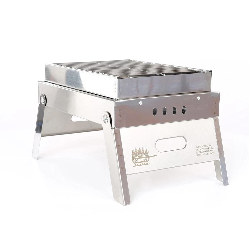 Enjoy easy grilling in the outdoors with a Mr. Outdoors Cookout Stainless Steel BBQ Grill. Great for the campsite and portable for travel! Light compact grill unfolds to 10.5” height with 10” x 14” grill surface. Perfect for 8lb bag of . Packs and stores easily. Fabric carry bag included. Stainless steel, portable grill 10" x 14" grill surface Holds an 8lb. Bag of Light pack, compact breakdown - great for quick trips Fabric carry-bag included