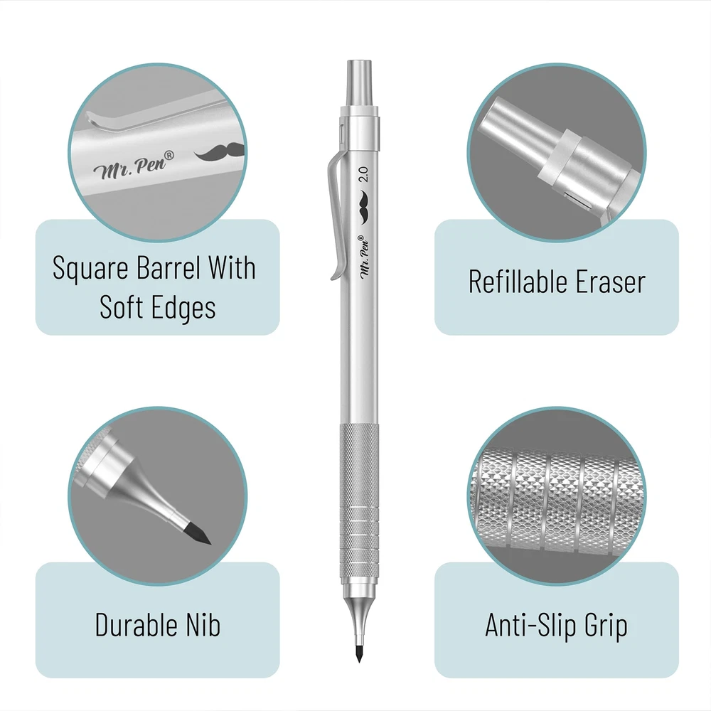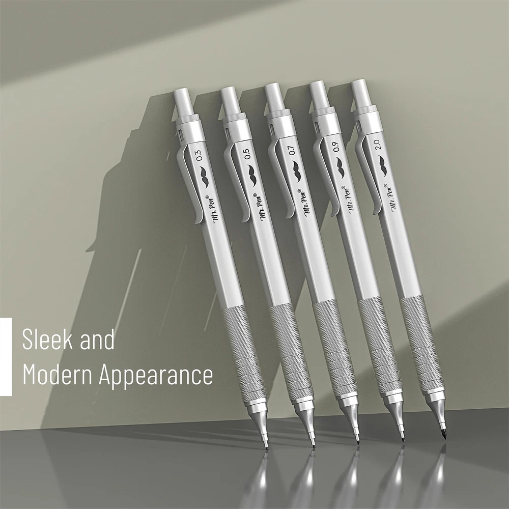 Mr. Pen mechanical pencil set is a complete sketching and drafting kit that includes five mechanical pencils with different lead sizes: 0.3, 0.5, 0.7, 0.9, and 2mm, catering to a wide range of drawing and writing needs. Accompanying the pencils are 6 tubes of lead refills, ensuring long-lasting use. The leads are graded HB and 2B, allowing for a variety of line weights and shades in your work. Each mechanical pencil is crafted with a square barrel and a knurled metal grip for superior control and precision, making them ideal for detailed work in drafting, technical drawing, or general writing. The set comes with 3 high-quality erasers for clean corrections, along with 10 eraser refills, ensuring that your work remains neat and professional-looking over time. All items are neatly organized in a sturdy, compact case, keeping your drafting tools secure and easily accessible, perfect for on-the-go artists, architects, and students. Mr. Pen mechanical pencil set is a complete sketching and drafting kit that includes five mechanical pencils with different lead sizes: 0.3, 0.5, 0.7, 0.9, and 2mm, catering to a wide range of drawing and writing needs. Accompanying the pencils are 6 tubes of lead refills, ensuring long-lasting use. The leads are graded HB and 2B, allowing for a variety of line weights and shades in your work. Each mechanical pencil is crafted with a square barrel and a knurled metal grip for superior control and precision, making them ideal for detailed work in drafting, technical drawing, or general writing. The set comes with 3 high-quality erasers for clean corrections, along with 10 eraser refills, ensuring that your work remains neat and professional-looking over time. All items are neatly organized in a sturdy, compact case, keeping your drafting tools secure and easily accessible, perfect for on-the-go artists, architects, and students.