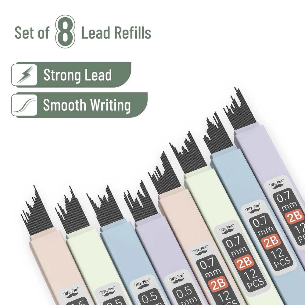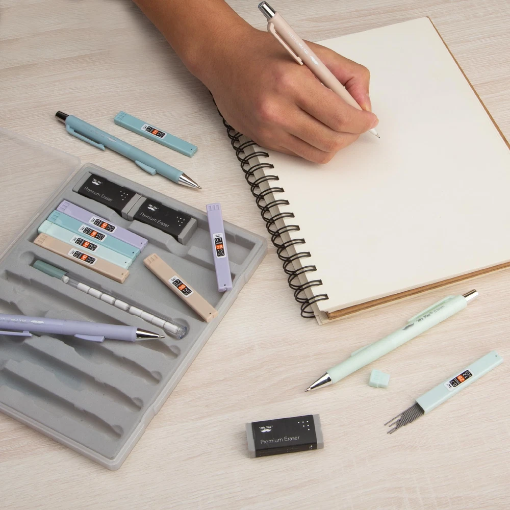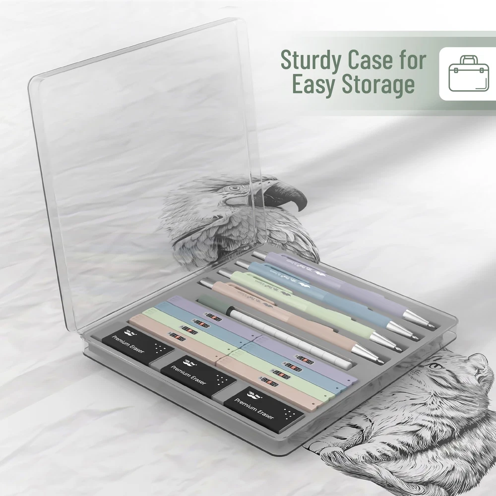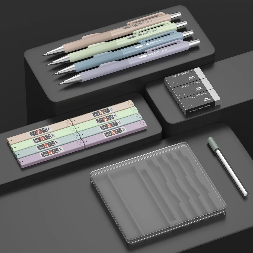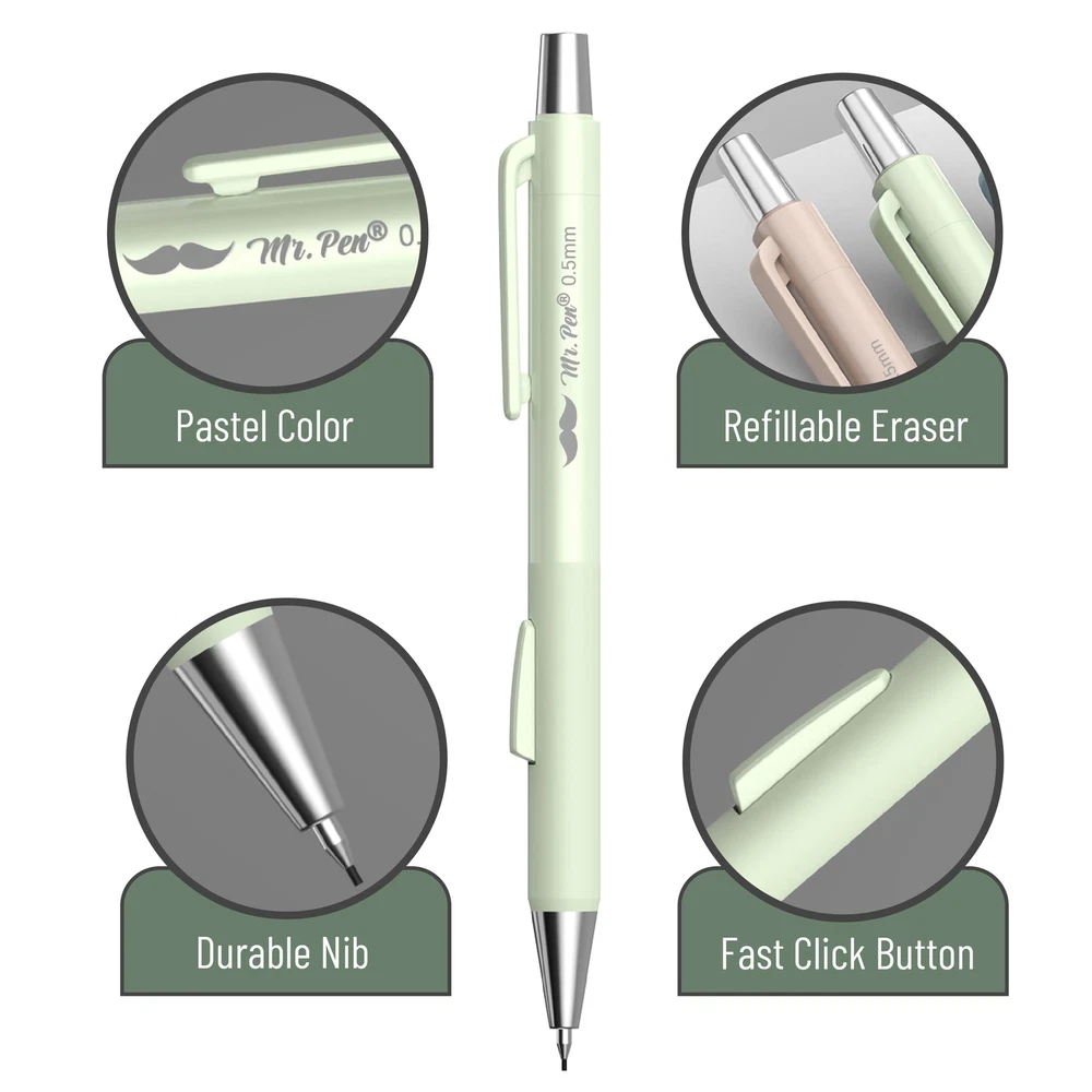 Mr. Pen pastel mechanical pencil set includes 4 quality mechanical pencils in 2 sizes: 0.5 and 0.7 mm; set of 8 lead refills, 3 erasers and 10 eraser refills. Each pencil has a comfortable grip for hours of writing comfort! The mechanical pencil is made of high-quality material. The body provides ideal weight balance for fatigue-free writing and drawing. It brings you more effective and high-quality tasks. Our mechanical pencil set is ideal for school or office use! The set comes packaged in a reusable tray with an easy-to-close lid to keep the pencils organized and protected from damage when not in use! Mr. Pen mechanical pencils set is perfect for everyday use, and they are also great for art and technical drawing. The lead is durable and will not break easily, making them an excellent choice for artists and professionals. These pencils are equipped with a mechanism that allows the lead to retract or extend rapidly. This feature is particularly useful when you need to work quickly, as it saves time and effort compared to traditional pencils that require manual sharpening or refilling. Mr. Pen pastel mechanical pencil set includes 4 quality mechanical pencils in 2 sizes: 0.5 and 0.7 mm; set of 8 lead refills, 3 erasers and 10 eraser refills. Each pencil has a comfortable grip for hours of writing comfort! The mechanical pencil is made of high-quality material. The body provides ideal weight balance for fatigue-free writing and drawing. It brings you more effective and high-quality tasks. Our mechanical pencil set is ideal for school or office use! The set comes packaged in a reusable tray with an easy-to-close lid to keep the pencils organized and protected from damage when not in use! Mr. Pen mechanical pencils set is perfect for everyday use, and they are also great for art and technical drawing. The lead is durable and will not break easily, making them an excellent choice for artists and professionals. These pencils are equipped with a mechanism that allows the lead to retract or extend rapidly. This feature is particularly useful when you need to work quickly, as it saves time and effort compared to traditional pencils that require manual sharpening or refilling.