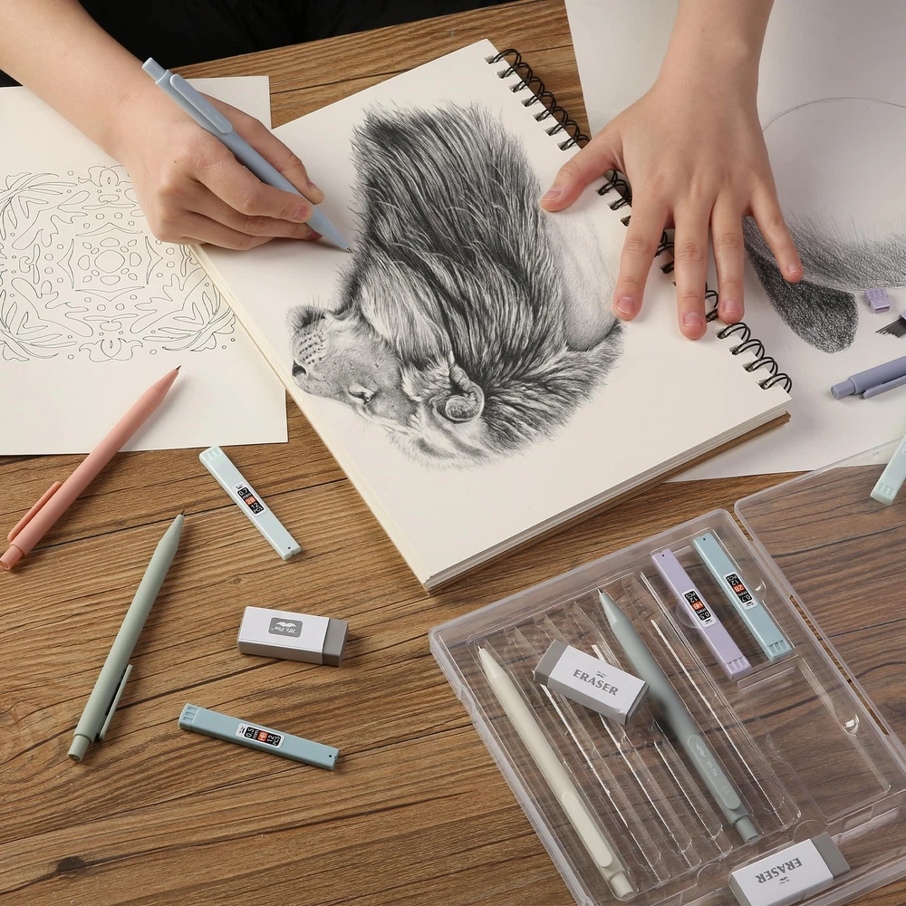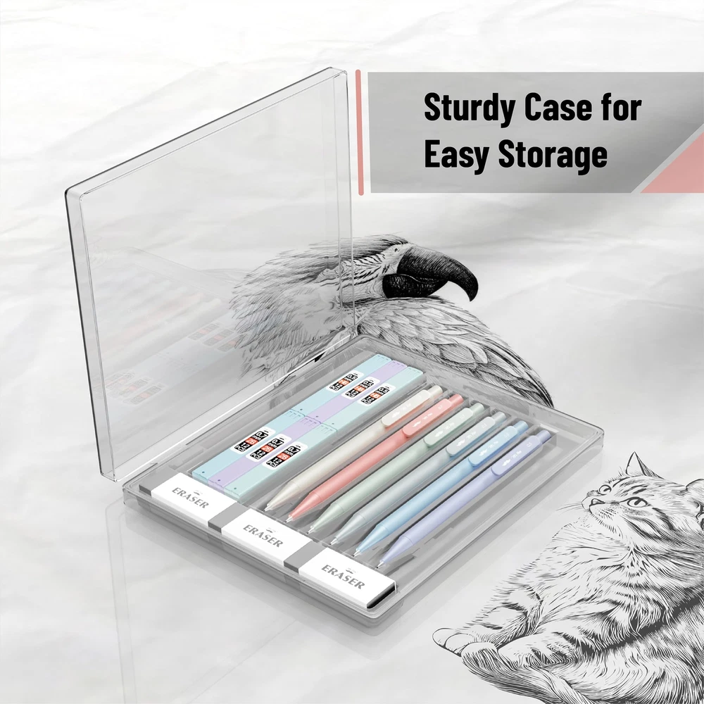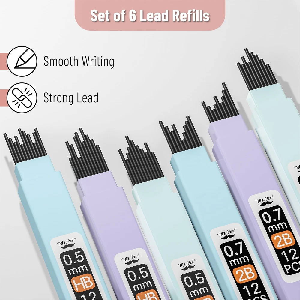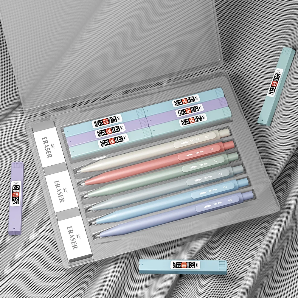 Mr. Pen mechanical pencil set offers a versatile writing experience with three 0.5mm and three 0.7mm pencils, suitable for both fine and broad strokes. These meticulously crafted mechanical pencils provide consistent lead advancement and a smooth writing experience, ensuring precision in every stroke. Accompanying the pencils are 6 lead refills, ensuring you're well-stocked and reducing the need for frequent replacements. Included in the set are 3 standard erasers, designed to effortlessly lift graphite off paper without causing damage. Packaged in a sleek, transparent case, this set is both easy to store and perfect for gifting to students, artists, and professionals. Mr. Pen mechanical pencil set offers a versatile writing experience with three 0.5mm and three 0.7mm pencils, suitable for both fine and broad strokes. These meticulously crafted mechanical pencils provide consistent lead advancement and a smooth writing experience, ensuring precision in every stroke. Accompanying the pencils are 6 lead refills, ensuring you're well-stocked and reducing the need for frequent replacements. Included in the set are 3 standard erasers, designed to effortlessly lift graphite off paper without causing damage. Packaged in a sleek, transparent case, this set is both easy to store and perfect for gifting to students, artists, and professionals.