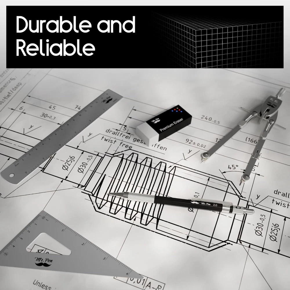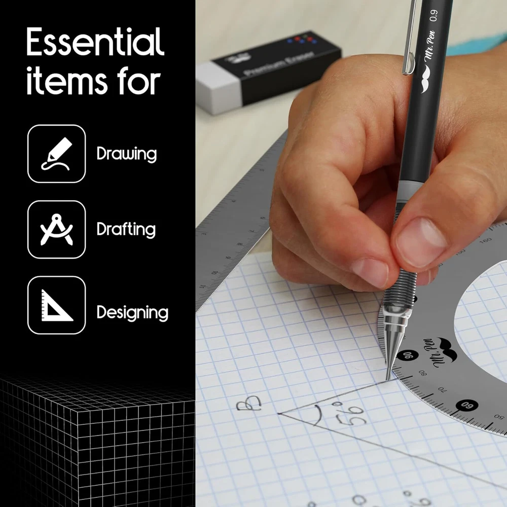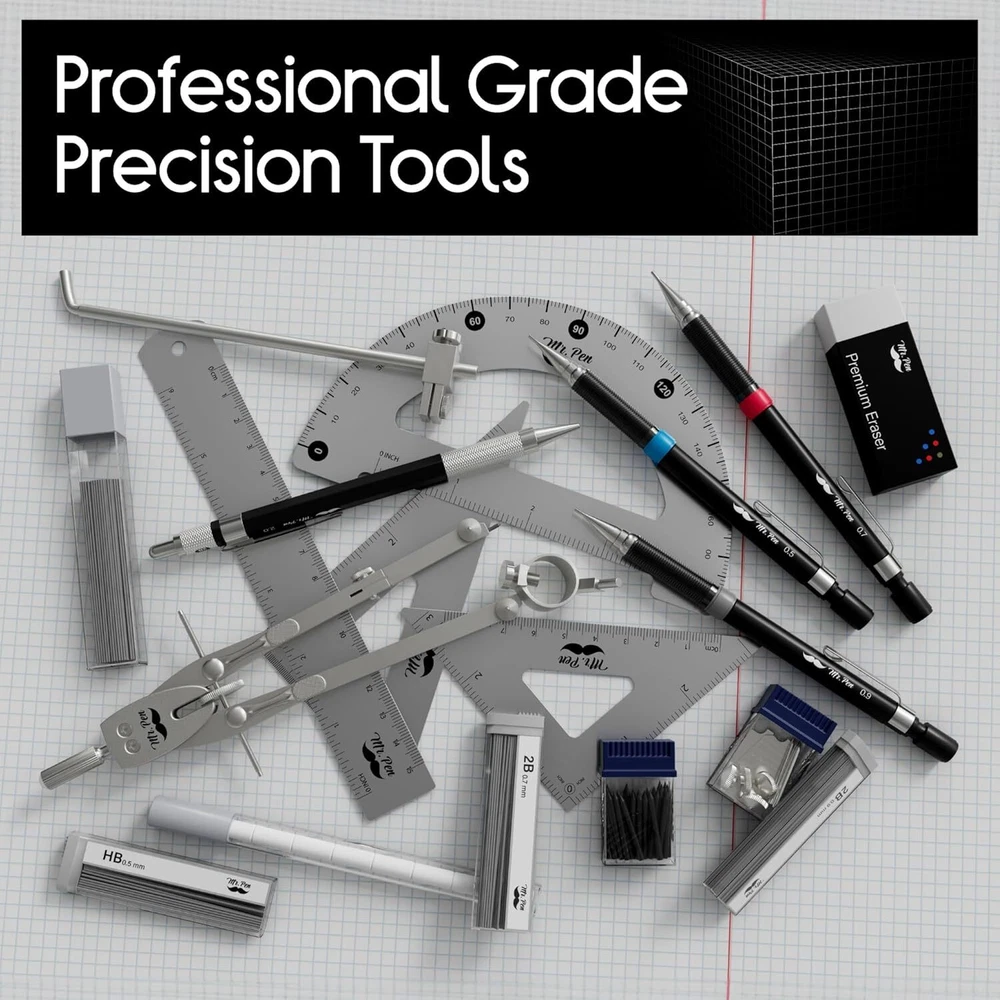 Mr. Pen- Professional Geometry Set, 17 pcs, Silver Geometry Kit for Artists, Metal Rulers and Compasses, Mechanical Pencil Set, Drafting Tools & Drafting kits, Metal Compass and Protractor Set Product Details Manufacturer: Mr. Pen Brand: Mr. Pen Item Weight: 1.3 pounds Package Dimensions: 13.74 x 9.06 x 0.87 inches Item model number: EEEG007M311 Material Type: Metal Point Type: Broad Line Size: 0_5mm, 0_7mm, 0_9mm, 2mm Manufacturer Part Number: EEEG007M311 Brand: Mr. Pen Writing Instrument Form: Mechanical Graphite Pencil Age Range (Description): Kid, Adult Material: Metal Point Type: Broad Mr. Pen mechanical pencil set includes 4 versatile sizes (0.5, 0.7, 0.9, and 2mm) to cater to a wide range of drawing and writing needs, providing precision and versatility for technical drawings, sketches, and general writing. Crafted with a robust construction, these mechanical pencils offer a balanced weight that ensures comfortable handling and reduced fatigue during long drawing sessions or extensive writing work. This set is not just about pencils; it also includes a metal compass with an extension leg, extra screws and needles, eraser refills, and four tubes of lead refills, making it a complete package for professionals and students alike. For detailed measurement and drawing, the set comes equipped with a metal protractor, a 6-inch metal ruler, and two set squares (45° and 30°/60°), enhancing the functionality for all levels of drafting and design projects. Everything is neatly organized in a sturdy case, ensuring that all tools are secure and easily transportable, making it an ideal choice for architects, engineers, artists, and anyone who desires a reliable and comprehensive drawing toolkit. Mr. Pen mechanical pencil set includes 4 versatile sizes (0.5, 0.7, 0.9, and 2mm) to cater to a wide range of drawing and writing needs, providing precision and versatility for technical drawings, sketches, and general writing.Crafted with a robust construction, these mechanical pencils offer a balanced weight that ensures comfortable handling and reduced fatigue during long drawing sessions or extensive writing set is not just about pencils; it also includes a metal compass with an extension leg, extra screws and needles, eraser refills, and four tubes of lead refills, making it a complete package for professionals and students detailed measurement and drawing, the set comes equipped with a metal protractor, a 6-inch metal ruler, and two set squares (45° and 30°/60°), enhancing the functionality for all levels of drafting and design projects.Everything is neatly organized in a sturdy case, ensuring that all tools are secure and easily transportable, making it an ideal choice for architects, engineers, artists, and anyone who desires a reliable and comprehensive drawing toolkit.