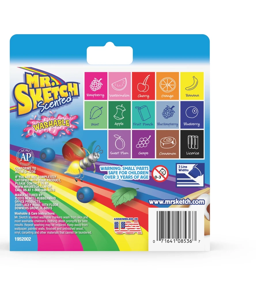 Unleash your child’s imagination into a world of cinnamon scented giraffes and orange coated airplanes with Mr. Sketch Scented Washable Markers. The captivating aromas and vibrant colors are sure to inspire creativity. The scented markers feature a thick barrel that’s easy for kids to grip and a versatile chisel tip that delivers three line widths. That means your budding artist can confidently pivot between a precision point and bold strokes. So gather around the table and let the scents inspire your family’s creations. Unleash your child’s imagination into a world of cinnamon scented giraffes and orange coated airplanes with Mr. Sketch Scented Washable Markers. The captivating aromas and vibrant colors are sure to inspire creativity. The scented markers feature a thick barrel that’s easy for kids to grip and a versatile chisel tip that delivers three line widths. Colors are bright and vivid, but wash easily from hands, and most clothing The smooth-flowing bevel-tip makes sketching easier and draws in fine, medium, or wide lines Safe for children over 3 years of age, AP certified Each color has its own fun scent that stays even after the ink dries so your markers keep smelling as good as they look