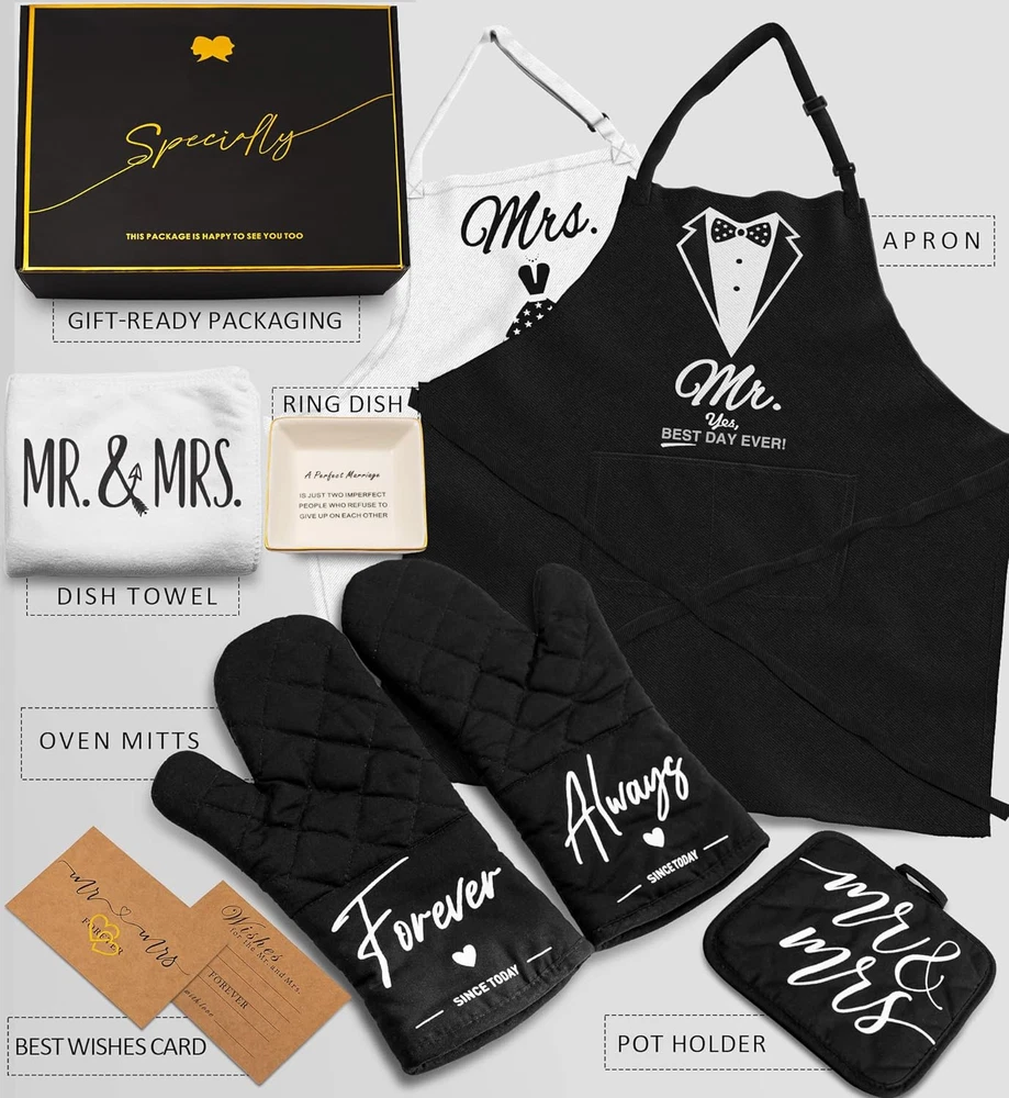Store New Arrivals Add to Favorite View Feedback Contact Fast deliveries to the customer's home Quality customer service John Make the customers happy! Mr and Mrs Aprons for Couples Gifts - Anniversary, Bridal Shower, Wedding, Engagement Gifts for Couples, Christmas Gifts for Couple, His and Her Gifts, 8 Pack Kitchen Cooking Apron Gift Set Description MR AND MRS APRONS FOR COUPLES GIFTS - Apron gift sets contains the functional oven mitts, jewelry tray, dish towel & the couples aprons. Husband and wife apron set are printed with MR MRS. These durable aprons have an adjustable neck and waist sizes. Never have to worry about what size to wear. This apron couple gift will definitely put a smile on their face and it also become an important factor on their happy daily life COOL GIFTS FOR COUPLES - Our delicate crafted couples gift set will be loved by every newlyweds couple at first sight. The gift basket come with a best wishes greeting card, You can write your blessings by hand, wife husband, couple and bride groom will be absolutely love them. Unique gift basket can be used as engagement wedding anniversary, Valentines day, birthday, Christmas gift to celebrate from friends, and it can be for her/him, husband/wife Fiancé/Fiancée GIFTS FOR COUPLES WHO HAVE EVERYTHING - Mr and Mrs apron gift set is made of durable soft cotton & polyester fabrics do not shrink. It can be worn while doing housework, gardening, painting and baking, effectively preventing oil stains from staining clothes. Machine washable. The couple’s apron has large pockets, adjustable straps, and the size is suitable for most people. Marble ring trinket dish in the set is made of high quality glazed ceramic which makes the couples ring dish textured and sh CHRISTMAS GIFTS FOR COUPLES - Never worry about not having a suitable choice for Housewarming gifts, Anniversary gifts, Valentines Day gifts, Christmas gifts, bridal shower gifts, wedding gifts... Mr and Mrs aprons gift set is perfect couples gifts for her/him, husband/wife Fiancé/Fiancée. Your girlfriend, boyfriend, wife, husband, partner, best friend, and family members will have a great laugh Product Description Couples That Cook Together, Love forever What’s better than give the couple a great matching apron of “Mr. & Mrs”to help them spending the happy cooking time together. This great quality polyester blend & one-size-fits-all apron is the best choice to protect the clothes from getting hurt or getting dirt! COOL GIFTS FOR COUPLES Our delicate crafted couples gift set will be loved by every newlyweds couple at first sight The gift basket come with a best wishes greeting card, You can write your blessings by hand, wife husband, couple and bride groom will be absolutely love them. Unique gift basket can be used as engagement wedding anniversary, Valentines day, birthday, Christmas gift to celebrate from friends, and it can be for her/him, husband/wife Fiancé/Fiancée Made from Thicker Version Material Waterproof for Better Protection 2 Divided Large Pockets Adiustable Neck Strap & Waist Ties Adjust to Your Comfortable Sizes Original Design & Unique Couples Gifts Engagement/Wedding/Anniversary Kitchen gifts Style 8 PACK Needlework Knitting Number Of Sets 8 Finish Type Waterproof Package Dimensions 12.8 x 10.51 x 2.91 inches; 2.65 Pounds Number Of Pieces 8 ABOUT US We offer the best prices around on high quality products. Our E-store includes media such as books, movies, music and games while offering electronics, toys, sporting apparel, clothing, tools, general home, garden items and more. SHIPPING We are always working hard to ensure your package arrives as soon as possible. Please understand that some factors like weather, high postal traffic, and the performance of shipping companies are outside of our control. We offer free shipping to the lower 48 states and ship within 2 business days of payment, usually sooner. We do not accept P.O. Boxes. Please provide a physical address. For shipping outside of the continental USA, we only use eBay's Global Shipping Program. The item is shipped to KY and then sent to the rest of the world. International customers are responsible for all duties and taxes. Continue to 'check out' to calculate costs for shipping the item to your country. Messages regarding eBay's Global Shipping Program MUST be directed at eBay EXCLUSIVELY. RETURNS We offer a 30-Day Return Policy on items in which you are not completely satisfied with. You have the option of a full-refund or an exchange of the item. No returns are available on items shipped outside of the USA PAYMENT We accept PayPal. CONTACT US This page content is yet to come Please ad us to your favorite seller and visit again later Thank You CUSTOMER SATISFACTION We try our very best to make sure every customer is completely satisfied. If there's a problem, message us! We're happy to help. WE ACCEPT