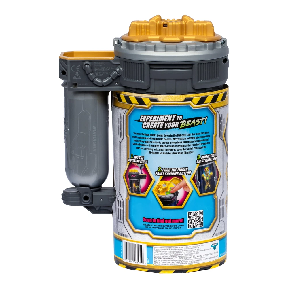 Introducing the MrBeast Lab Mutators - Golden Panther. Taking the thrill of experimentation to a whole level, you now have the chance to Create Your very own MrBeast-inspired action figure. The MrBeast Lab Golden Panther, stands at 5.5" (13cm) tall, boasts over 20 points of articulation and is crafted to incorporate a shiny, Golden finish. To create the MrBeast Lab Golden Panther, add the mutation liquid to the chamber, press the fingerprint scanner, and watch as your panther reveals itself and is brought to life. There are four MrBeast Lab Mutators to collect, including: Iconic, Golden, Stealth, and Metallic. Perform the experiment, reveal your Metallic Panther, and let the extraordinary adventure commence with the MrBeast Lab Mutators. On Oct 15, 2024 at 08:34:37 PDT, seller added the following information: