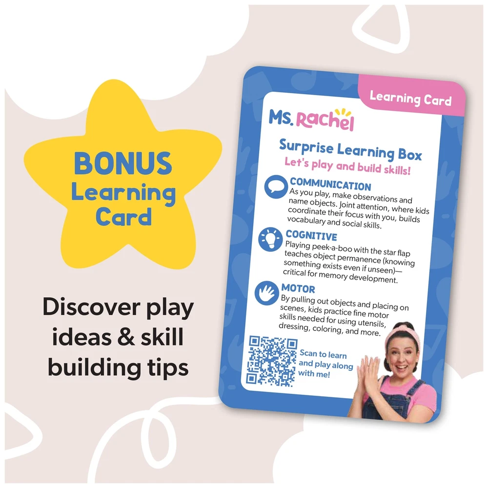 Playtime for baby is full of fun with the Ms. Rachel Surprise Learning Box! Inspired by Ms. Rachel’s popular baby and toddler videos, designed to nurture early developmental milestones like animal and object recognition while honing fine motor skills like pinching and grabbing. The baby-safe toy box features four interactive learning scenes and six soft surprise accessories, including a plush teddy bear, satin scarf, and more. Prompt interactions & encourage early speech development with the bonus learning card, featuring play tips and skill-building activities. Created using super-soft fabric, by the makers of GUND Baby, use at home and on the go as infant travel toys as newborn gifts, your baby nursery, or as a birthday baby gift! This baby-safe toy is designed by Ms. Rachel and developmental experts, to support all children, from 3 months up. These are awesome newborn toys, toddler toys, preschool toys, and toys for ages 2-4 along with Montessori toys & Miss Rachel dolls. From baby shower gifts to baby essentials, these products help babies and families learn, bond, and thrive. Ms. Rachel is a real teacher and passionate educator, with two master’s degrees in education – who creates research-based videos and products to support learning for littles. OFFICIAL MS. RACHEL SENSORY TOYS: Interactive “Surprise Box” with 4 learning environments and 6 plush accessories (teddy bear stuffed animal, bunny, bus, scarf, plush carrot and bubble gum) for sensory fun PEEK-A-BOO FUN: Lift the flap as babies enjoy the excitement of discovery play, pulling out surprises from the box and enhancing their grasp & fine motor skills by placing them in play environments VOCABULARY DEVELOPMENT: Encourage communication skills by saying, "What's in the box, what could it be?" as baby pulls out objects. Bonus learning card has even more play ideas and skill-building tips HOLIDAY GIFTS FOR KIDS: When shopping for Christmas toys from Santa, give the Christmas gift of fun and learning as stocking stuffers for kids that are fans of Ms. Rachel toys KIDS CHRISTMAS GIFTS: Ms. Rachel baby toys & toddler toys like dolls, plushies, blocks & puzzles are Christmas presents & baby shower gifts that little ones are sure to love this holiday season Includes: 1 Soft Box. 1 Satin Scarf, 1 Plush Bean, 1 Plush Bunny, 1 Plush Carrot, 1 Plush Bus, 1 Plush Gum, 1 Learning Card Covered by the Spin Master Care Commitment. See below for full details