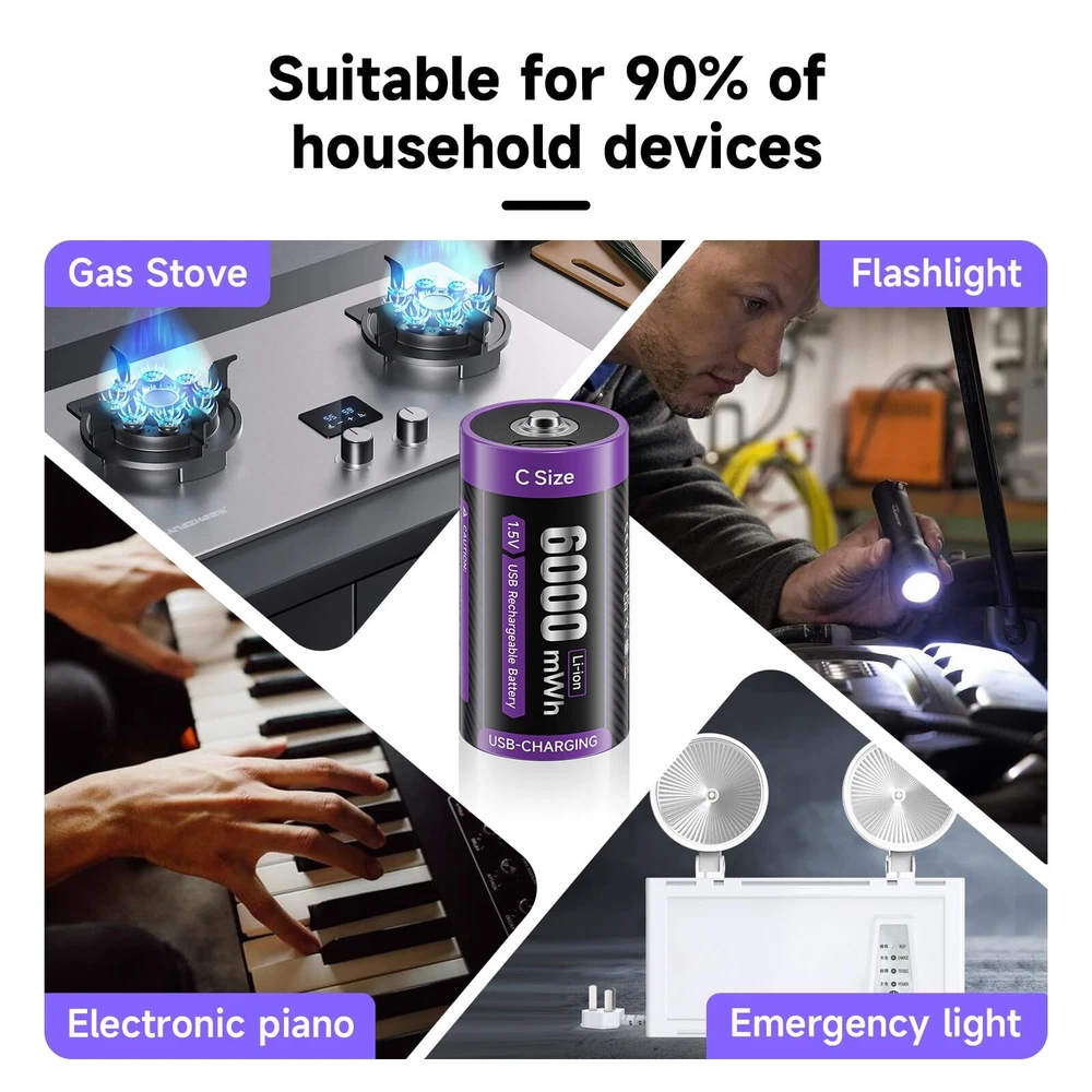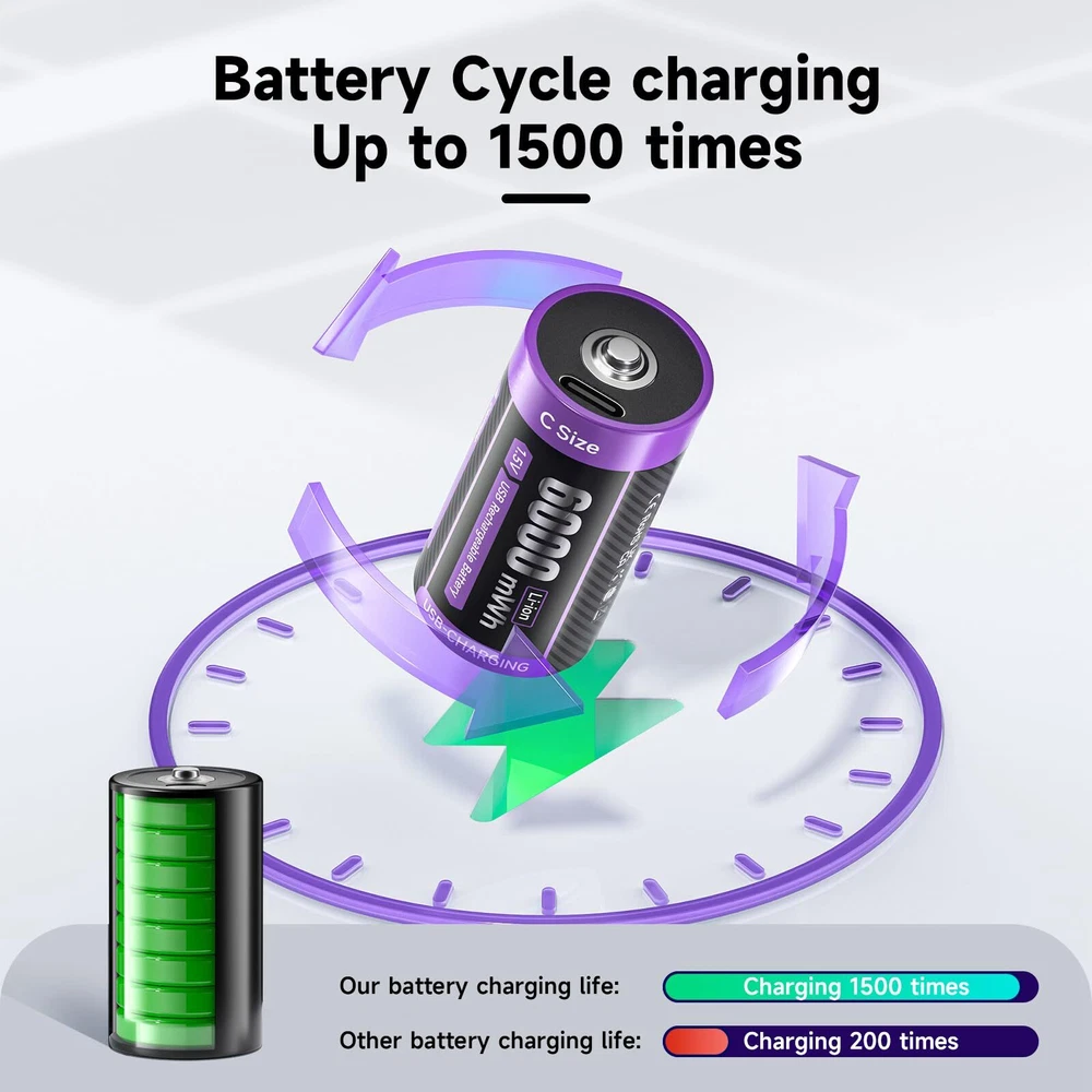 【High Quality C BATTERY】High Quality Rechargeable Lithium ion C Cell Batteries Have Long Lifetime,It Can Be Charged 1500 Times,1 pcs D Rechargeable Battery Equal 1500+pcs Disposables Alkaline D Battery. 【LED INDICATORS MANAGEMENT】When charging, the green LED will blinks and will then LED remains on once it is fully charged. 【MULTIPLE SAFE PROTECTION】Built-in Integrated safety circuit protects Battery from over discharge/overcharge,when the battery is fully charged,Effectively Prevent Overcharge, Overcurrent, Over-voltage, Overheat, and Short Circuit Conditions. 【ENERGY SAVING & ECO FRIENDLY】Mercury, cadmium and lead are not used in these C lithium small batteries, saving thousands of alkaline batteries and reducing a significant about of landfill waste. 【Compatibility】Power up any device that uses standard C batteries, including flashlights, transmitters, , radio receivers, boomboxes, toys and other electronics for long lasting, dependable operation.
