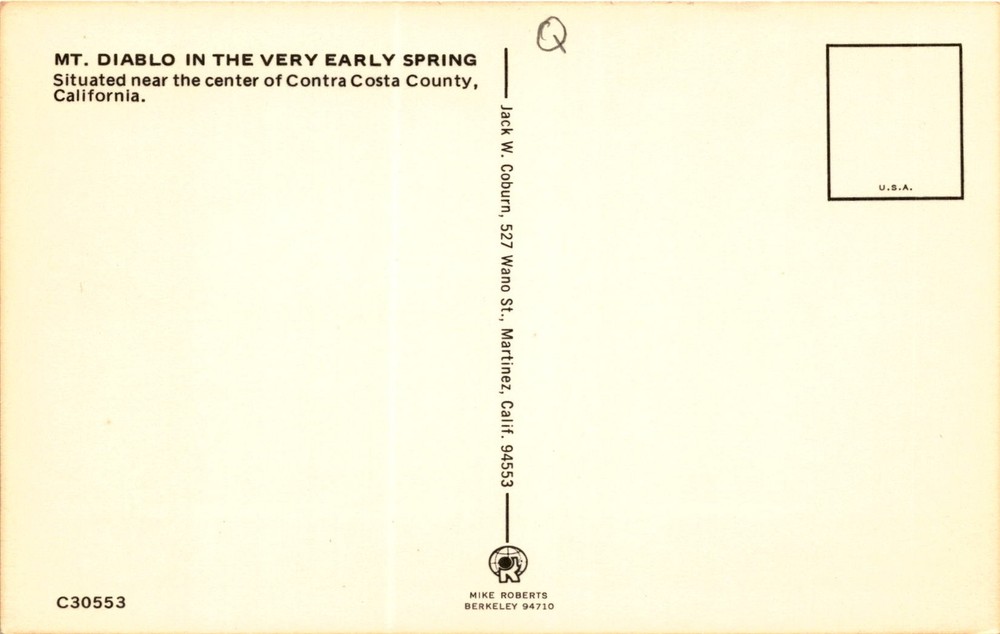 MAKE AN OFFER. THE MORE YOU BUY THE BETTER DEAL I WILL ACCEPT The postcard features a view of Mt. Diablo in the very early spring. Mt. Diablo is located near the center of Contra Costa County, California. The postcard was published by Mike Roberts in Berkeley, California. The sender of the postcard is Jack W. Coburn from Martinez, California.Mt.