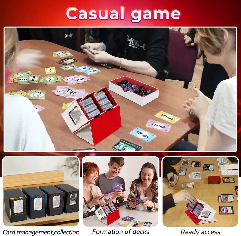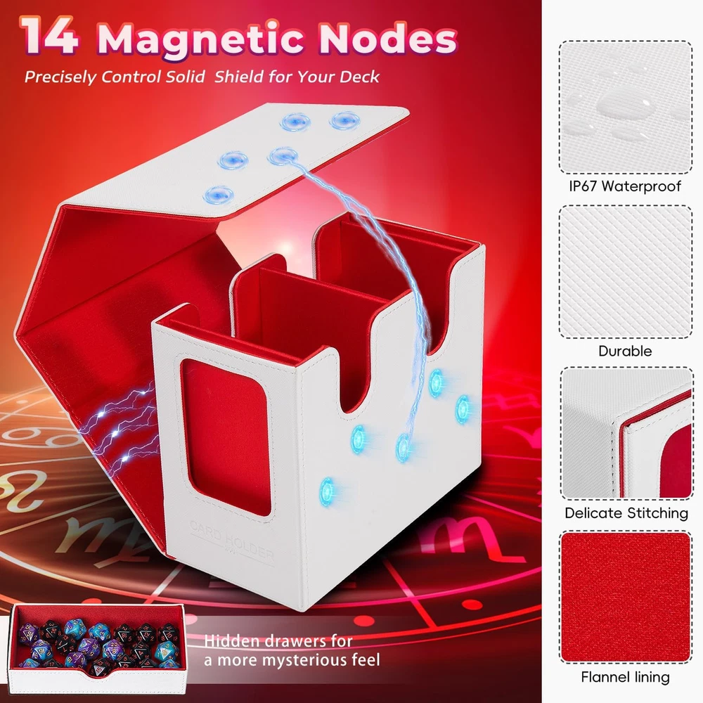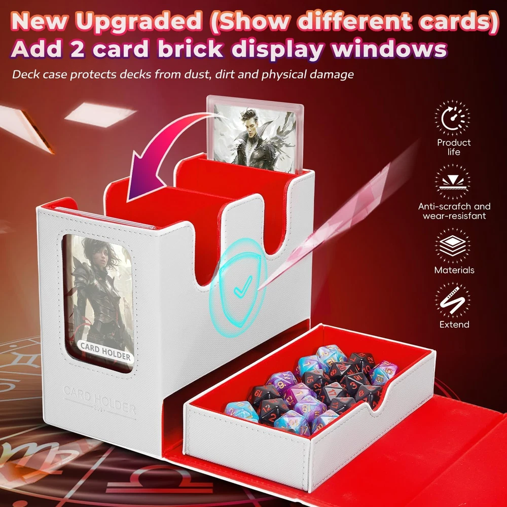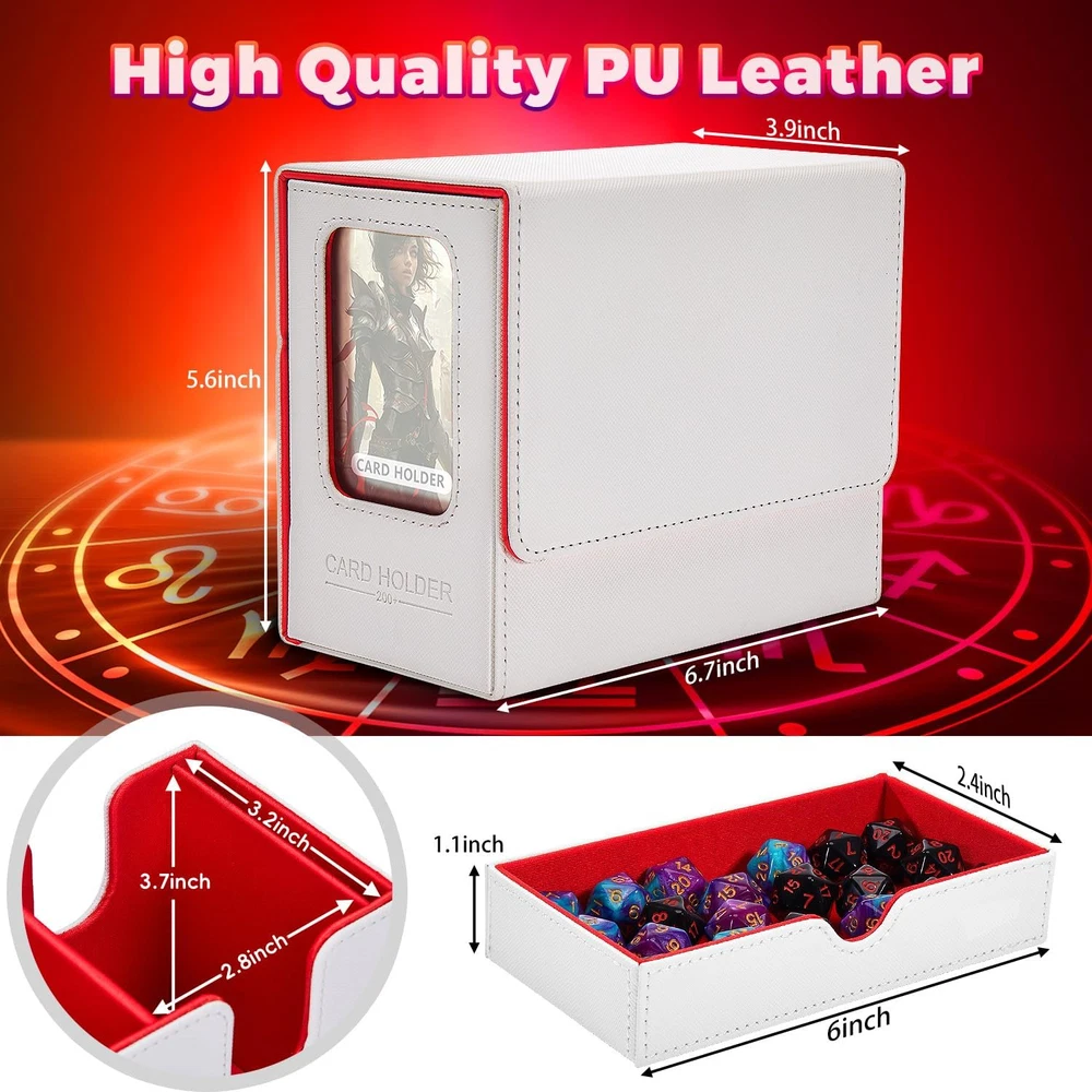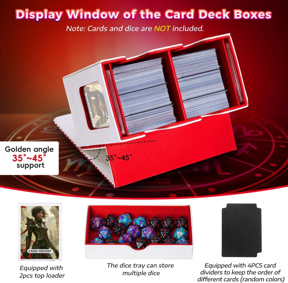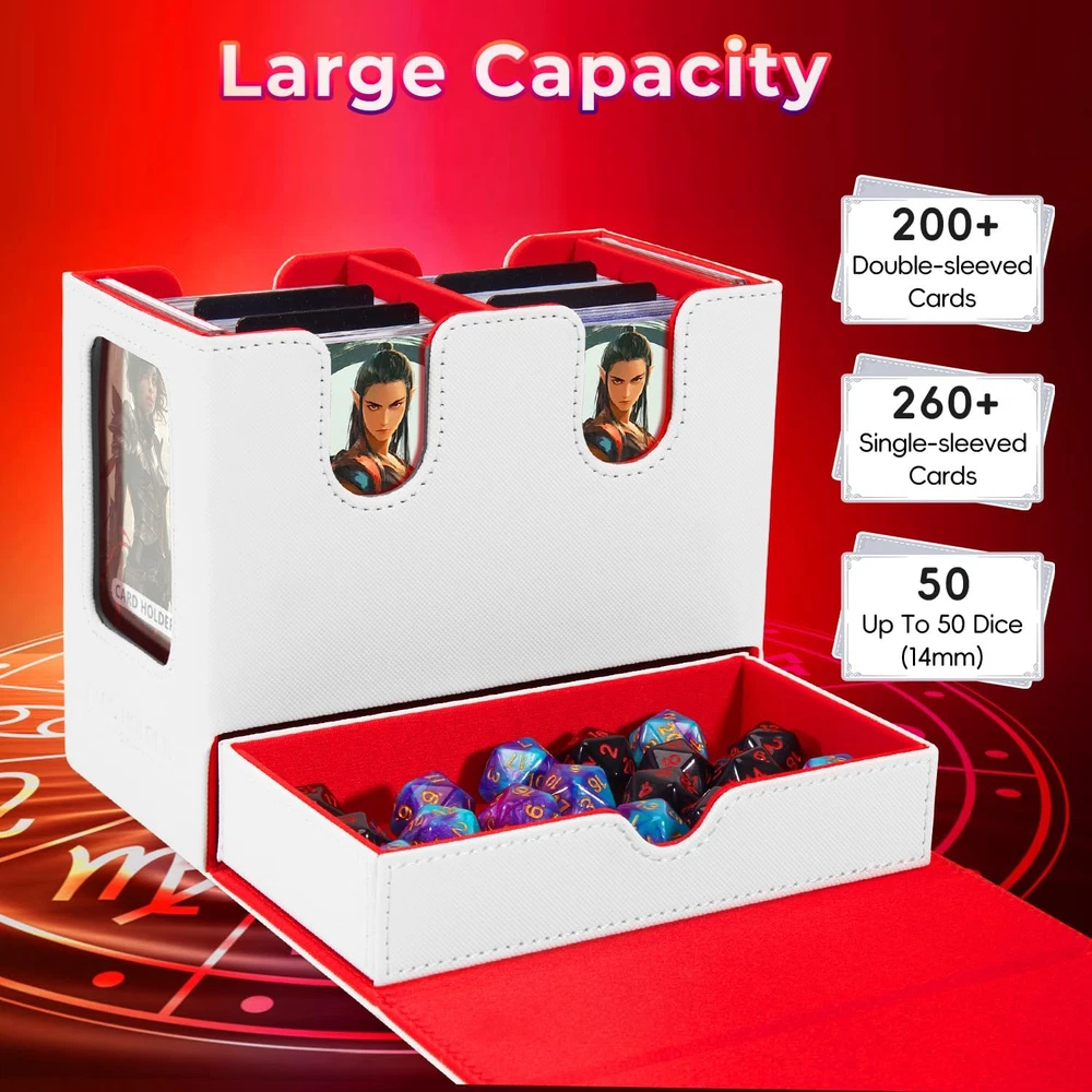 ๐๐จ๐ฏ๐๐ฅ ๐๐๐ฌ๐ข๐ ๐ง: Tailored for edh/commander players, our DaluRunhe deck box features 2 display window to showcase or conceal your cards,it includes a removable dice tray,4 card compartments,and 2 slots for secure leader card storage for mtg card deck box commander ensuring quick deck access and easy identification. ๐๐ซ๐๐๐ข๐ง๐ ๐๐๐ซ๐ ๐๐ญ๐จ๐ซ๐๐ ๐ ๐๐จ๐ฑ:Deck boxes cards holds 200 double-sleeved cards and tokens or 260 single-sleeved cards,includes a drawer for dice (up to 50 dice (14mm))for mtg deck boxes commander,measures 6.7X3.9X5.6 inch,comes with 4pcs card splitter,2pcs top loader card storage. ๐๐๐ ๐ข๐ ๐๐ซ๐๐ฆ๐ข๐ฎ๐ฆ ๐ช๐ฎ๐๐ฅ๐ข๐ญ๐ฒ: This card deck storage box durable pu leather with scuff-proof for mtg commander deck box,exterior and soft microfiber lining guards your cards,the u-shaped opening allows easy access,portable and stylish,this piece makes a perfect ornamental gift,deck cases itโฒs both practical and refined. ๐๐๐ฅ๐ข๐๐๐ฅ๐ ๐๐๐๐ฎ๐ซ๐ข๐ญ๐ฒ: The deck box features a strong magnetic closure that keeps your card game storage cards securely in place,even during rough handling,it offers easy access to your cards while ensuring they stay protected and organized during transport,additionally,protection safeguards your sards from fading,maintaining their pristine condition. ๐๐๐ฌ๐ฒ ๐๐ซ๐ ๐๐ง๐ข๐ณ๐๐ญ๐ข๐จ๐ง:Equipped with a dedicated commander card slot,you can quickly view the box contents without opening the box,perfect for mtg,ptcg,tcg collectors,bulk card storage,playing card storage box,deck case keeping your collection organized has never been easier. Product Description