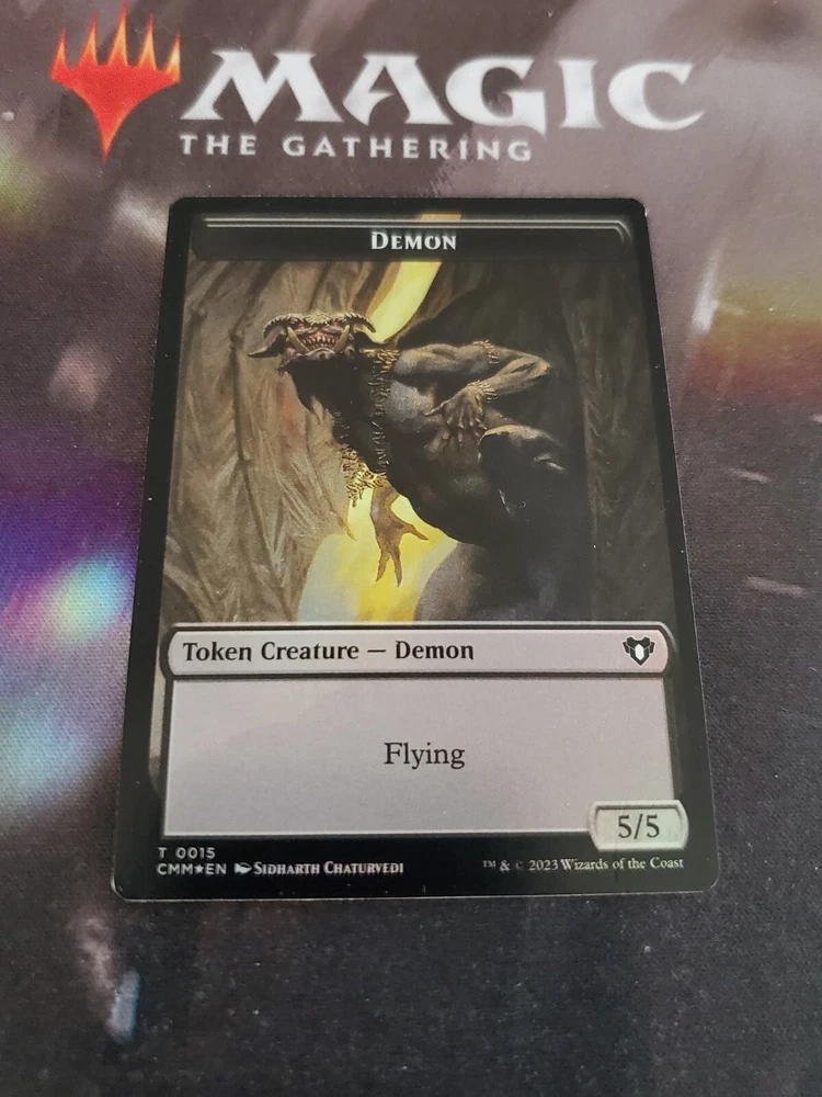 This Magic: The Gathering double-sided token card features a stunning design of a Treasure on one side and a menacing Demon on the other. The card has a beautiful foil finish which adds to its overall appeal. It is a rare card from the Commander Masters set and is in near mint or better condition. As an ungraded token card, it is perfect for collectors and players alike. The card is perfect for those who are looking to add a unique and valuable piece to their collection. It can also be used for gameplay, adding to the excitement and thrill of the game. Don't miss this opportunity to own this rare and exquisite token card for your collection.
