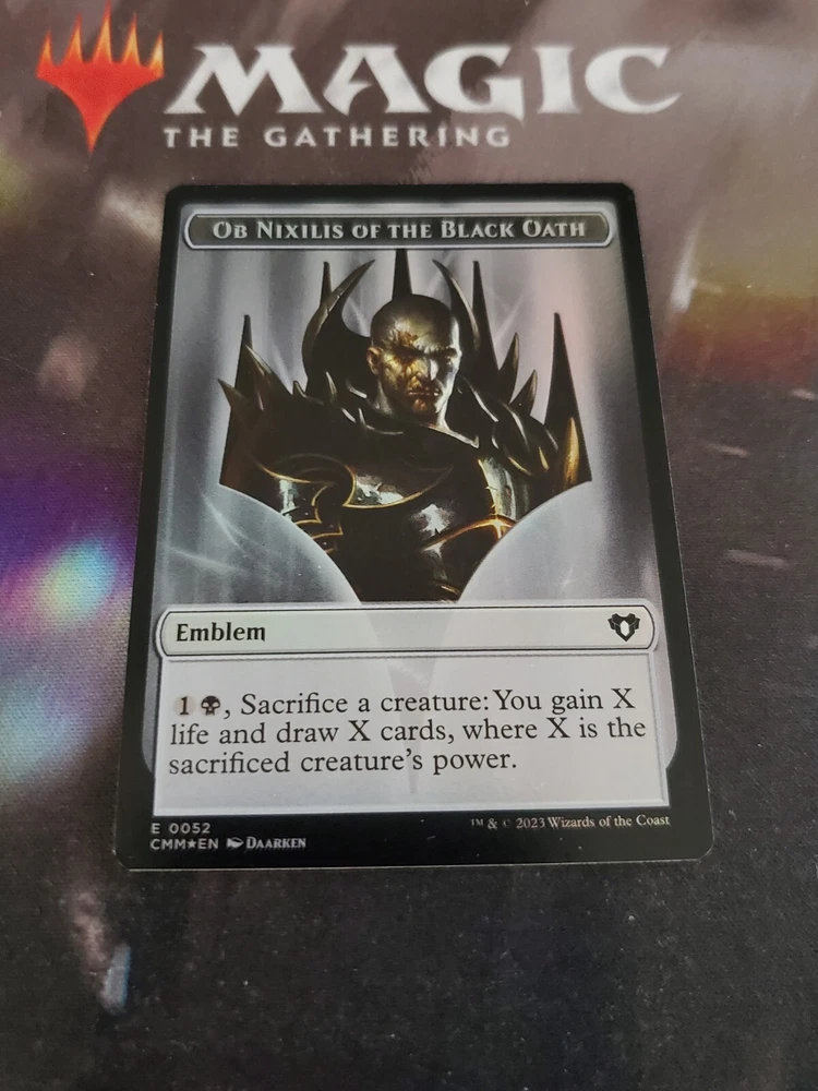 For sale is a Magic: The Gathering token card named Treasure featuring Ob Nixilis Of The Black Oath. This double-sided token is from the Commander set and has a foil finish. The card is in near mint or better condition and is ungraded. Perfect for collectors of Magic: The Gathering cards, this Treasure token is a rare find.