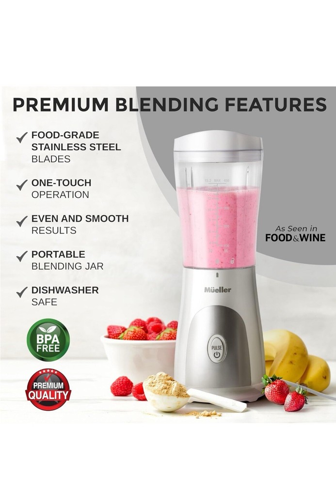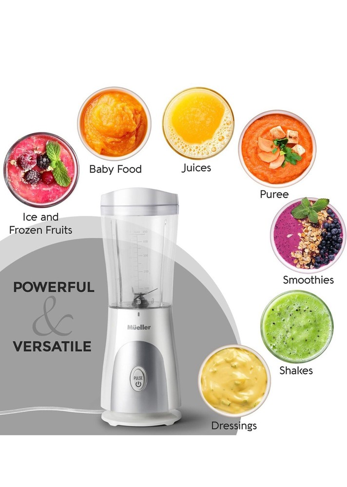 Mueller Personal Blender for Shakes and Smoothies with 15 Oz Travel Cup and Lid, Juices, Baby Food, Heavy-Duty Portable Blender & Food Processor, White (Blender Only)