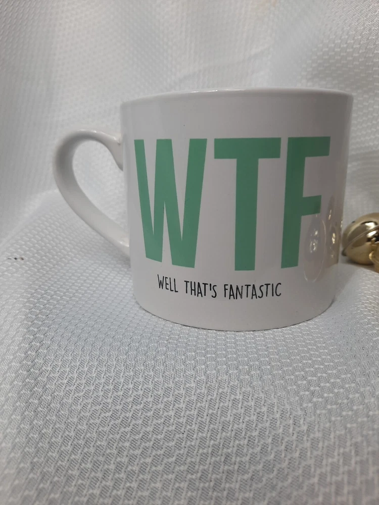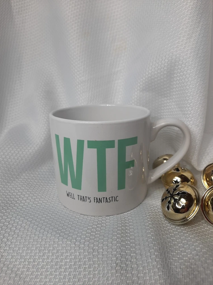 This classic white mug from Classic Solutions is perfect for all occasions. With a capacity of 11 fl oz, it is ideal for your favorite hot beverages. The mug features a novelty pattern with the words WTF "Well That's Fantastic" printed on it, making it a great addition to your collection. Crafted from high-quality ceramic, this mug is durable and microwave safe. It has a round shape and measures 3.5 inches in height and 4 inches in width, weighing 1.5 lbs. The mug is decorated and suitable for hot beverages, making it a great choice for family and friends, as well as for Christmas and other holidays.