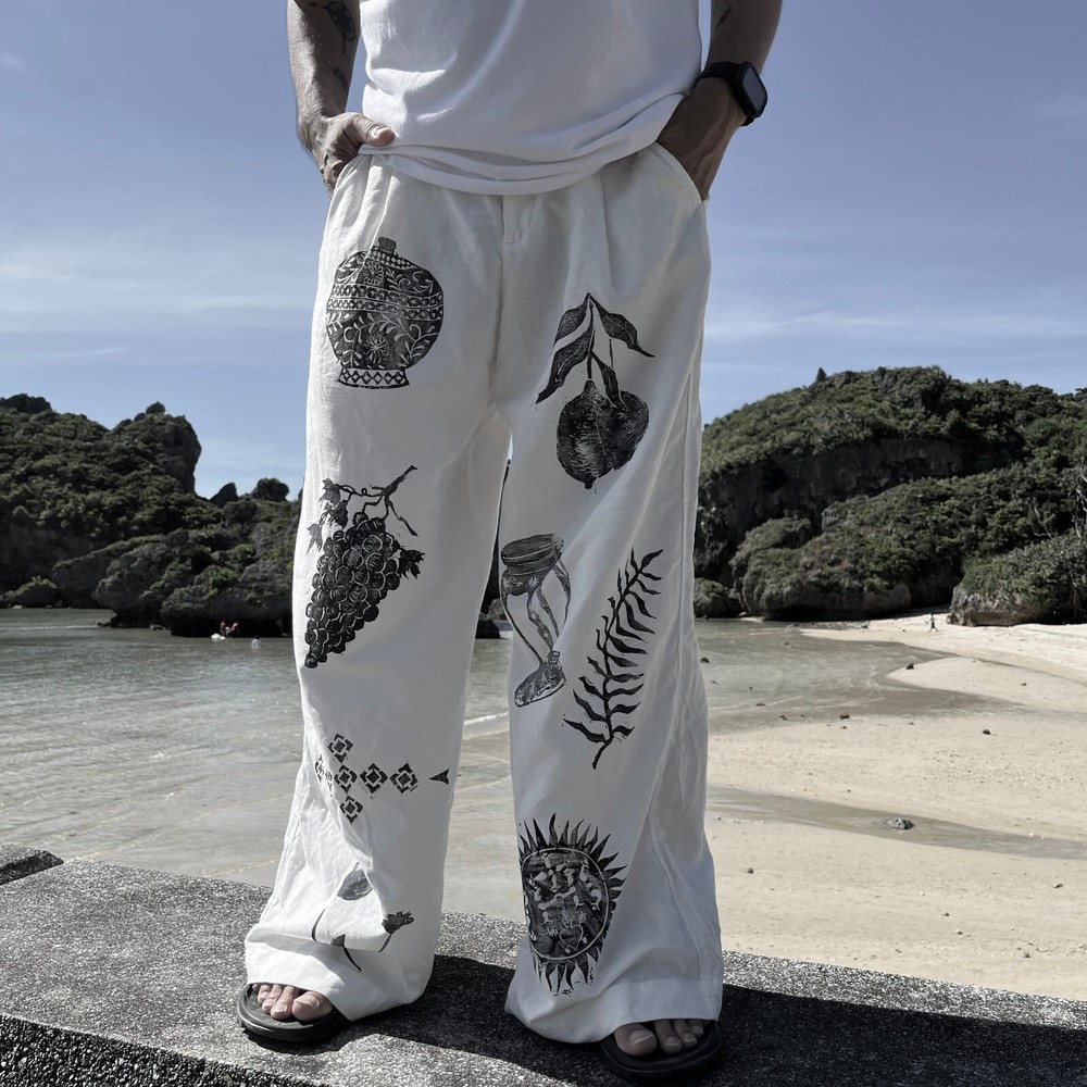 Love these breezy, wide-leg pants! The hand-printed Okinawa design is unique and vibrant, while the linen-cotton blend keeps them cool and comfortable. The unisex fit is roomy and flattering, perfect for summer. Shipping was prompt, and the quality exceeded expectations—great lightweight pants for casual outings or travel!