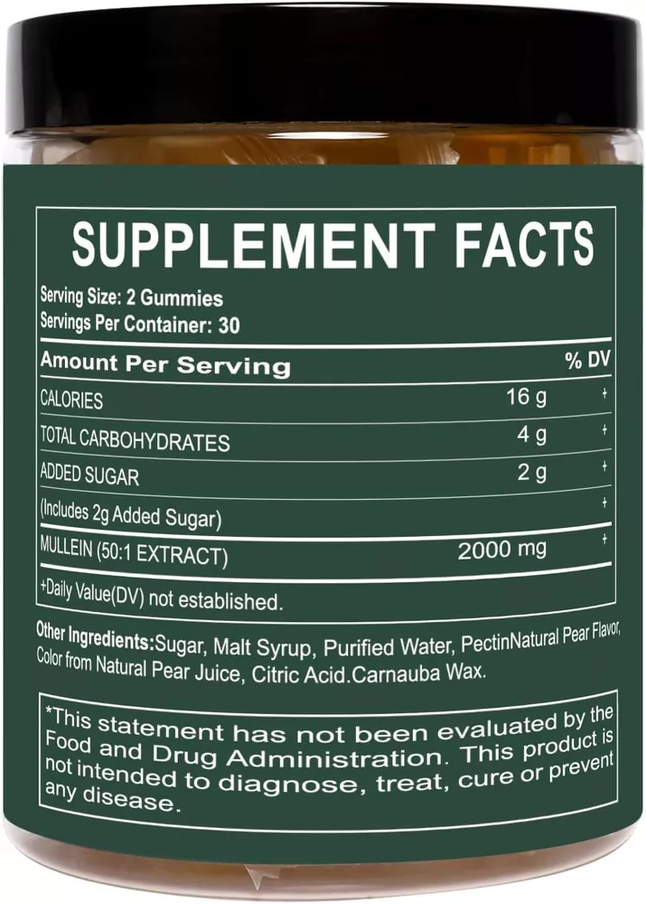 Descriptions: SUPERIOR POTENCY for Lung Support With 2000mg of Mullein, gummies are designed to provide optimal support for your respiratory health. Experience less congestion, easier breathing, and promote overall lung health. BREATHE BETTER: Experience the power of Mullein-enriched gummies, traditionally linked with respiratory well-being. It helps to clear mucus and congestion for easier breathing and is ideal for individuals frequently exposed to high pollution levels or those who are seeking extra support for their respiratory system. Premium & Delicious: We prioritize promoting a healthy lifestyle; unlike traditional maltose and xylitol, our fructose flavor comes from natural bromelain from fresh pineapple, which promotes healthy digestion and immune support for men and women. Pure Wellness, Naturally Enhanced: Our natural mullein gummies are made from pure, freshly picked mullein leaves and plant-based phytonutrient extracts; coupled with our advanced processing, the main active ingredients are carefully extracted. Who Is This For: Whether you smoke, have digestive issues, a weak immune system, want to train harder, walk farther, or maintain a healthy respiratory system; our mullein gummies are a great way to improve your overall health and wellness that you can easily incorporate into your daily routine. Package Included: 1 Bottle of 60 Mullein Gummies