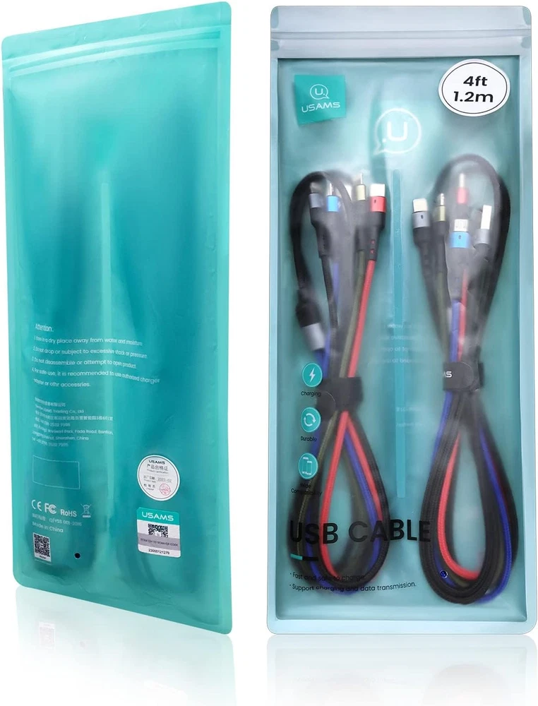 4 in 1 Charging Cables: One cable = four charging cables. State-of-the-art 4-in-1 design with 3 different USB ports. Including Dual iP, Micro USB and Type-C support to charger most of the usb c mobile phones available on market. Please Note it is just for charging not for sync date. usams Unique Design: Special indicator light design, best cable for charging at night. 4 feet/120cm Simple, lightweight, portable and convenient to carry this durable multiple cord with anywhere, perfect for home and office or travel. Durability: Material of Nylon braided and Aluminium Alloy, connector tested 10000+ times, never in worse connection. The high-quality aluminum housing makes the cable more durable and resistant to heat and corrosion. Ensure a longer service life. What You Get: 2pack black 4-in-1 cell phone charger cable. Suitable for many Occasions, with the 4FT length, the multi USB data line is most suitable for families, travel or work, business trips and other occasions. You don't need to carry more charging data cables, a mini 4-in-1 cable can satisfy all your charging devices. Product Description 2Pack usams original 4 in 1 Charger Cable -One cable for all devices! USAMS Multi Device Charging Cable with 4 Plugs - for Mini-USB + Type C + Micro USB is a perfect choice, especially if you or your family owns several phones with different ports. With just one cable, you can charge 4 devices at the same time. Save space and time! Special indicator light design, best cable for charging at night. With LED INDICATOR glowing when charging! Output: 5V/2A Length: 120cm (4ft) Material: Nylon Braided + Aluminium Alloy Packing Including: 2pack YOUSAMS 4 in 1 usb to usb c multi charger cable. Compatible with phone 14/14Pro / phone 13/13Pro Max / phone 12/12Pro/ 12 Pro Max/ phone 11/11Pro/ phone X /XXS /XS Max/XR/ 8/8 plus phone 7/7 plus/6s/ 6 plus, pad Air/ Air 2, Pad Pro, Pad mini Pod touch. Micro USB: For Most Android and Windows phones, tablets and many other devices including HTC / G4/G3/G2, LG V10, LG Optimus, LG Flex 2; for HTC One M8/M9/E8,One A9,One Remix,One/S/V/X/X+,HTC Desire 626/626S / GPS device. Moto G6 Play, Moto Turbo. For Wireless keyboards/Digital Cameras/Camcorders/Bluetooth Speakers/MP3 Players/Hard drives/Portable Charger/Windows notebooks/GPS devices Type-C port: For Samsung Galaxy S10 S10e S10+ Plus 5G S9 S9+ S8 Plus S9 Plus, Note 8 Note 9 Note10 Note10+ Plus 5G, A10e, Pixel 2 XL etc. New Book 2015, Book Pro 2016, ChromeBook Pixel 2015, Google Nexus 6P/5X, Huawei P9, Lumia 950, Lumia 950 XL and more. Please note: 1. Only Black IP port support charging and data transmission, but other ip, Micro and USB C port only support charging. (Before your purchase please kindly check your purchase store from "usams original"). 2. The maximum total output current of iP is 2.4A, Type-C is 3.0A and Micro-USB is 2.4A (For total, not for each end ) 3. We recommend using a faster charger /usb power adapter when charging Pad/phone or multiple devices. 4. These cables don't support quick charge, only provide normal charging speed. The actual charging speed is determined by the highest output that the wall charger can provide, you can charge multiple devices at the same time with a above 20W wall charger, particularly suitable for family or guests. Specification of Related Products Add to Cart Add to Cart Add to Cart Add to Cart Add to Cart Add to Cart Add to Cart Customer Reviews 4.3 out of 5 stars 146 4.4 out of 5 stars 1,099 4.2 out of 5 stars 1,260 4.0 out of 5 stars 444 4.3 out of 5 stars 146 4.3 out of 5 stars 109 4.5 out of 5 stars 15,660 Price $19.99 $ 19 . 99 $14.99 $ 14 . 99 $14.99 $ 14 . 99 $18.45 $ 18 . 45 $22.99 $ 22 . 99 $23.99 $ 23 . 99 $11.19 $ 11 . 19 Color Selection Black Purple Black, Green, multi-corlor Black White, Black Black Purple Black multi-corlor Length 4ft, 6.6ft 4ft, 6.6ft 4ft, 6.6ft 4ft, 6.6ft 4ft, 6.6ft 4ft, 6.6ft 1ft,4ft,10ft Quantity 1pack 1pack 1pack 1pack 1pack 1pack 2pack Samsung Fast Charging ✔ ✔ ✔ ✔ ✔ ✔ ✘ connector type Micro USB, USB Type C Micro USB, USB Type C USB, USB Type C Micro USB, USB Type C Micro USB, USB Type C Micro USB, USB Type C Micro USB, USB Type C compatible devices Tablet, Laptop, Smartphone Tablet, Laptop, Smartphone Tablet, Laptop, Smartphone Tablet, Laptop, Smartphone Tablet, Laptop, Smartphone Tablet, Laptop, Smartphone Smartphone