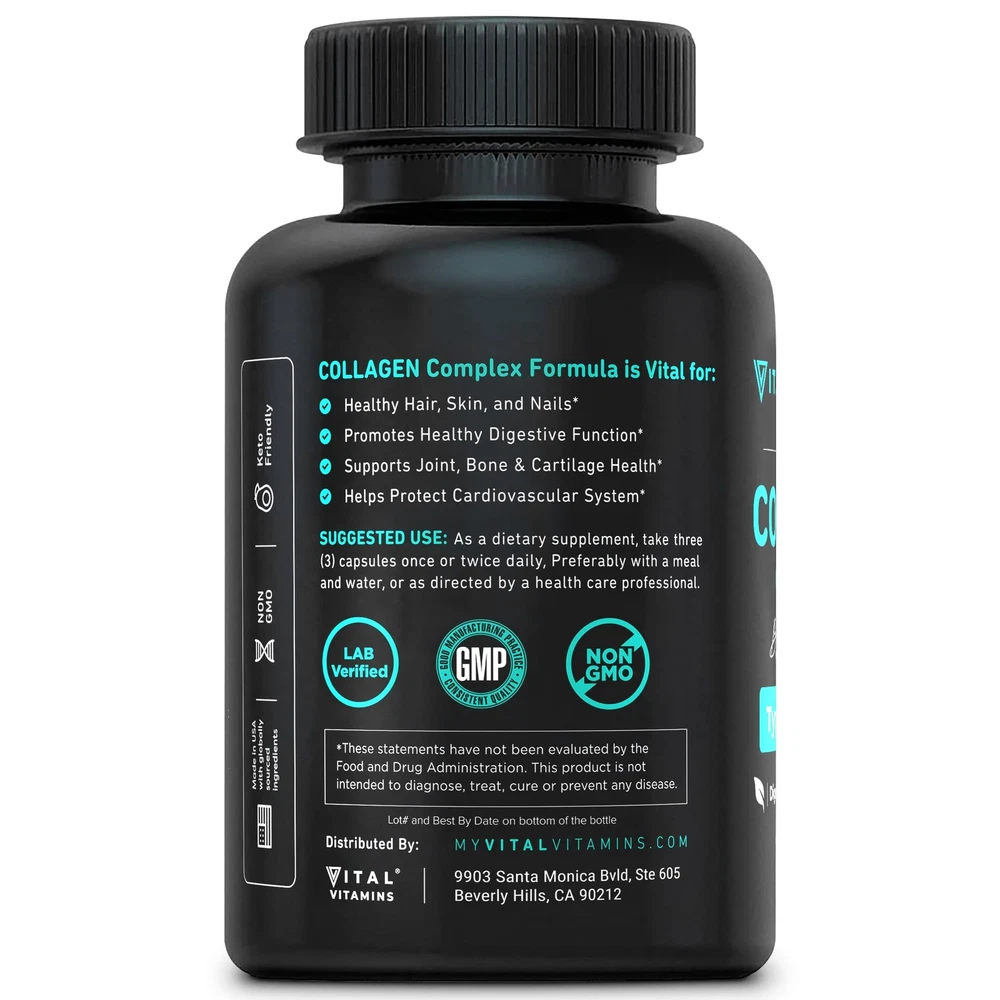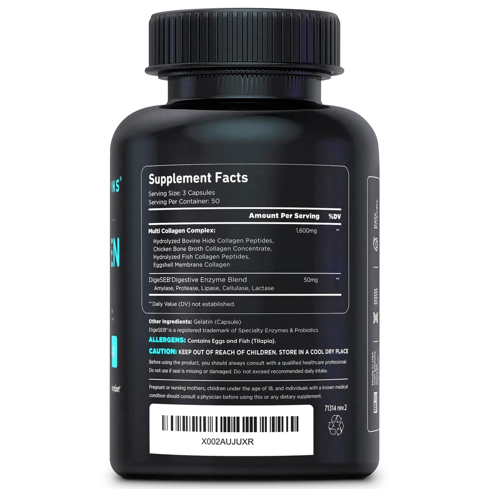 Collagen Capsules 2-pack, 150 capsules each bottle. Complete Collagen Supplements: Discover the ultimate collagen solution with our multi collagen complex. Packed with hydrolyzed collagen peptides from bovine, marine, chicken bone broth, & eggshell membrane sources, our pills deliver I, II, III, V, & X collagen. Revitalize Inside Out: Combat the effects of collagen depletion with our potent formula. Formulated with 5 types of collagen, our pills promote enhanced skin, hair, nails, bones, tendons, joints, & gut health. Experience vitality & renewed radiance. Youthful Renewal: Unlock the secret to ageless beauty. Collagen regeneration stimulates the body to renew tissues & maintain a radiant skin complexion. Restore your youth with easy-to-swallow Multi Collagen capsules for both men and women. Advanced Absorption: Elevate your collagen intake with our high-absorption pills. Each collagen capsule is enriched with Digeseb for superior absorption. A convenient alternative to powder or liquid, these compact pills are perfect for on-the-go use. Holistic Support: Elevate your wellness journey with our Multi Collagen Complex, a powerhouse of benefits for hair, skin, & nails. Crafted with precision, our non-GMO, hormone-free capsules are your go-to solution for supporting overall health.