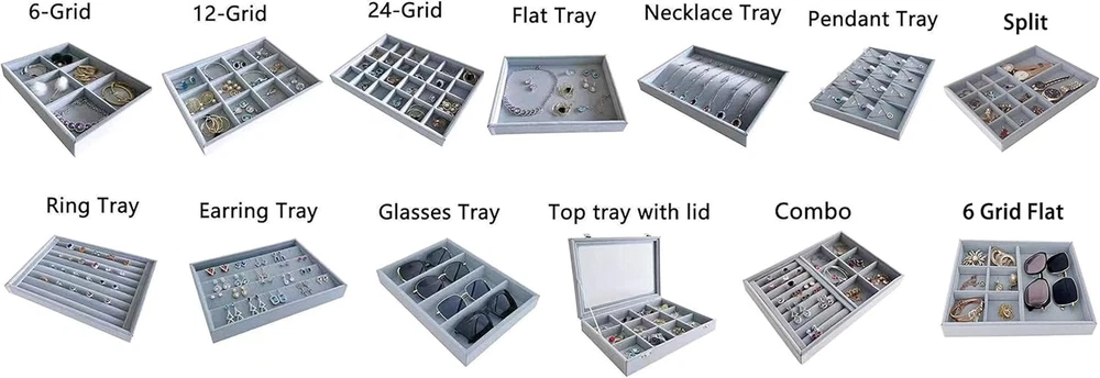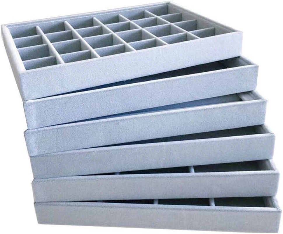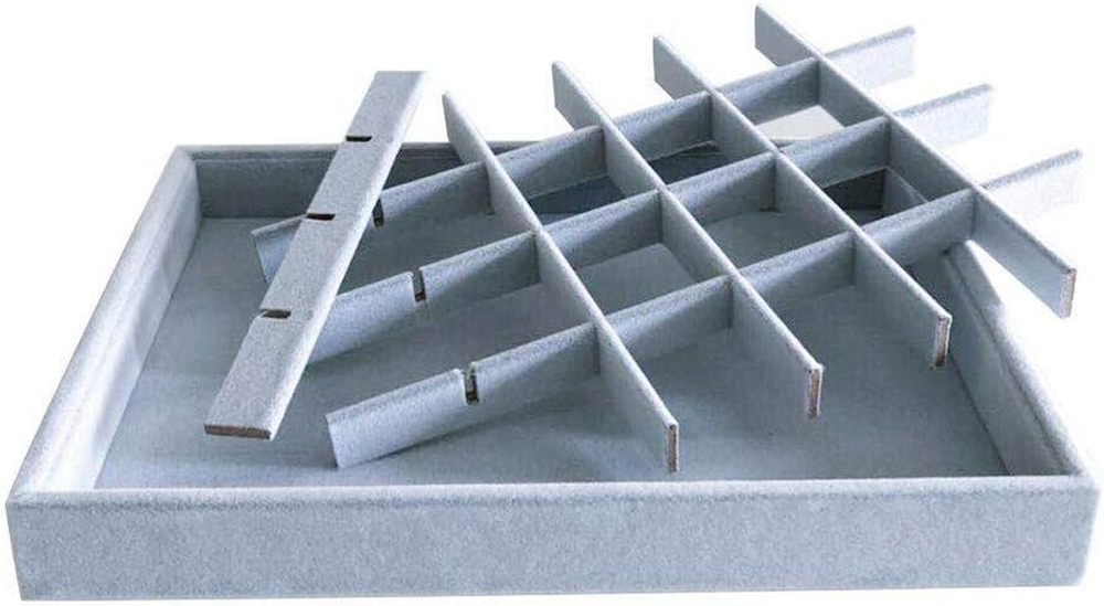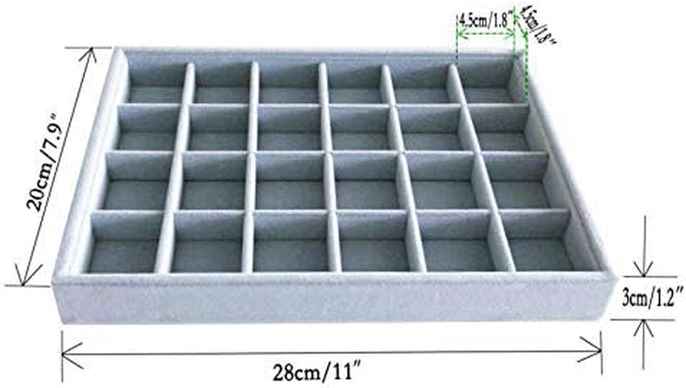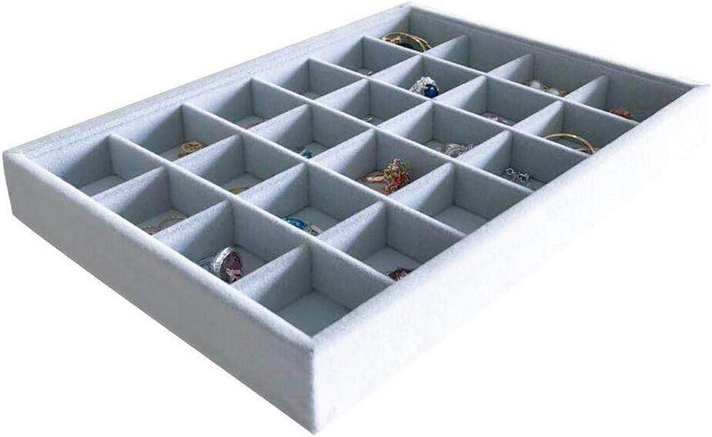 Style: Classic, Elegant Item model number: 105 Type: Does not apply Number of Drawers: 24 Number of Compartments: 24 UPC: 744110094633 Special Feature: Stackable, Premium Grade Quality, Removable grids Country of Origin: China Shape: Rectangular Finish Type: Textured Jewelry Storage Type: Jewelry Tray Size: 24-Grid Color: gray Finish: Textured Product Dimensions: 7.9"D x 11"W x 1.2"H Special Features: Stackable, Premium Grade Quality, Removable grids Batteries Required?: No Is Discontinued By Manufacturer: No Brand: Does not apply Occasion: Christmas, Anniversary, Birthday Material: velvet Recommended Uses For Product: Jewelry, Collectibles Batteries Included?: No Item Weight: 10.2 ounces gtin13: 744110094633 Number of Items: 1 Included Components: tray