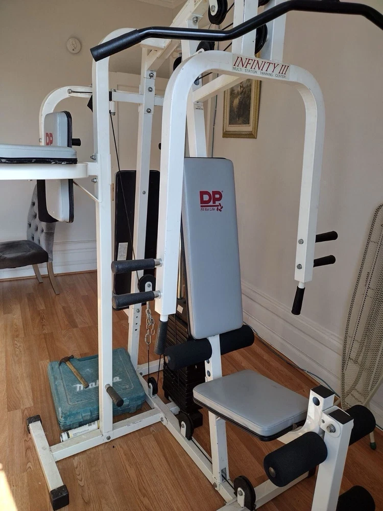 Type: Home Gym Usage: Home Use Sport/Activity: Gym & Training, Weight Lifting, Strength Training Stations: Leg Curl, Dip Station, Chest Press, Leg Extension, Weights, Bench Press, Shoulder Press, Lat Pull Down Brand: infinity Model: Multi Station Training Center INFINITY III
