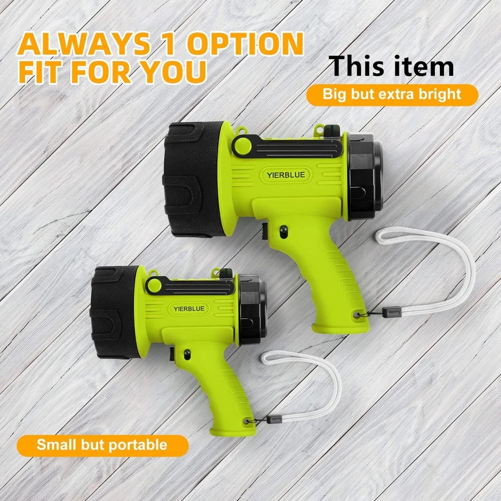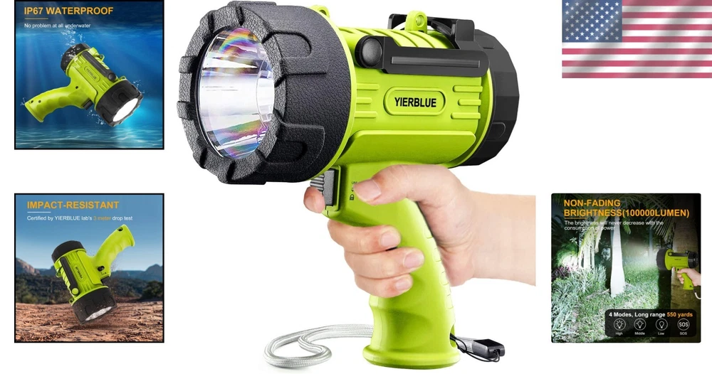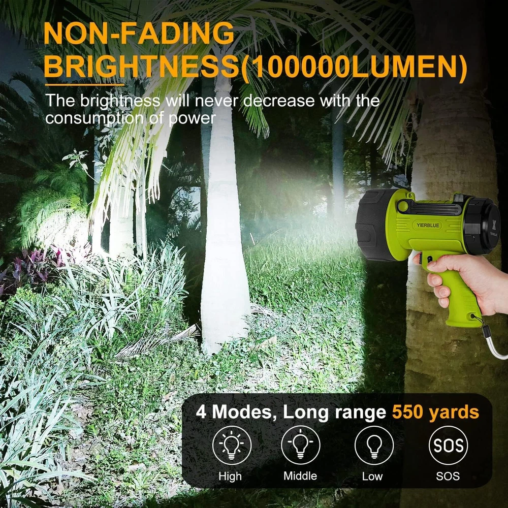 Special Features: Durability White Brightness: 1000000 Lumens Light Source Type: Led Color: Fluorescent-Pro Batteries: 2 Lithium Polymer Batteries Required. (included) IP Rating: IP67 gtin13: Does Not Apply Water Resistance Level: Waterproof Features: Batteries Included, Rechargeable, Impact Resistant, Waterproof, Hands-free, Detachable Filter Runtime: 3 Hours Included Components: Batteries Included Lumens: 1000000 Bulb Shape Size: Ed17 Product Dimensions: 4.5"d X 8.1"w X 8.1"h Batteries Required?: Yes Item Weight: 680 grams Material: ABS Battery Description: Lithium Battery Cell Composition: Lithium Voltage: 3.7 volts Special Feature: Durability Brightness: 100000 Lumen Battery Technology: Lithium Polymer Batteries Included?: Yes Number of Lights: 1-3 Number of LEDs: Not provided Style: Searchlight" Or "handheld Number of Batteries: 2 Operating Range: 550 yards UPC: Does Not Apply Brand: Unbranded Operating Time: 3-10 Hours Type: Flashlight Recommended Uses For Product: Working, Camping, Boating, Hunting Lighting Technology: LED Light Path Distance: 550 Yards Personalize: No Item Package Quantity: 1 Power Source: Battery