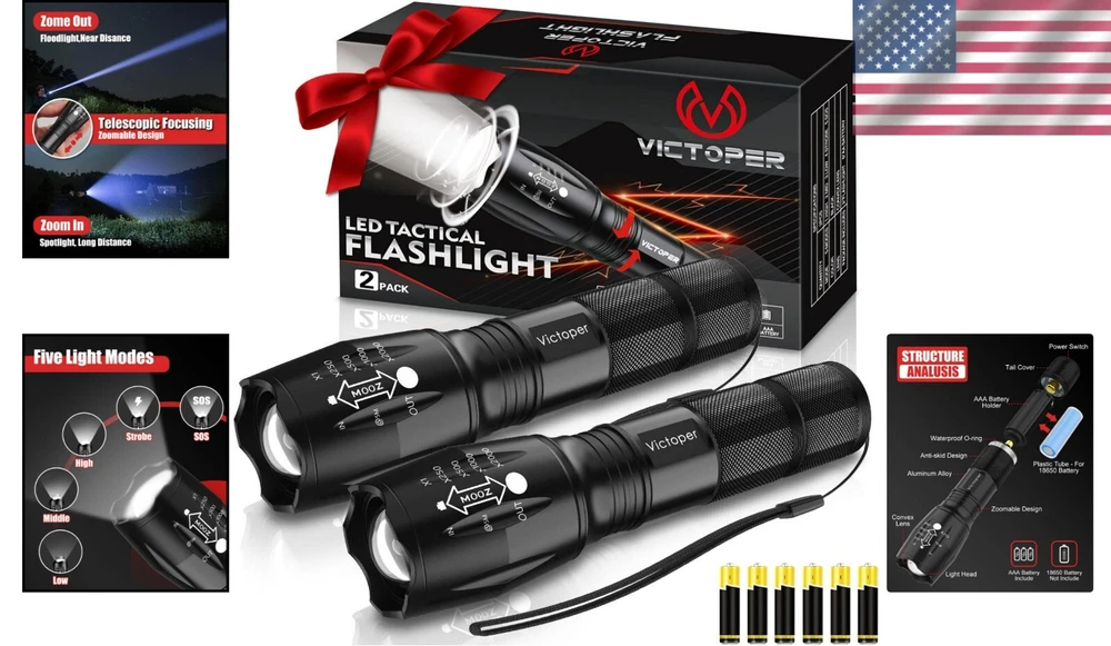 Multi-Mode Tactical Flashlight 2 Pack - 2000 Lumen with Batteries Included ‹ › ‹ › ‹ › ‹ › ‹ › ‹ › ‹ › ‹ › ‹ › Multi-Mode Tactical Flashlight 2 Pack -Ultra-Powerful Brightness: 2000 Lumen with Batteries Included Features: Illuminate your path with an astonishing 2000 lumens, reaching up to 656 feet. Remarkable lifespan of over 50,000 hours for long-lasting illumination. Weather-resistant design allows for use in extreme rain, sun, and freezing temperatures. Five selectable modes: Low, Medium, High, SOS, and Strobe, adaptable for any situation. Adjustable focus for switching between spot and flood beams. Crafted from premium aircraft-grade alloy with a type 3 hard-anodized anti-abrasive coating for maximum durability. Waterproof, dustproof, and wear-resistant properties ensure longevity. Includes 6 AAA batteries and a battery case for convenience upon receiving the product. Benefits: Ultra-bright illumination for safety and visibility in all conditions. Versatile functionality for camping, hiking, cycling, and emergency situations. Durable construction guarantees performance and reliability. Immediate use with included batteries enhances readiness for emergencies. The perfect gift for outdoor enthusiasts and those in need of reliable lighting solutions. Why choose our Multi-Mode Tactical Flashlight? Find yourself navigating through darkness or unexpected situations with confidence, thanks to our Multi-Mode Tactical Flashlight 2 Pack. Delivering an impressive 2000 lumens, this flashlight is designed not only for brightness but resilience against the elements. With adjustable focus and multiple modes, it adapts seamlessly to your needs, whether you're embarking on an adventurous hike or dealing with a power outage at home. Gift this practical and stylish flashlight to your loved ones and ensure they are always prepared for the unexpected. Its durable construction and handy accessories make it an essential tool for anyone who loves the great outdoors. Light up your world or someone else's—order yours today! Shipping Free & Fast Shipping - We offer free shipping to most of the USA with a normal delivery time of 3-7 days. However, due to the current situation, additional delivery time (up to 3 weeks) may be required for some items. Alternative Carriers - We may use alternative carriers (e.g. USPS, FedEx, UPS, etc.) to ensure your package arrives safely and on time. Due to the use of multiple carriers, we are unable to provide a tracking number automatically. Handling Time - Orders are processed and shipped within 1-2 business days of receiving cleared payment. Shipping Restrictions - Shipping to Alaska, Hawaii, Puerto Rico, Guam, and other US territories may incur shipping charges or delivery restrictions. Please contact us before ordering, or your order can be refunded/cancelled. State Restrictions - There may be restrictions based on your state of purchase. For example, certain items may not be shipped to California due to state regulations. Contact for Tracking Updates - If you require tracking updates or have any concerns about the delivery of your order, please feel free to contact us, and we will be happy to assist you. Return 30-Day Hassle-Free Returns - We want you to be completely satisfied with your purchase. If you are not, you can return the item within 30 days of receiving it for a full refund or exchange. Easy Return Process - To start a return, simply contact us and we will provide you with a prepaid return shipping label and detailed instructions. Restocking Fee - There are no restocking fees for returns. However, the buyer is responsible for return shipping costs if the return is not due to a seller's error. Refund Processing Time - Refunds will be processed within 5 business days of receiving the returned item in its original condition. Payment We accept all major credit cards, PayPal, and Apple Pay for your convenience. Your payment information is secure and encrypted to ensure a safe and seamless transaction. Please complete your payment within 3 days of purchase to avoid any delays in shipping. Feedback Your feedback is extremely important to us. We strive to provide the best products and customer service possible. If you are satisfied with your purchase, please take a moment to leave us a positive review. If you have any concerns or issues with your order, please contact us before leaving negative feedback. We are committed to resolving any problems and ensuring your satisfaction. Contact Us If you have any questions or concerns, please feel free to reach out to our customer support team. You can contact us through the eBay messaging system. We are available Monday to Friday, 9:00 am to 5:00 pm EST, and we will do our best to respond to your inquiry within 24 hours. Buy it now and enjoy a pleasant shopping experience! UPC: Not Set Voltage: 9 volts Item Height: LED Flashlight Item Length: LED Flashlight Item Weight: 5 ounces Item Width: Not Set Model: Not Set Lumens: 2000 lumens Number of LEDs: Not Set Unit Quantity: 2 pack Material: Aluminum,aircraft-grade alloy,type 3 hard-anodized coating,anti-abrasive coating Features: Batteries Included,long range,adjustable light modes,high power,adjustable focus,impact resistant,waterproof,dustproof,wear-resistant Brand: Unbranded Type: Flashlight Lighting Technology: LED Power Source: Battery Operating Range: 656 feet MPN: Not Set Number of Batteries: 6 Battery Technology: AAA Color: Black Country/Region of Manufacture: Not Set Operating Time: More Than 10 Hours IP Rating: Not Set Number of Lights: 1-3 Unit Type: oz Personalize: Not Set