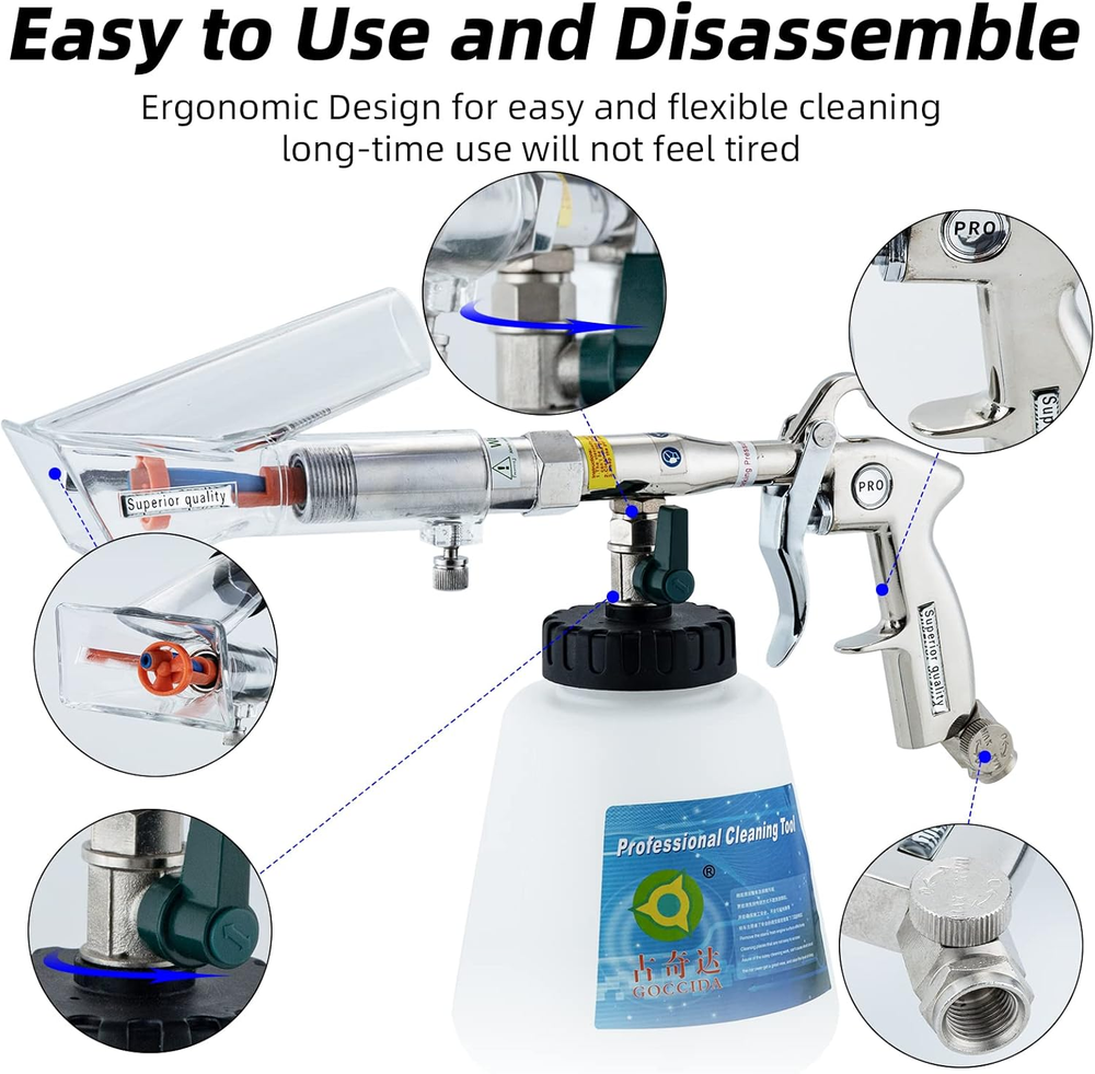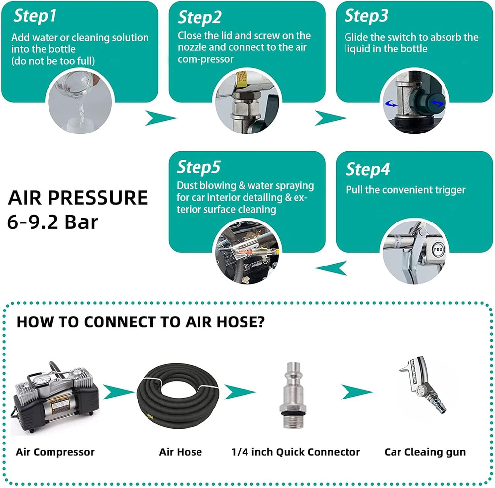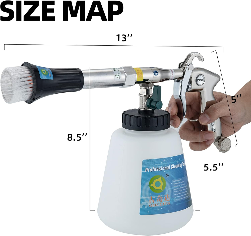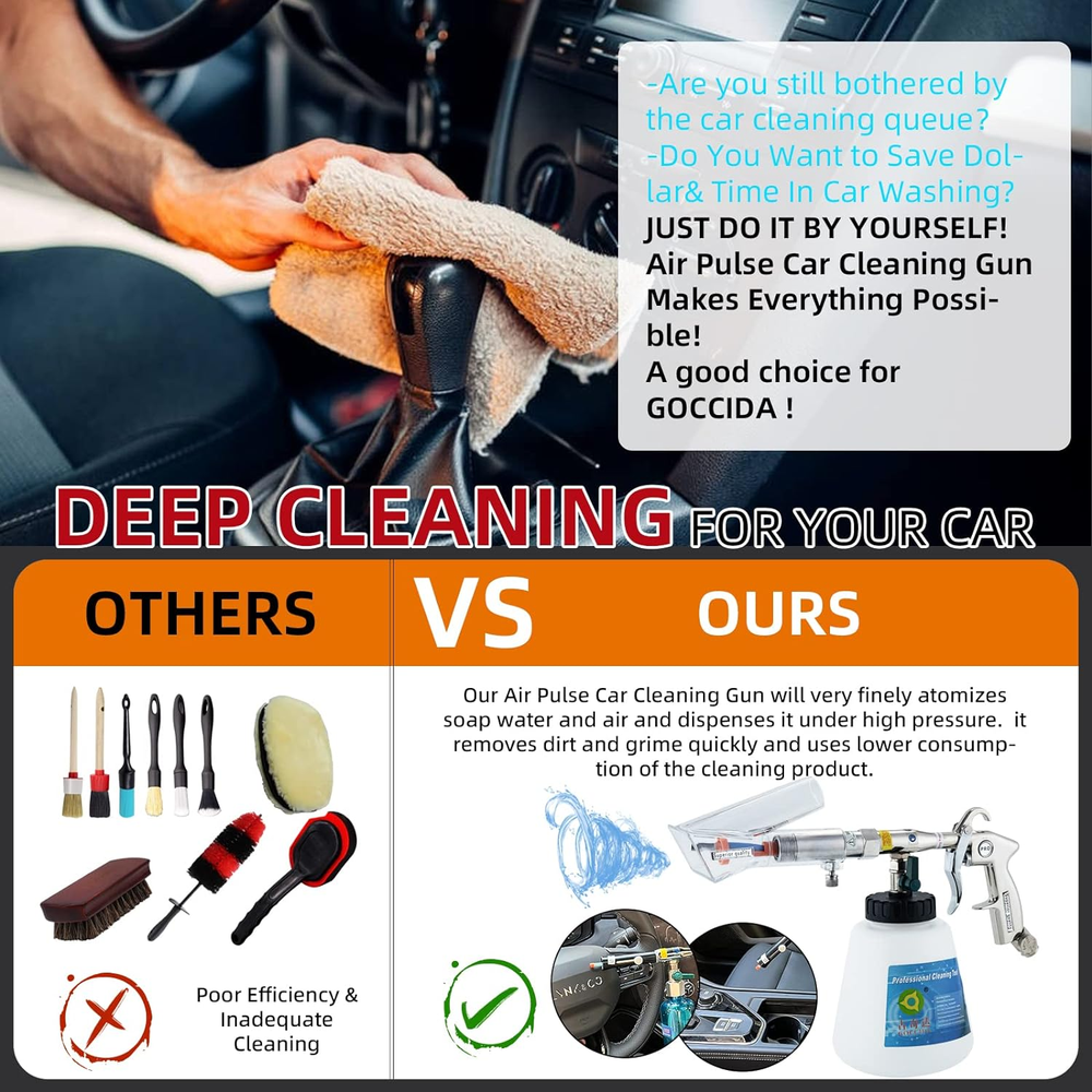 Store New Arrivals Add to Favorite View Feedback Contact Car Cleaning Kit Multi-Purpose Cleaning Gun Detachable Sprinkler Head for Car Interior Plush Toy Blanket Cleaning Works with Air Compressor Description Item model number A-Kit-All Color A-Kit-1 Brand GOCCIDA Country of Origin China Manufacturer Part Number A-Kit-1 Item Weight 3.1 pounds Product Dimensions 1 x 1 x 1 inches Manufacturer GOCCIDA Features: Multi-purpose Car cleaning Gun can be used for car interior or exterior cleaning tools including door stoppers, wool/leather car upholstery, cup holders, dashboards, consoles, shifters, steering wheel door panels, carpets, floor MATS, seat belt pullers, wheel tire surfaces and more. It can also be used for plush toys, curtains, sofas, etc Collocation Method: High air pressure with long hair brush cleaning can clean the stains in small gaps. The cooperation of vacuum cleaner and air pump, wash while sucking, gun head with brush cleaning car more easily. High strength with the conversion of suction interface can be more cleaning replacement, saving time and effort Advanced high-pressure cleaning tools, which need to be used in conjunction with the air compressor, can quickly clean the car. Cleaning a car takes only four steps. 1. Add clean water or cleaning solution; 2. Connect the pump; 3. Sliding switch; Press the trigger to start cleaning, which is easier and faster than using a small brush or cotton swab Material: Aluminum alloy gun body, stainless steel trigger, PP plastic pot body, nylon long tube, PC material suction hood, stainless steel screws Package Include:Multifunctional vacuumable air cleaning gun * 1pcs, 40cm nylon long tube * 1pcs, Vacuum cleaner interface * 3pcs, Detachable long hair brush * 1pc, PC material suction and washing head cover* 1pc Product Description GOCCIDA 2IN1 Air Blow Gun &vacunm Gun(Upgrade Rotate Tube) 45°Beveled design Brush, Easy to Operate and touch corner-and-crevice dirt with ease High Pressure 6-9.2Bar Car Cleaning Gun Extra Vacuuming Function and Air Adjustable Valve,More Comfortable to Use car detailing products. Different from the oscillating tip, Our hot-wheel like tip, more durable,could spray water evenly to clean deeply GOCCIDA Car Cleaning Gun Tornado Black Air Blow Car Detail Cleaner Kit The video showcases the product in use. The video guides you through product setup. The video compares multiple products. The video shows the product being unpacked. ABOUT US We offer the best prices around on high quality products. Our E-store includes media such as books, movies, music and games while offering electronics, toys, sporting apparel, clothing, tools, general home, garden items and more. SHIPPING We are always working hard to ensure your package arrives as soon as possible. Please understand that some factors like weather, high postal traffic, and the performance of shipping companies are outside of our control. We offer free shipping to the lower 48 states and ship within 2 business days of payment, usually sooner. We do not accept P.O. Boxes. Please provide a physical address. RETURNS We offer a 30-Day Return Policy on items which you are not completely satisfied with. You have the option for a full-refund or an exchange of the item. No returns are available on items shipped outside of the USA. PAYMENT We accept PayPal. CONTACT US This page content is yet to come Please ad us to your favorite seller and visit again later Thank You CUSTOMER SATISFACTION We try our very best to make sure every customer is completely satisfied. If there's a problem, message us! We're happy to help.