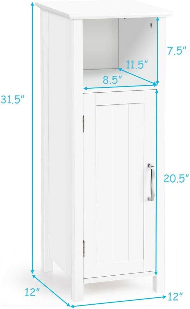 Product Description About this item • Multiple Storage Space: Frequently used bath essentials, such as toilet paper, towels, are able to be put in the doorless storage space of this floor cabinet for easy access. In the meantime, infrequently used items, like detergent, brushes, cleanser, are better to be stored behind the door, kept away from moisture. If you decide to use it as a side cabinet, then you can place album or other artworks on the top of the cabinet for displaying. • Compact Yet Practical Design: Measured 12” x 12” x 31.5” in size, this bathroom cabinet is absolutely great for small limited places. It won’t take much space in the room and will also add lengthwise storage space for storing more items to make the room appear tidier. Moreover, it allows you to install the anti-toppling fitting to the bathroom floor cabinet to avoid accidental toppling. If you happen to be in need of a floor cabinet with such size, ours would be your optimal choice. • Adjustable Shelf for Flexible Storage: The inner shelf is adjustable in three positions according to your preference, making the height of the storage space change with different shelf setting, allowing maximum space usage. • Easy to Assemble and Maintain: With the enclosed step by step instruction and necessary hardware, it is easy for you to have the bathroom floor cabinet installed in no time. Thanks to its smooth lacquered surface, it is convenient to clean and remove stains. • GLACER Promise: We proudly stand behind of this bathroom floor cabinet. If for any reason you are not satisfied with our floor cabinet, please contact us for solution and we are committed to making things right for you. We will respond within 24 hrs by offering feasible suggestion until problem is solved. Specification Color: White Material: MDF Net weight: 19 lbs Product dimensions: 12” x 12” x 31.5” (L x W x H) Weight capacity of each tier: 66 lbs Package includes: 1 x Bathroom storage cabinet 1 x Instruction Floor Storage Cabinet Ideal Storage Solution for Home Sicked of staying in a disordered room? Our exquisite and practical bathroom floor cabinet would be a right choice for you to start to own a tidy and clean room. With its chic and elegant appearance, it can also be used as a side cabinet to whether place it in the living room, adding a touch of elegance without any doubt! Features Minimalist yet practical design, matching most home decor Ample storage space, ideal for storing bath essentials, first aid kit, soaps, etc. Constructed of superior P2 MDF, assuring durability, stability, great load-bearing capacity Adjustable inner shelf for flexibility, storing things of different heights freely An open shelf for fetching daily toiletries easily Lacquered surface designed to withstand the humidity, making it suitable for bathrooms Ideal for bathroom, living room, kitchen, entryway, hotel, inns Easy to assemble with detailed instruction and enclosed hardware set On Aug 14, 2025 at 21:37:35 PDT, seller added the following information: