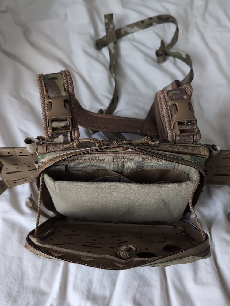 This has been setup and put together, but never tested or used in any environment. The inner retention panel is slightly used. That's it though, it's going to be used. This entire setup MSRPs for $355.00. The Modular Chest Rig-Kit Bag by FullTang Tactical is one of the most versatile pieces of gear you will ever find - truly blurring the lines between bushcraft and tactical. Whether you are hiking, hunting, fishing, or running tactical drills - this kit fully converts from a hiking day pack, to a stand-alone chest rig, to a placard for a plate carrier on the fly because of the built-in rear kangaroo pocket opening. It is made with the highest quality MIL-SPEC materials such as Squadron™ laminate, waterproof YKK AquaGuard® zippers, and water-repellent 500D CORDURA® for superior weather protection and durability. The upgraded shoulder H-harness is made of durable laminate with side routing slots and holes to run shock cord/comms cables. D-rings on the back allow connection to load-bearing belt systems or attachment of carabiners, fly fishing nets, etc.